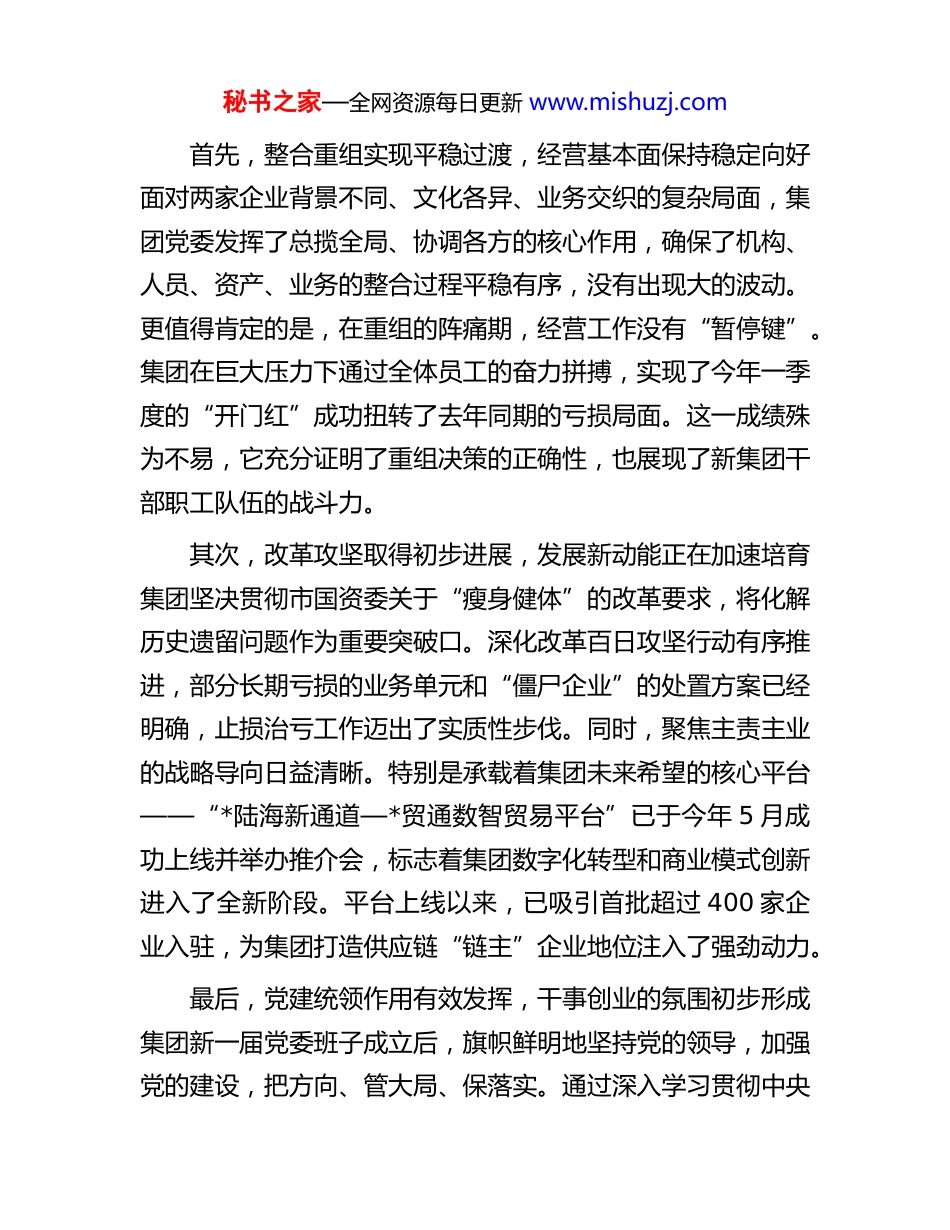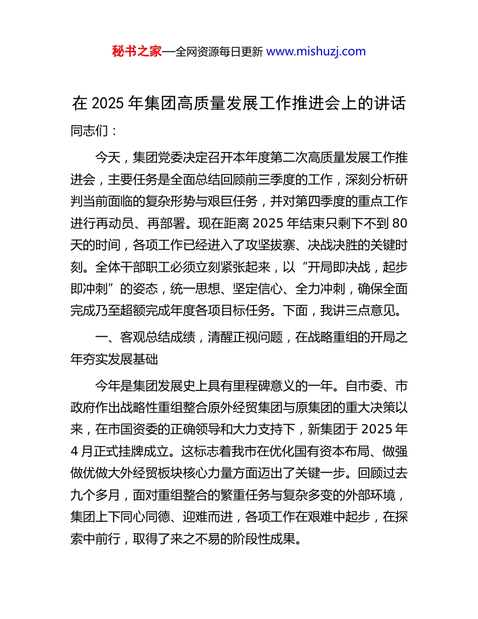 秘书之家—全网资源每日更新 www.mishuzj.com在 2025 年集团高质量发展工作推进会上的讲话同志们:今天,集团党委决定召开本年度第二次高质量发展工作推进会,主要任务是全面总结回顾前三季度的工作,深刻分析研判当前面临的复杂形势与艰巨任务,并对第四季度的重点工作进行再动员、再部署。现在距离 2025 年结束只剩下不到 80天的时间,各项工作已经进入了攻坚拔寨、决战决胜的关键时刻。全体干部职工必须立刻紧张起来,以“开局即决战,起步即冲刺”的姿态,统一思想、坚定信心、全力冲刺,确保全面完成乃至超额完成年度各项目标任务。下面,我讲三点意见。一、客观总结成绩,清醒正视问题,在战略重组的开局之年夯实发展基础今年是集团发展史上具有里程碑意义的一年。自市委、市政府作出战略性重组整合原外经贸集团与原集团的重大决策以来,在市国资委的正确领导和大力支持下,新集团于 2025 年4 月正式挂牌成立。这标志着我市在优化国有资本布局、做强做优做大外经贸板块核心力量方面迈出了关键一步。回顾过去九个多月,面对重组整合的繁重任务与复杂多变的外部环境,集团上下同心同德、迎难而进,各项工作在艰难中起步,在探索中前行,取得了来之不易的阶段性成果。秘书之家—全网资源每日更新 www.mishuzj.com首先,整合重组实现平稳过渡,经营基本面保持稳定向好面对两家企业背景不同、文化各异、业务交织的复杂局面,集团党委发挥了总揽全局、协调各方的核心作用,确保了机构、人员、资产、业务的整合过程平稳有序,没有出现大的波动。更值得肯定的是,在重组的阵痛期,经营工作没有“暂停键”。集团在巨大压力下通过全体员工的奋力拼搏,实现了今年一季度的“开门红”成功扭转了去年同期的亏损局面。这一成绩殊为不易,它充分证明了重组决策的正确性,也展现了新集团干部职工队伍的战斗力。其次,改革攻坚取得初步进展,发展新动能正在加速培育集团坚决贯彻市国资委关于“瘦身健体”的改革要求,将化解历史遗留问题作为重要突破口。深化改革百日攻坚行动有序推进,部分长期亏损的业务单元和“僵尸企业”的处置方案已经明确,止损治亏工作迈出了实质性步伐。同时,聚焦主责主业的战略导向日益清晰。特别是承载着集团未来希望的核心平台——“*陆海新通道—*贸通数智贸易平台”已于今年 5 月成功上线并举办推介会,标志着集团数字化转型和商业模式创新进入了全新阶段。平台上线以来,已吸引首批超过 400 家企业入驻,为集团打造供应链“链主”企业地位注入了强劲动力。最后,党建统领作用有效发挥,干事创业的氛围初步形成集团新一届党委班子成立后,旗帜鲜明地坚持党的领导,加强党的建设,把方向、管大局、保落实。通过深入学习贯彻中央秘书之家—全网资源每日更新 www.mishuzj.com八项规定精神等系列主题教育活动,干部的纪律意识和规矩意识得到增强。面对改革中的难点、痛点,一批党员干部能够冲锋在前,展现了应有的担当。在肯定成绩的同时,更要以“吾日三省吾身”的态度,清醒地认识到当前存在的突出问题和严峻挑战。这些问题不解决,高质量发展就是一句空话。一是思想认识仍需进一步统一,改革共识尚需凝聚。重组后,部分干部职工依然存在“等、靠、要”的惯性思维,对市场化改革的残酷性和紧迫性认识不足。对于新集团的战略目标、发展路径,一些同志的理解还停留在表面,在行动上未能真正对标对表,存在“新瓶装旧酒”的现象。二是改革重组任务依然艰巨,财务模型极不稳定。必须清醒地看到,一季度的微利是在特定条件下实现的,并不代表集团已经走出了困境。截至今年 3 月末,集团总资产为 167.25亿元,但资产负债率仍高达 73.66%。原*外经贸集团高达99.5%的历史负债率所带来的巨大债务压力尚未完全化解,“止损治亏”“资产盘活”“债务接续”三大攻坚战才刚刚开始,每一项都是难啃的硬骨头。三是主责主业聚焦度不高,核心竞争力亟待加强。集团目前集成的业务组合庞杂,涵盖了贸易、能源、物流、电力甚至部分房地产业态资源配置分散,未能形成拳头优势。在外贸主业领域,传统的商业模式利润微薄,对“*贸通”等新平台的赋能力度还不够,距离打...