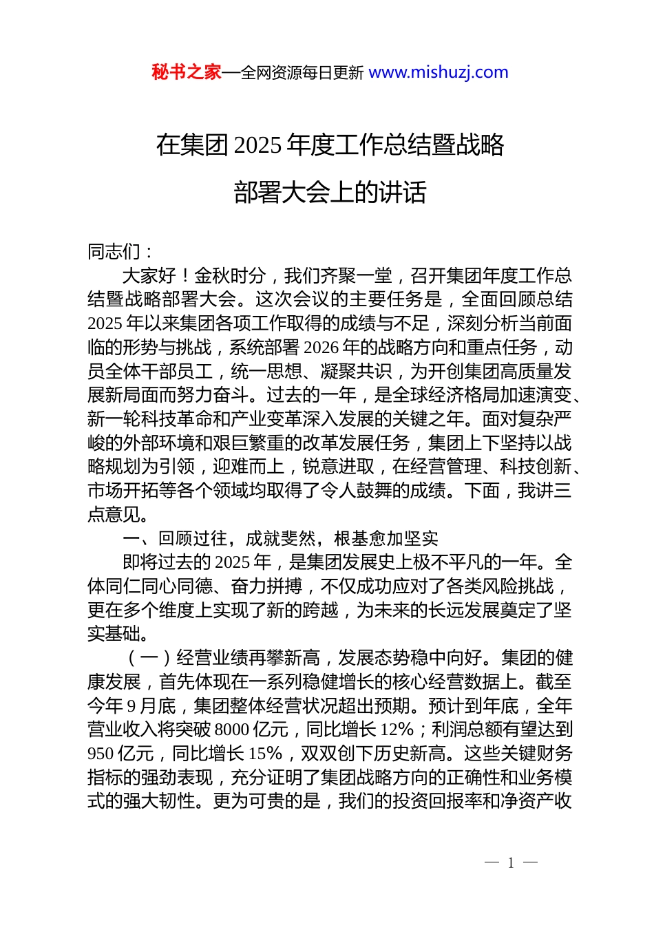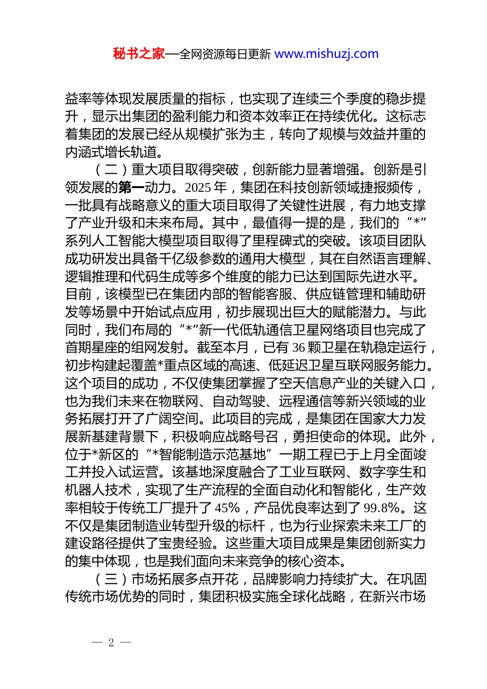 秘书之家—全网资源每日更新 www.mishuzj.com在集团 2025 年度工作总结暨战略部署大会上的讲话同志们:大家好!金秋时分,我们齐聚一堂,召开集团年度工作总结暨战略部署大会。这次会议的主要任务是,全面回顾总结2025 年以来集团各项工作取得的成绩与不足,深刻分析当前面临的形势与挑战,系统部署 2026 年的战略方向和重点任务,动员全体干部员工,统一思想、凝聚共识,为开创集团高质量发展新局面而努力奋斗。过去的一年,是全球经济格局加速演变、新一轮科技革命和产业变革深入发展的关键之年。面对复杂严峻的外部环境和艰巨繁重的改革发展任务,集团上下坚持以战略规划为引领,迎难而上,锐意进取,在经营管理、科技创新、市场开拓等各个领域均取得了令人鼓舞的成绩。下面,我讲三点意见。一、回顾过往,成就斐然,根基愈加坚实即将过去的 2025 年,是集团发展史上极不平凡的一年。全体同仁同心同德、奋力拼搏,不仅成功应对了各类风险挑战,更在多个维度上实现了新的跨越,为未来的长远发展奠定了坚实基础。(一)经营业绩再攀新高,发展态势稳中向好。集团的健康发展,首先体现在一系列稳健增长的核心经营数据上。截至今年 9 月底,集团整体经营状况超出预期。预计到年底,全年营业收入将突破 8000 亿元,同比增长 12%;利润总额有望达到950 亿元,同比增长 15%,双双创下历史新高。这些关键财务指标的强劲表现,充分证明了集团战略方向的正确性和业务模式的强大韧性。更为可贵的是,我们的投资回报率和净资产收— 1 —秘书之家—全网资源每日更新 www.mishuzj.com益率等体现发展质量的指标,也实现了连续三个季度的稳步提升,显示出集团的盈利能力和资本效率正在持续优化。这标志着集团的发展已经从规模扩张为主,转向了规模与效益并重的内涵式增长轨道。(二)重大项目取得突破,创新能力显著增强。创新是引领发展的第一动力。2025 年,集团在科技创新领域捷报频传,一批具有战略意义的重大项目取得了关键性进展,有力地支撑了产业升级和未来布局。其中,最值得一提的是,我们的“*”系列人工智能大模型项目取得了里程碑式的突破。该项目团队成功研发出具备千亿级参数的通用大模型,其在自然语言理解、逻辑推理和代码生成等多个维度的能力已达到国际先进水平。目前,该模型已在集团内部的智能客服、供应链管理和辅助研发等场景中开始试点应用,初步展现出巨大的赋能潜力。与此同时,我们布局的“*”新一代低轨通信卫星网络项目也完成了首期星座的组网发射。截至本月,已有 36 颗卫星在轨稳定运行,初步构建起覆盖*重点区域的高速、低延迟卫星互联网服务能力。这个项目的成功,不仅使集团掌握了空天信息产业的关键入口,也为我们未来在物联网、自动驾驶、远程通信等新兴领域的业务拓展打开了广阔空间。此项目的完成,是集团在国家大力发展新基建背景下,积极响应战略号召,勇担使命的体现。此外,位于*新区的“*智能制造示范基地”一期工程已于上月全面竣工并投入试运营。该基地深度融合了工业互联网、数字孪生和机器人技术,实现了生产流程的全面自动化和智能化,生产效率相较于传统工厂提升了 45%,产品优良率达到了 99.8%。这不仅是集团制造业转型升级的标杆,也为行业探索未来工厂的建设路径提供了宝贵经验。这些重大项目成果是集团创新实力的集中体现,也是我们面向未来竞争的核心资本。(三)市场拓展多点开花,品牌影响力持续扩大。在巩固传统市场优势的同时,集团积极实施全球化战略,在新兴市场— 2 —秘书之家—全网资源每日更新 www.mishuzj.com的开拓上取得了显著成效。今年以来,集团在*区域市场的业务增长尤为迅猛,我们成功中标了该区域多个国家级的大型基础设施建设项目,合同总额超过 500 亿元。同时,我们的高端装备和消费电子产品在*市场的份额也提升了近 5 个百分点,品牌知名度和美誉度大幅提高。国内市场方面,我们紧抓数字经济和绿色经济的发展机遇,在智慧城市、新能源、环保科技等新赛道上持续发力,成功培育出多个新的业务增长点,有效对冲了部分传统业务面临的周期性压力。市场的多点开花,不仅优化了集团的业务...