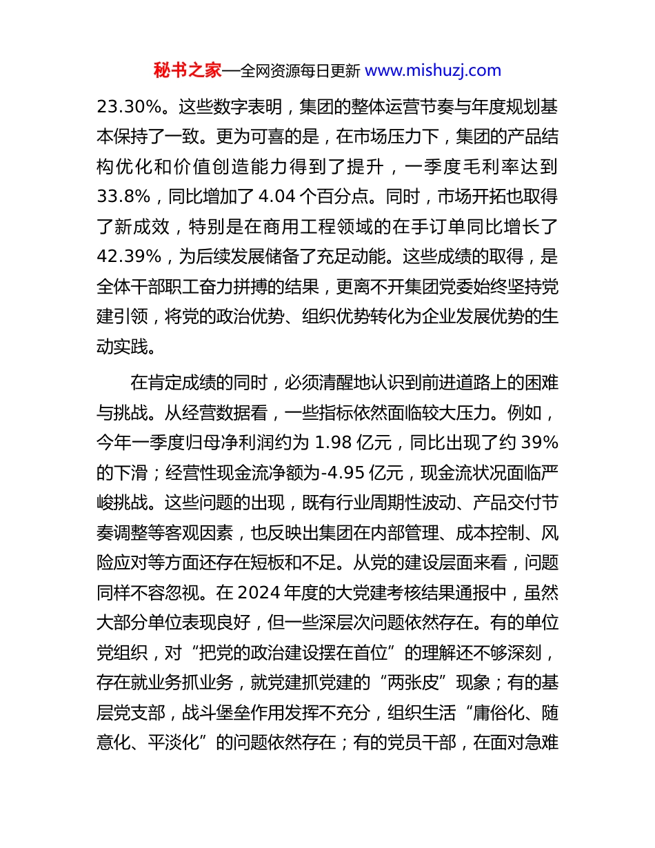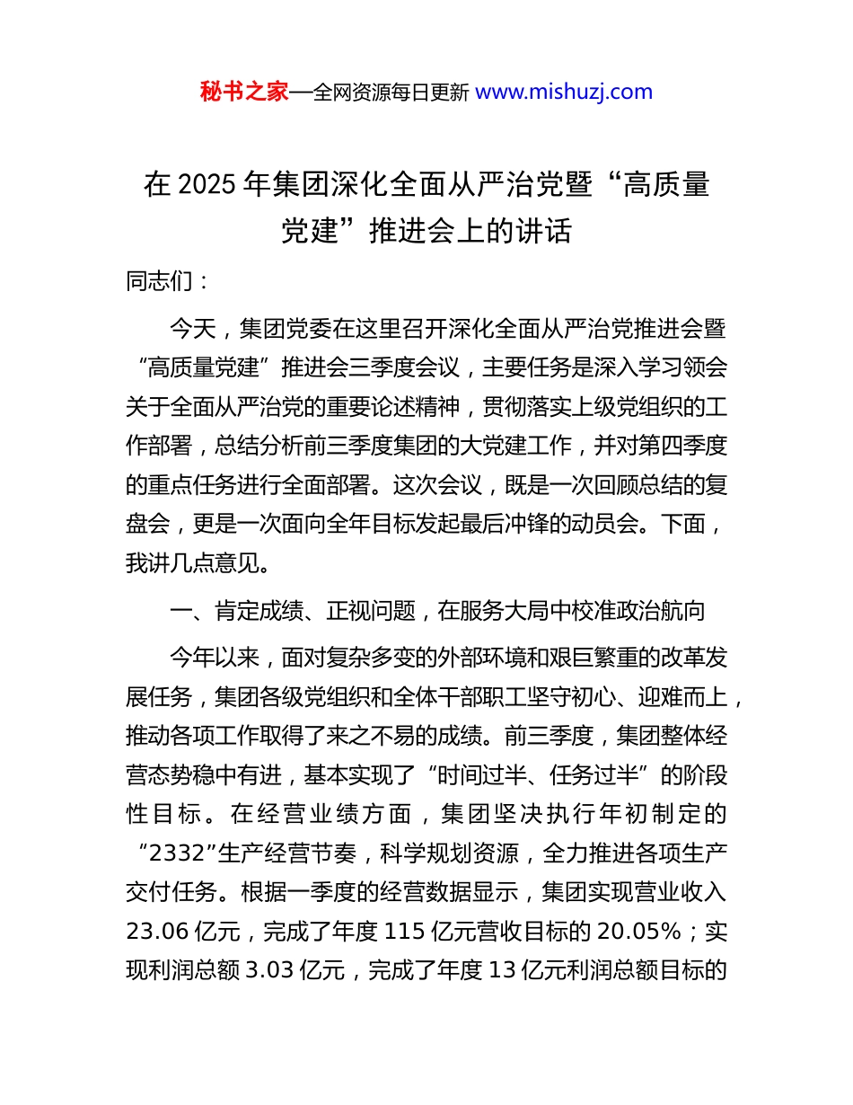 秘书之家—全网资源每日更新 www.mishuzj.com在 2025 年集团深化全面从严治党暨“高质量党建”推进会上的讲话同志们:今天,集团党委在这里召开深化全面从严治党推进会暨“高质量党建”推进会三季度会议,主要任务是深入学习领会关于全面从严治党的重要论述精神,贯彻落实上级党组织的工作部署,总结分析前三季度集团的大党建工作,并对第四季度的重点任务进行全面部署。这次会议,既是一次回顾总结的复盘会,更是一次面向全年目标发起最后冲锋的动员会。下面,我讲几点意见。一、肯定成绩、正视问题,在服务大局中校准政治航向今年以来,面对复杂多变的外部环境和艰巨繁重的改革发展任务,集团各级党组织和全体干部职工坚守初心、迎难而上,推动各项工作取得了来之不易的成绩。前三季度,集团整体经营态势稳中有进,基本实现了“时间过半、任务过半”的阶段性 目 标 。 在 经 营 业 绩 方 面 , 集 团 坚 决 执 行 年 初 制 定 的“2332”生产经营节奏,科学规划资源,全力推进各项生产交付任务。根据一季度的经营数据显示,集团实现营业收入23.06 亿元,完成了年度 115 亿元营收目标的 20.05%;实现利润总额 3.03 亿元,完成了年度 13 亿元利润总额目标的秘书之家—全网资源每日更新 www.mishuzj.com23.30%。这些数字表明,集团的整体运营节奏与年度规划基本保持了一致。更为可喜的是,在市场压力下,集团的产品结构优化和价值创造能力得到了提升,一季度毛利率达到33.8%,同比增加了 4.04 个百分点。同时,市场开拓也取得了新成效,特别是在商用工程领域的在手订单同比增长了42.39%,为后续发展储备了充足动能。这些成绩的取得,是全体干部职工奋力拼搏的结果,更离不开集团党委始终坚持党建引领,将党的政治优势、组织优势转化为企业发展优势的生动实践。在肯定成绩的同时,必须清醒地认识到前进道路上的困难与挑战。从经营数据看,一些指标依然面临较大压力。例如,今年一季度归母净利润约为 1.98 亿元,同比出现了约 39%的下滑;经营性现金流净额为-4.95 亿元,现金流状况面临严峻挑战。这些问题的出现,既有行业周期性波动、产品交付节奏调整等客观因素,也反映出集团在内部管理、成本控制、风险应对等方面还存在短板和不足。从党的建设层面来看,问题同样不容忽视。在 2024 年度的大党建考核结果通报中,虽然大部分单位表现良好,但一些深层次问题依然存在。有的单位党组织,对“把党的政治建设摆在首位”的理解还不够深刻,存在就业务抓业务,就党建抓党建的“两张皮”现象;有的基层党支部,战斗堡垒作用发挥不充分,组织生活“庸俗化、随意化、平淡化”的问题依然存在;有的党员干部,在面对急难秘书之家—全网资源每日更新 www.mishuzj.com险重任务时,先锋模范作用体现不明显,缺乏攻坚克难的锐气和担当。此外,形式主义、官僚主义等“四风”顽疾在一定范围内仍未根除,影响了工作效率和基层士气。这些问题,不仅是党建工作本身的问题,更直接关系到集团的核心竞争力和长远发展。各级党组织必须高度警醒,以考核结果为镜鉴,以问题整改为抓手,切实把全面从严治党的要求落到实处。二、聚焦主业、攻坚克难,以高质量党建引领高质量发展发展是第一要务,是解决一切问题的基础和关键。党建工作的成效,最终要体现在推动企业高质量发展的成果上。必须坚持党建工作与生产经营深度融合,把党建优势转化为攻坚克难、推动发展的强大动力。第一,要强化政治引领,确保发展方向不偏航。企业改革发展的正确方向,是集团行稳致远的根本保证。各级党组织要始终将政治建设放在首位,坚持用党的创新理论武装头脑、指导实践。今年以来,集团党委坚持“第一议题”制度,累计集中学习 15 次,召开党委会 23 次,审议重大议题 142 项,确保上级党组织的各项决策部署在集团得到不折不扣地贯彻执行。下一步,各所属单位党组织要进一步健全完善“第一议题”学习和贯彻落实机制,不仅要学深悟透,更要紧密结合本单位实际,研究制定具体的转化措施和行动方案,确保上级精神能够真正转化为推动本单位科技创新、管理变革和市场开拓的实际秘书...