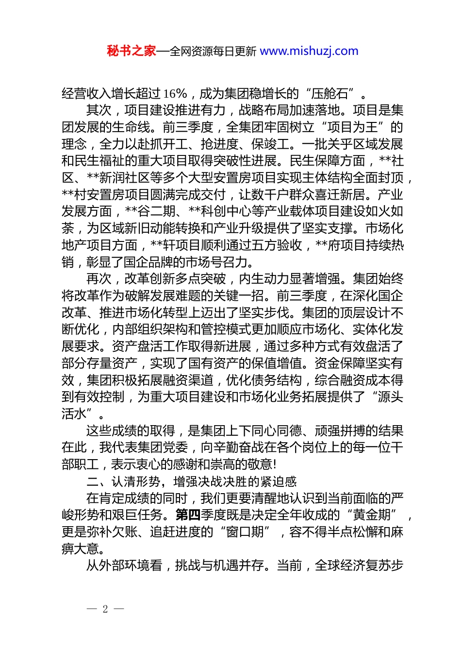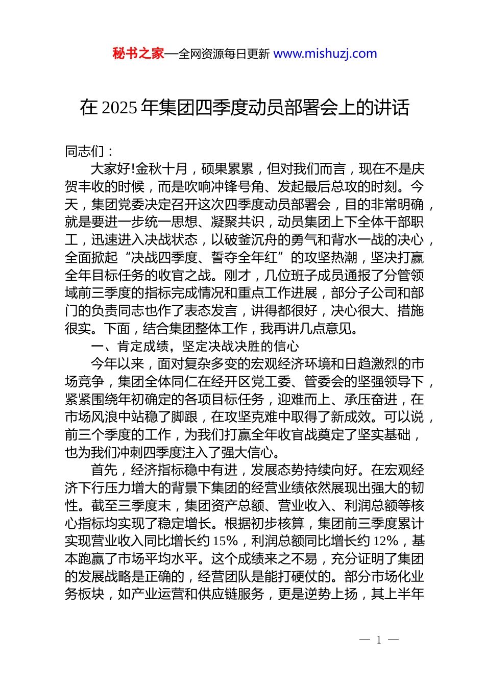秘书之家—全网资源每日更新 www.mishuzj.com在 2025 年集团四季度动员部署会上的讲话同志们:大家好!金秋十月,硕果累累,但对我们而言,现在不是庆贺丰收的时候,而是吹响冲锋号角、发起最后总攻的时刻。今天,集团党委决定召开这次四季度动员部署会,目的非常明确,就是要进一步统一思想、凝聚共识,动员集团上下全体干部职工,迅速进入决战状态,以破釜沉舟的勇气和背水一战的决心,全面掀起“决战四季度、誓夺全年红”的攻坚热潮,坚决打赢全年目标任务的收官之战。刚才,几位班子成员通报了分管领域前三季度的指标完成情况和重点工作进展,部分子公司和部门的负责同志也作了表态发言,讲得都很好,决心很大、措施很实。下面,结合集团整体工作,我再讲几点意见。一、肯定成绩,坚定决战决胜的信心今年以来,面对复杂多变的宏观经济环境和日趋激烈的市场竞争,集团全体同仁在经开区党工委、管委会的坚强领导下,紧紧围绕年初确定的各项目标任务,迎难而上、承压奋进,在市场风浪中站稳了脚跟,在攻坚克难中取得了新成效。可以说,前三个季度的工作,为我们打赢全年收官战奠定了坚实基础,也为我们冲刺四季度注入了强大信心。首先,经济指标稳中有进,发展态势持续向好。在宏观经济下行压力增大的背景下集团的经营业绩依然展现出强大的韧性。截至三季度末,集团资产总额、营业收入、利润总额等核心指标均实现了稳定增长。根据初步核算,集团前三季度累计实现营业收入同比增长约 15%,利润总额同比增长约 12%,基本跑赢了市场平均水平。这个成绩来之不易,充分证明了集团的发展战略是正确的,经营团队是能打硬仗的。部分市场化业务板块,如产业运营和供应链服务,更是逆势上扬,其上半年— 1 —秘书之家—全网资源每日更新 www.mishuzj.com经营收入增长超过 16%,成为集团稳增长的“压舱石”。其次,项目建设推进有力,战略布局加速落地。项目是集团发展的生命线。前三季度,全集团牢固树立“项目为王”的理念,全力以赴抓开工、抢进度、保竣工。一批关乎区域发展和民生福祉的重大项目取得突破性进展。民生保障方面,**社区、**新润社区等多个大型安置房项目实现主体结构全面封顶,**村安置房项目圆满完成交付,让数千户群众喜迁新居。产业发展方面,**谷二期、**科创中心等产业载体项目建设如火如荼,为区域新旧动能转换和产业升级提供了坚实支撑。市场化地产项目方面,**轩项目顺利通过五方验收,**府项目持续热销,彰显了国企品牌的市场号召力。再次,改革创新多点突破,内生动力显著增强。集团始终将改革作为破解发展难题的关键一招。前三季度,在深化国企改革、推进市场化转型上迈出了坚实步伐。集团的顶层设计不断优化,内部组织架构和管控模式更加顺应市场化、实体化发展要求。资产盘活工作取得新进展,通过多种方式有效盘活了部分存量资产,实现了国有资产的保值增值。资金保障坚实有效,集团积极拓展融资渠道,优化债务结构,综合融资成本得到有效控制,为重大项目建设和市场化业务拓展提供了“源头活水”。这些成绩的取得,是集团上下同心同德、顽强拼搏的结果在此,我代表集团党委,向辛勤奋战在各个岗位上的每一位干部职工,表示衷心的感谢和崇高的敬意!二、认清形势,增强决战决胜的紧迫感在肯定成绩的同时,我们更要清醒地认识到当前面临的严峻形势和艰巨任务。第四季度既是决定全年收成的“黄金期”,更是弥补欠账、追赶进度的“窗口期”,容不得半点松懈和麻痹大意。从外部环境看,挑战与机遇并存。当前,全球经济复苏步— 2 —秘书之家—全网资源每日更新 www.mishuzj.com履维艰,地缘政治冲突等“黑天鹅”事件频发,我国经济发展面临的外部环境复杂性、严峻性、不确定性持续上升。聚焦到我们所在的行业领域,房地产市场深度调整仍在继续,地方政府投融资平台转型压力巨大,市场竞争已经从“增量争夺”转向“存量搏杀”。可以说,我们正处在一个不进则退、慢进亦退的激烈赛道上。当然,挑战中也蕴藏着机遇。国家强调要加大宏观政策逆周期调节力度,积极的财政政策有望为基础设施建设和民生工程带来新的发展空间。区域一体化战略的深入推进,也为我...