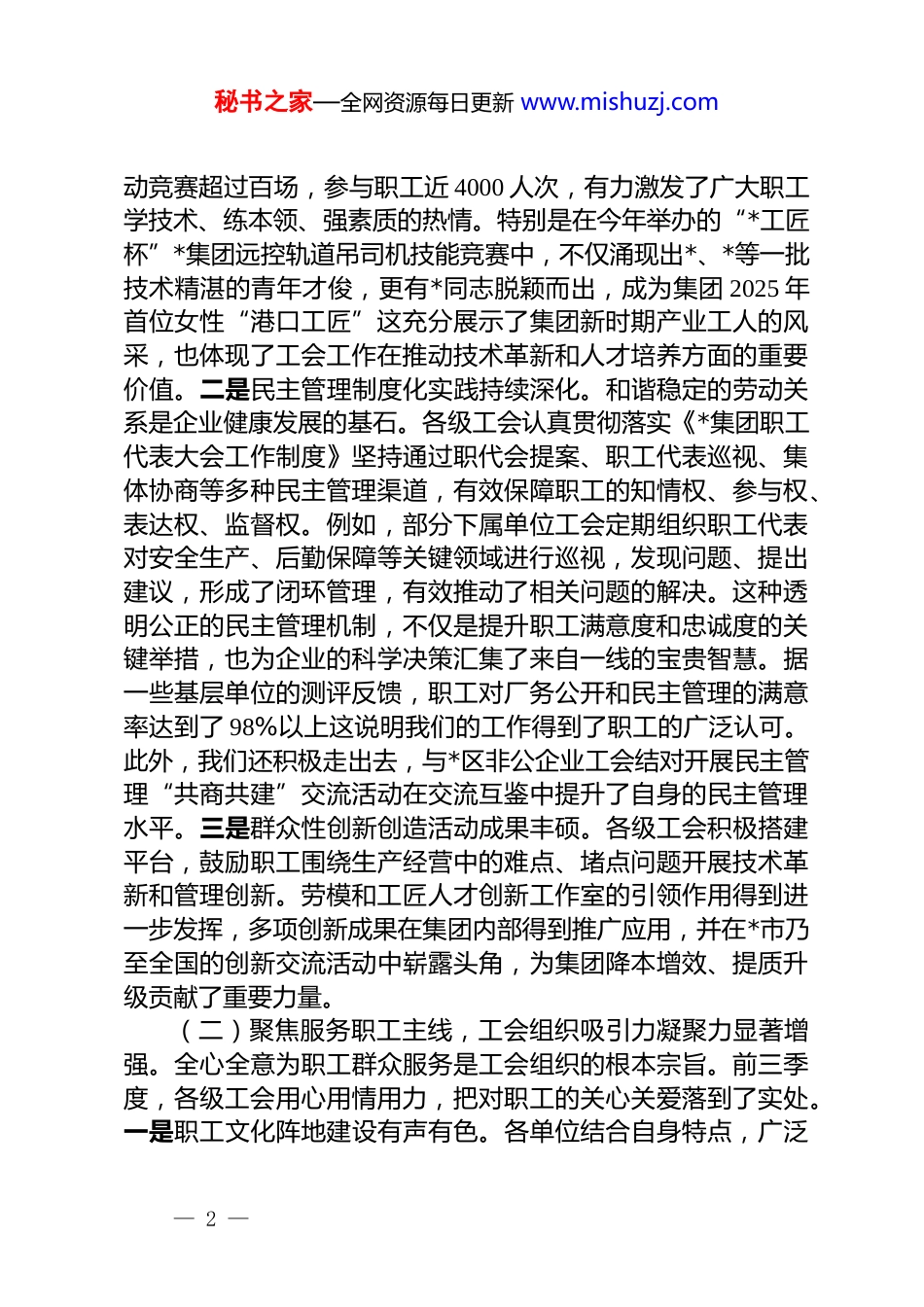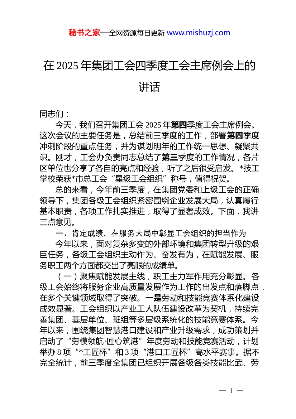 秘书之家—全网资源每日更新 www.mishuzj.com在 2025 年集团工会四季度工会主席例会上的讲话同志们:今天,我们召开集团工会 2025 年第四季度工会主席例会。这次会议的主要任务是,总结前三季度的工作,部署第四季度冲刺阶段的重点任务,并为谋划明年的工作统一思想、凝聚共识。刚才,工会办负责同志总结了第三季度的工作情况,各片区单位也分享了各自的亮点和经验,听了之后很受启发。*技工学校荣获*市总工会“星级工会组织”称号,值得祝贺。总的来看,今年前三季度,在集团党委和上级工会的正确领导下,集团各级工会组织紧密围绕企业发展大局,认真履行基本职责,各项工作扎实推进,取得了显著成效。下面,我讲三点意见。一、肯定成绩,在服务大局中彰显工会组织的担当作为今年以来,面对复杂多变的外部环境和集团转型升级的艰巨任务,各级工会组织主动作为、奋发有为,在赋能发展、服务职工两个方面都交出了亮眼的成绩单。(一)聚焦赋能发展主线,职工主力军作用充分彰显。各级工会始终将服务企业高质量发展作为工作的出发点和落脚点,在多个关键领域取得了突破。一是劳动和技能竞赛体系化建设成效显著。工会组织以产业工人队伍建设改革为契机,持续完善集团、基层单位、班组等多层级系统化的技能竞赛体系。今年以来,围绕集团智慧港口建设和产业升级需求,成功策划并启动了“劳模领航·匠心筑港”年度劳动和技能竞赛活动,计划举办 8 项“*工匠杯”和 3 项“港口工匠杯”高水平赛事。据不完全统计,前三季度全集团已组织开展各级各类技能比武、劳— 1 —秘书之家—全网资源每日更新 www.mishuzj.com动竞赛超过百场,参与职工近 4000 人次,有力激发了广大职工学技术、练本领、强素质的热情。特别是在今年举办的“*工匠杯”*集团远控轨道吊司机技能竞赛中,不仅涌现出*、*等一批技术精湛的青年才俊,更有*同志脱颖而出,成为集团 2025 年首位女性“港口工匠”这充分展示了集团新时期产业工人的风采,也体现了工会工作在推动技术革新和人才培养方面的重要价值。二是民主管理制度化实践持续深化。和谐稳定的劳动关系是企业健康发展的基石。各级工会认真贯彻落实《*集团职工代表大会工作制度》坚持通过职代会提案、职工代表巡视、集体协商等多种民主管理渠道,有效保障职工的知情权、参与权、表达权、监督权。例如,部分下属单位工会定期组织职工代表对安全生产、后勤保障等关键领域进行巡视,发现问题、提出建议,形成了闭环管理,有效推动了相关问题的解决。这种透明公正的民主管理机制,不仅是提升职工满意度和忠诚度的关键举措,也为企业的科学决策汇集了来自一线的宝贵智慧。据一些基层单位的测评反馈,职工对厂务公开和民主管理的满意率达到了 98%以上这说明我们的工作得到了职工的广泛认可。此外,我们还积极走出去,与*区非公企业工会结对开展民主管理“共商共建”交流活动在交流互鉴中提升了自身的民主管理水平。三是群众性创新创造活动成果丰硕。各级工会积极搭建平台,鼓励职工围绕生产经营中的难点、堵点问题开展技术革新和管理创新。劳模和工匠人才创新工作室的引领作用得到进一步发挥,多项创新成果在集团内部得到推广应用,并在*市乃至全国的创新交流活动中崭露头角,为集团降本增效、提质升级贡献了重要力量。(二)聚焦服务职工主线,工会组织吸引力凝聚力显著增强。全心全意为职工群众服务是工会组织的根本宗旨。前三季度,各级工会用心用情用力,把对职工的关心关爱落到了实处。一是职工文化阵地建设有声有色。各单位结合自身特点,广泛— 2 —秘书之家—全网资源每日更新 www.mishuzj.com开展了形式多样、内容丰富的文体活动,从体育竞赛到文艺汇演,从读书分享到兴趣小组,不仅丰富了职工的业余文化生活,更在活动中熔炼了团队精神,增强了队伍的向心力和战斗力。二是职工服务保障网络织密织牢。始终将职工的安危冷暖放在心上,持续做好困难职工的帮扶救助工作,深化“夏送清凉、冬送温暖”等品牌活动,切实帮助职工解决急难愁盼问题。同时,高度关注职工的身心健康,通过举办健康讲座、提供心理咨询服务等方式,引导职工建立健康、积...