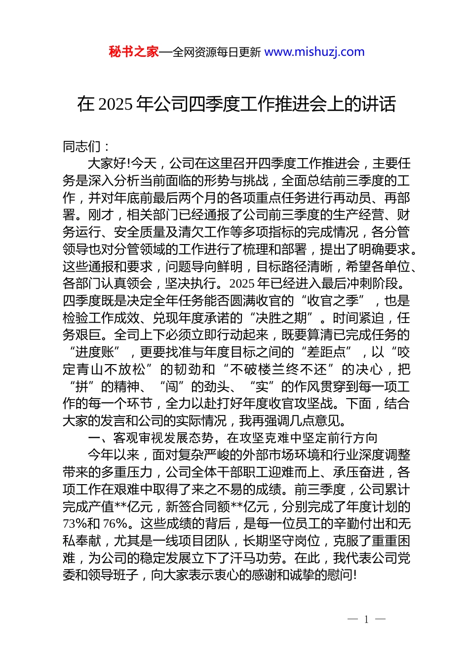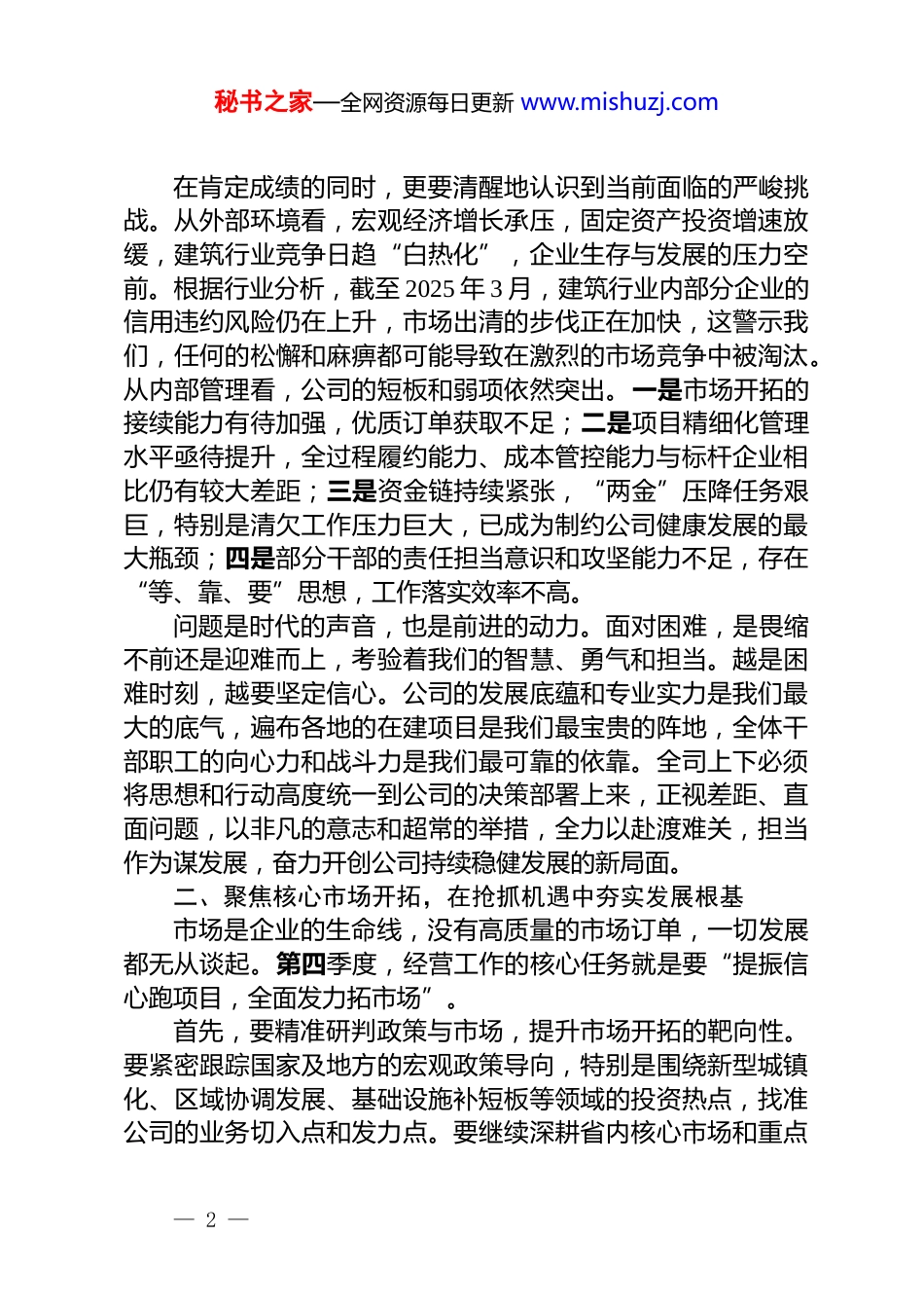 秘书之家—全网资源每日更新 www.mishuzj.com在 2025 年公司四季度工作推进会上的讲话同志们:大家好!今天,公司在这里召开四季度工作推进会,主要任务是深入分析当前面临的形势与挑战,全面总结前三季度的工作,并对年底前最后两个月的各项重点任务进行再动员、再部署。刚才,相关部门已经通报了公司前三季度的生产经营、财务运行、安全质量及清欠工作等多项指标的完成情况,各分管领导也对分管领域的工作进行了梳理和部署,提出了明确要求。这些通报和要求,问题导向鲜明,目标路径清晰,希望各单位、各部门认真领会,坚决执行。2025 年已经进入最后冲刺阶段。四季度既是决定全年任务能否圆满收官的“收官之季”,也是检验工作成效、兑现年度承诺的“决胜之期”。时间紧迫,任务艰巨。全司上下必须立即行动起来,既要算清已完成任务的“进度账”,更要找准与年度目标之间的“差距点”,以“咬定青山不放松”的韧劲和“不破楼兰终不还”的决心,把“拼”的精神、“闯”的劲头、“实”的作风贯穿到每一项工作的每一个环节,全力以赴打好年度收官攻坚战。下面,结合大家的发言和公司的实际情况,我再强调几点意见。一、客观审视发展态势,在攻坚克难中坚定前行方向今年以来,面对复杂严峻的外部市场环境和行业深度调整带来的多重压力,公司全体干部职工迎难而上、承压奋进,各项工作在艰难中取得了来之不易的成绩。前三季度,公司累计完成产值**亿元,新签合同额**亿元,分别完成了年度计划的73%和 76%。这些成绩的背后,是每一位员工的辛勤付出和无私奉献,尤其是一线项目团队,长期坚守岗位,克服了重重困难,为公司的稳定发展立下了汗马功劳。在此,我代表公司党委和领导班子,向大家表示衷心的感谢和诚挚的慰问!— 1 —秘书之家—全网资源每日更新 www.mishuzj.com在肯定成绩的同时,更要清醒地认识到当前面临的严峻挑战。从外部环境看,宏观经济增长承压,固定资产投资增速放缓,建筑行业竞争日趋“白热化”,企业生存与发展的压力空前。根据行业分析,截至 2025 年 3 月,建筑行业内部分企业的信用违约风险仍在上升,市场出清的步伐正在加快,这警示我们,任何的松懈和麻痹都可能导致在激烈的市场竞争中被淘汰。从内部管理看,公司的短板和弱项依然突出。一是市场开拓的接续能力有待加强,优质订单获取不足;二是项目精细化管理水平亟待提升,全过程履约能力、成本管控能力与标杆企业相比仍有较大差距;三是资金链持续紧张,“两金”压降任务艰巨,特别是清欠工作压力巨大,已成为制约公司健康发展的最大瓶颈;四是部分干部的责任担当意识和攻坚能力不足,存在“等、靠、要”思想,工作落实效率不高。问题是时代的声音,也是前进的动力。面对困难,是畏缩不前还是迎难而上,考验着我们的智慧、勇气和担当。越是困难时刻,越要坚定信心。公司的发展底蕴和专业实力是我们最大的底气,遍布各地的在建项目是我们最宝贵的阵地,全体干部职工的向心力和战斗力是我们最可靠的依靠。全司上下必须将思想和行动高度统一到公司的决策部署上来,正视差距、直面问题,以非凡的意志和超常的举措,全力以赴渡难关,担当作为谋发展,奋力开创公司持续稳健发展的新局面。二、聚焦核心市场开拓,在抢抓机遇中夯实发展根基市场是企业的生命线,没有高质量的市场订单,一切发展都无从谈起。第四季度,经营工作的核心任务就是要“提振信心跑项目,全面发力拓市场”。首先,要精准研判政策与市场,提升市场开拓的靶向性。要紧密跟踪国家及地方的宏观政策导向,特别是围绕新型城镇化、区域协调发展、基础设施补短板等领域的投资热点,找准公司的业务切入点和发力点。要继续深耕省内核心市场和重点— 2 —秘书之家—全网资源每日更新 www.mishuzj.com县域市场,发挥地缘优势和人脉资源,巩固基本盘。同时,要有序拓展战略性新兴市场,积极探索与政策红利高度相关的业务领域,如绿色低碳建筑、城市更新、保障性住房建设等。要强化与各级政府部门的对接沟通,拓宽信息来源渠道,抢占市场先机。其次,要全力维护和拓展合作网络,提升协同经营的层次要树立“大经营”理念,进一步“扩大朋友...