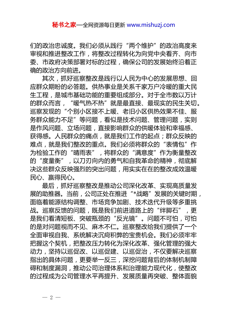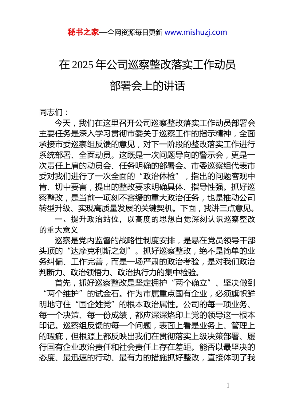 秘书之家—全网资源每日更新 www.mishuzj.com在 2025 年公司巡察整改落实工作动员部署会上的讲话同志们:今天,我们在这里召开公司巡察整改落实工作动员部署会主要任务是深入学习贯彻市委关于巡察工作的指示精神,全面承接市委巡察组反馈的意见,对下一阶段的整改落实工作进行系统部署、全面动员。这既是一次问题导向的警示会,更是一次责任上肩的动员会、任务明确的部署会。市委巡察组代表市委对我们进行了一次全面的“政治体检”,指出的问题客观中肯、切中要害,提出的整改要求明确具体、指导性强。抓好巡察整改,是当前一项刻不容缓的重大政治任务,也是推动公司转型升级、实现高质量发展的关键契机。下面,我讲三点意见。一、提升政治站位,以高度的思想自觉深刻认识巡察整改的重大意义巡察是党内监督的战略性制度安排,是悬在党员领导干部头顶的“达摩克利斯之剑”。抓好巡察整改,绝不是简单的业务纠偏、工作完善,而是一场严肃的政治考验,是对我们政治判断力、政治领悟力、政治执行力的集中检验。首先,抓好巡察整改是坚定拥护“两个确立”、坚决做到“两个维护”的试金石。作为市属重点国有企业,必须旗帜鲜明地守住“国企姓党”的根本政治属性。公司的每一项业务、每一个决策、每一份成绩,都应深深烙印上党的领导这一根本印记。巡察组反馈的每一个问题,表面上看是业务上、管理上的瑕疵,但根源上都反映出我们在贯彻落实上级决策部署、履行国有企业政治责任和社会责任上存在差距。能否以最坚决的态度、最迅速的行动、最有力的措施抓好整改,直接体现了我— 1 —秘书之家—全网资源每日更新 www.mishuzj.com们的政治忠诚度。我们必须从践行“两个维护”的政治高度来审视和推进整改工作,将整改过程转化为向党中央看齐、向市委、市政府决策部署对标的过程,确保公司的发展始终沿着正确的政治方向前进。其次,抓好巡察整改是践行以人民为中心的发展思想、回应群众期盼的必答题。供热事业是关系千家万户冷暖的重大民生工程,是城市基础功能的重要组成部分。对于全市数以万计的群众而言,“暖气热不热”就是最直接、最现实的民生关切。巡察发现的“个别小区接不上暖、老旧小区供热效果不佳、服务群众能力不足”等问题,看似是技术问题、管理问题,实则是作风问题、立场问题,直接影响群众的供暖体验和幸福感、获得感。人民群众的痛点,就是我们工作的起点;群众反映的难点,就是我们整改的重点。我们必须将群众的“表情包”作为检验工作的“晴雨表”,将群众的“满意度”作为衡量整改的“度量衡”,以刀刃向内的勇气和自我革命的精神,彻底解决这些群众反映强烈的突出问题,用实实在在的整改成效温暖民心、赢得民心。最后,抓好巡察整改是推动公司深化改革、实现高质量发展的助推器。当前,公司正处在推进“*战略”发展的关键时期,面临着能源结构调整、市场竞争加剧、技术迭代升级等多重挑战。巡察反馈的问题,既是我们前进道路上的“绊脚石”,更是我们看清短板、突破瓶颈的“反光镜”。问题不可怕,可怕的是对问题视而不见、麻木不仁。巡察整改给我们提供了一个全面审视自我、系统解决沉疴积弊的宝贵机会。我们必须牢牢把握这个契机,把整改压力转化为深化改革、强化管理的强大动力,坚持以巡促改、以巡促建、以巡促治,不仅要解决巡察指出的具体问题,更要举一反三,深挖问题背后的体制机制障碍和制度漏洞,推动公司治理体系和治理能力现代化,使整改的过程成为公司管理水平再提升、发展质量再突破、整体面貌— 2 —秘书之家—全网资源每日更新 www.mishuzj.com再刷新的过程。二、坚持问题导向,以精准的靶向施策全力破解制约发展的顽瘴痼疾巡察反馈意见书就是一份详尽的“问题清单”,也是一份沉甸甸的“责任清单”。我们必须摒弃“过关”心态,杜绝“看客”心理,坚持问题导向,聚焦关键环节,拿出“钉钉子”的精神,逐项破解、系统治理,确保整改工作触及要害、深入肌理、见到实效。第一,聚焦供热网络“覆盖不全、冷热不均”的短板,全力提升供热保障能力。巡察指出,部分新建小区存在“接入难”,一些老旧小区则面临“供暖难”,这暴露出我们的管网规划和...