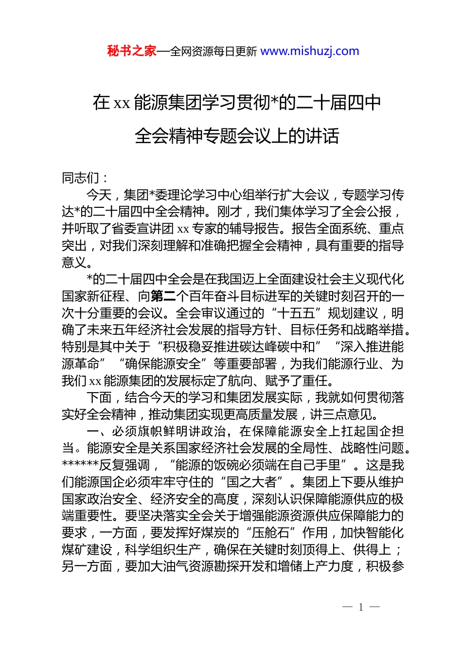 秘书之家—全网资源每日更新 www.mishuzj.com在 xx 能源集团学习贯彻*的二十届四中全会精神专题会议上的讲话同志们:今天,集团*委理论学习中心组举行扩大会议,专题学习传达*的二十届四中全会精神。刚才,我们集体学习了全会公报,并听取了省委宣讲团 xx 专家的辅导报告。报告全面系统、重点突出,对我们深刻理解和准确把握全会精神,具有重要的指导意义。*的二十届四中全会是在我国迈上全面建设社会主义现代化国家新征程、向第二个百年奋斗目标进军的关键时刻召开的一次十分重要的会议。全会审议通过的“十五五”规划建议,明确了未来五年经济社会发展的指导方针、目标任务和战略举措。特别是其中关于“积极稳妥推进碳达峰碳中和”“深入推进能源革命”“确保能源安全”等重要部署,为我们能源行业、为我们 xx 能源集团的发展标定了航向、赋予了重任。下面,结合今天的学习和集团发展实际,我就如何贯彻落实好全会精神,推动集团实现更高质量发展,讲三点意见。一、必须旗帜鲜明讲政治,在保障能源安全上扛起国企担当。能源安全是关系国家经济社会发展的全局性、战略性问题。******反复强调,“能源的饭碗必须端在自己手里”。这是我们能源国企必须牢牢守住的“国之大者”。集团上下要从维护国家政治安全、经济安全的高度,深刻认识保障能源供应的极端重要性。要坚决落实全会关于增强能源资源供应保障能力的要求,一方面,要发挥好煤炭的“压舱石”作用,加快智能化煤矿建设,科学组织生产,确保在关键时刻顶得上、供得上;另一方面,要加大油气资源勘探开发和增储上产力度,积极参— 1 —秘书之家—全网资源每日更新 www.mishuzj.com与国内外优质能源项目合作,不断提升能源自主保障水平,坚决当好全省乃至全国能源安全的“稳定器”和“顶梁柱”。二、必须完整准确贯彻新发展理念,在推动绿色转型上闯出新路。二十届四中全会再次吹响了绿色低碳发展的冲锋号。对我们传统能源企业而言,转型是生存题,更是发展题,慢了不行,假转更不行。集团上下要彻底摒弃“挖煤卖电”的传统思维定式,把绿色低碳转型作为“头号工程”来抓。要大力发展新能源,加快推进 xx 大型风光基地项目、xx 抽水蓄能电站项目建设,确保到“十五五”末,集团新能源装机占比提升至40%以上。要积极布局氢能、储能、碳捕集等未来产业,抢占新赛道。要深入推进煤炭清洁高效利用,延伸产业链,提升附加值。要以壮士断腕的决心,坚决淘汰落后产能,以“含绿量”提升发展的“含金量”。三、必须坚持创新驱动,在强化科技赋能上塑造核心优势全会强调,要以科技创新推动产业创新。对于技术密集型的能源行业来说,谁牵住了科技创新这个“牛鼻子”,谁就能掌握发展的主动权。集团各单位要强化企业科技创新主体地位,建立健全鼓励创新的体制机制。要整合集团内外科研力量,组建高水平的能源技术研究院,围绕煤炭绿色开采、新能源高效利用、新型储能技术等领域,集中力量开展核心技术攻关。要加大研发投入,确保“十五五”期间研发投入强度年均增长不低于 15%。要完善人才“引育用留”全链条,大胆使用青年科技人才,着力培养一批行业领军人才和高水平创新团队,为集团高质量发展注入源源不断的强劲动能。同志们,蓝图已绘就,奋进正当时。让我们更加紧密地团结在以***同志为核心的*中央周围,以*的二十届四中全会精神为强大指引,锐意进取、真抓实干,奋力开创集团公司高质量发展新局面,为谱写中国式现代化 xx 篇章贡献更多能源力量!散会!— 2 —