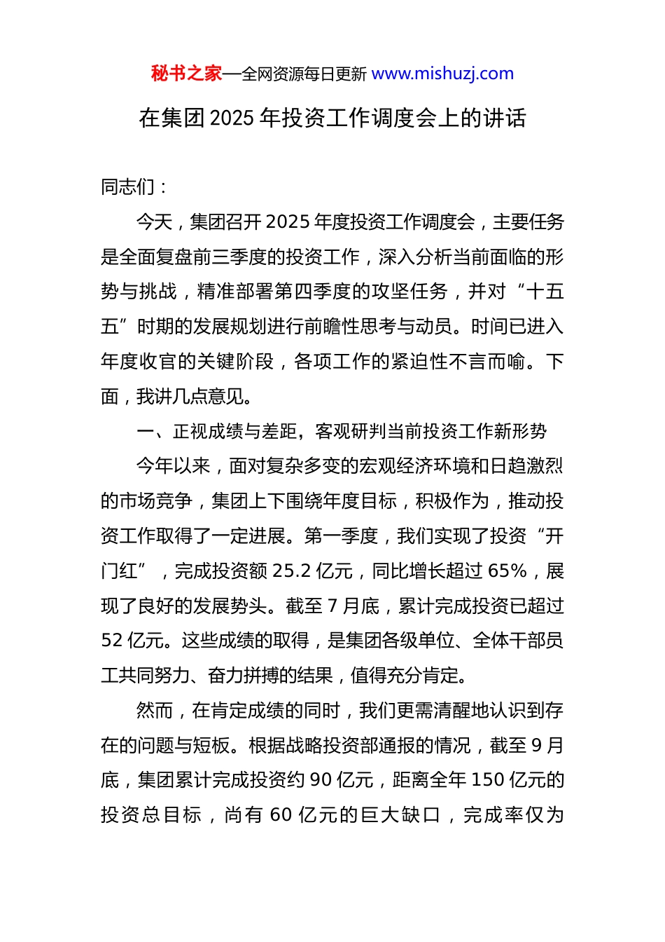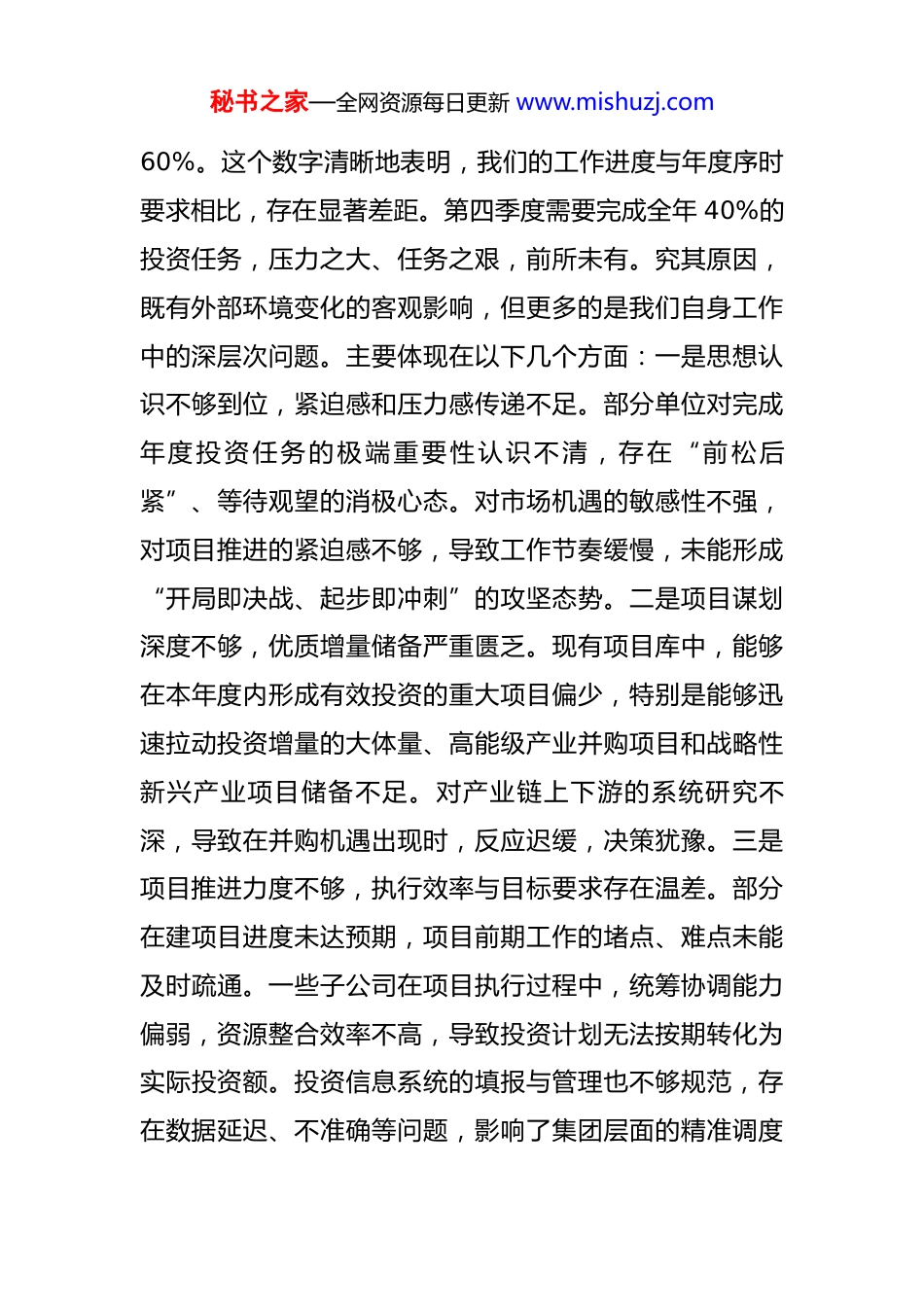 秘书之家—全网资源每日更新 www.mishuzj.com在集团 2025 年投资工作调度会上的讲话 同志们:今天,集团召开 2025 年度投资工作调度会,主要任务是全面复盘前三季度的投资工作,深入分析当前面临的形势与挑战,精准部署第四季度的攻坚任务,并对“十五五”时期的发展规划进行前瞻性思考与动员。时间已进入年度收官的关键阶段,各项工作的紧迫性不言而喻。下面,我讲几点意见。一、正视成绩与差距,客观研判当前投资工作新形势今年以来,面对复杂多变的宏观经济环境和日趋激烈的市场竞争,集团上下围绕年度目标,积极作为,推动投资工作取得了一定进展。第一季度,我们实现了投资“开门红”,完成投资额 25.2 亿元,同比增长超过 65%,展现了良好的发展势头。截至 7 月底,累计完成投资已超过52 亿元。这些成绩的取得,是集团各级单位、全体干部员工共同努力、奋力拼搏的结果,值得充分肯定。然而,在肯定成绩的同时,我们更需清醒地认识到存在的问题与短板。根据战略投资部通报的情况,截至 9 月底,集团累计完成投资约 90 亿元,距离全年 150 亿元的投 资 总 目 标 , 尚 有 60 亿 元 的 巨 大 缺 口 , 完 成 率 仅 为秘书之家—全网资源每日更新 www.mishuzj.com60%。这个数字清晰地表明,我们的工作进度与年度序时要求相比,存在显著差距。第四季度需要完成全年 40%的投资任务,压力之大、任务之艰,前所未有。究其原因,既有外部环境变化的客观影响,但更多的是我们自身工作中的深层次问题。主要体现在以下几个方面:一是思想认识不够到位,紧迫感和压力感传递不足。部分单位对完成年度投资任务的极端重要性认识不清,存在“前松后紧”、等待观望的消极心态。对市场机遇的敏感性不强,对项目推进的紧迫感不够,导致工作节奏缓慢,未能形成“开局即决战、起步即冲刺”的攻坚态势。二是项目谋划深度不够,优质增量储备严重匮乏。现有项目库中,能够在本年度内形成有效投资的重大项目偏少,特别是能够迅速拉动投资增量的大体量、高能级产业并购项目和战略性新兴产业项目储备不足。对产业链上下游的系统研究不深,导致在并购机遇出现时,反应迟缓,决策犹豫。三是项目推进力度不够,执行效率与目标要求存在温差。部分在建项目进度未达预期,项目前期工作的堵点、难点未能及时疏通。一些子公司在项目执行过程中,统筹协调能力偏弱,资源整合效率不高,导致投资计划无法按期转化为实际投资额。投资信息系统的填报与管理也不够规范,存在数据延迟、不准确等问题,影响了集团层面的精准调度秘书之家—全网资源每日更新 www.mishuzj.com与决策。四是专业能力建设不够,人才支撑与发展需求尚有差距。面对文旅产业转型升级的新趋势、新要求,我们的投资团队在资本运作、产业并购、新兴业态研判等方面的专业能力还有待提升。高水平的复合型投资管理人才短缺,已成为制约集团投资发展能级提升的关键瓶颈。同志们,问题是时代的声音,也是我们前进的动力。对这些差距和问题,必须高度警醒、深刻反思,决不能视而不见、麻木不仁。第四季度是决定全年成败的冲刺阶段,我们已经没有退路,唯有迎难而上,以超常规的决心和举措,奋力一搏。二、聚焦目标与任务,全力打赢第四季度投资攻坚战距离年底只剩下两个多月时间,完成 60 亿元的投资任务,是一场必须打赢的硬仗。各单位、各部门必须立即行动起来,把思想和行动统一到集团的决策部署上来,以决战决胜的姿态,精准发力,确保年度目标圆满收官。第一,强化目标刚性约束,层层压实攻坚责任。集团下达的年度投资目标是硬指标,不是参考值。各子公司主要负责人是本单位投资任务的第一责任人,要亲自挂帅、靠前指挥,将压力和责任传导到每一个层级、每一个岗位、每一个人。要将年度投资任务分解到月、责任到人,建立“日报告、周调度、月盘点”的工作机制。集团相关秘书之家—全网资源每日更新 www.mishuzj.com职能部门要加强督导,对进度迟缓的单位要亮牌警告、挂牌督办,形成强有力的倒逼机制。第二,狠抓项目落地转化,千方百计扩大有效投资。要全面梳理在建项目和储备项目,倒排工期、挂图作战。...
