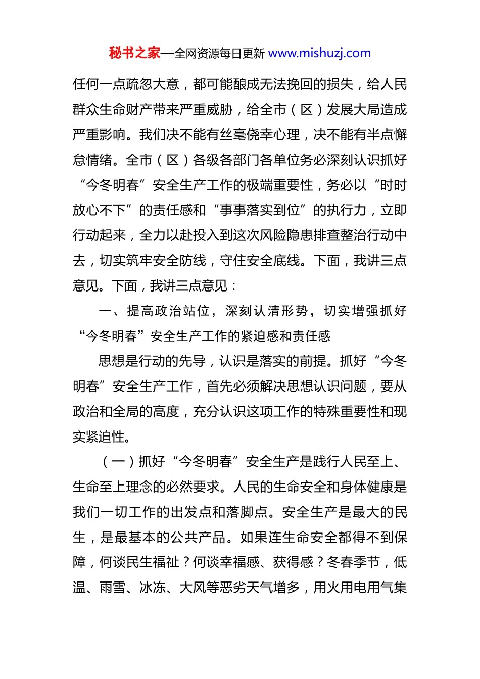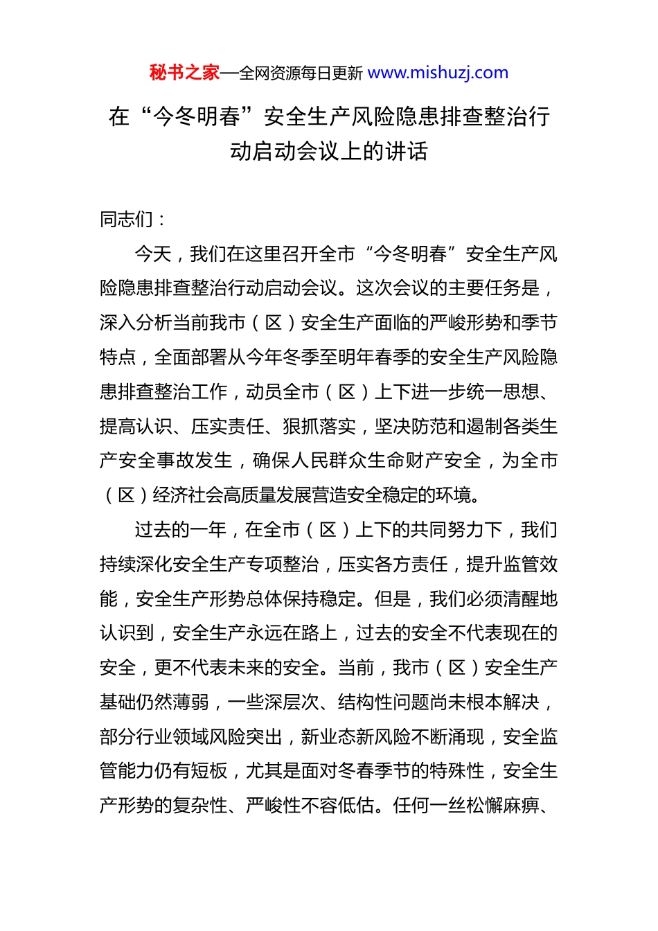 秘书之家—全网资源每日更新 www.mishuzj.com在“今冬明春”安全生产风险隐患排查整治行动启动会议上的讲话 同志们:今天,我们在这里召开全市“今冬明春”安全生产风险隐患排查整治行动启动会议。这次会议的主要任务是,深入分析当前我市(区)安全生产面临的严峻形势和季节特点,全面部署从今年冬季至明年春季的安全生产风险隐患排查整治工作,动员全市(区)上下进一步统一思想、提高认识、压实责任、狠抓落实,坚决防范和遏制各类生产安全事故发生,确保人民群众生命财产安全,为全市(区)经济社会高质量发展营造安全稳定的环境。过去的一年,在全市(区)上下的共同努力下,我们持续深化安全生产专项整治,压实各方责任,提升监管效能,安全生产形势总体保持稳定。但是,我们必须清醒地认识到,安全生产永远在路上,过去的安全不代表现在的安全,更不代表未来的安全。当前,我市(区)安全生产基础仍然薄弱,一些深层次、结构性问题尚未根本解决,部分行业领域风险突出,新业态新风险不断涌现,安全监管能力仍有短板,尤其是面对冬春季节的特殊性,安全生产形势的复杂性、严峻性不容低估。任何一丝松懈麻痹、秘书之家—全网资源每日更新 www.mishuzj.com任何一点疏忽大意,都可能酿成无法挽回的损失,给人民群众生命财产带来严重威胁,给全市(区)发展大局造成严重影响。我们决不能有丝毫侥幸心理,决不能有半点懈怠情绪。全市(区)各级各部门各单位务必深刻认识抓好“今冬明春”安全生产工作的极端重要性,务必以“时时放心不下”的责任感和“事事落实到位”的执行力,立即行动起来,全力以赴投入到这次风险隐患排查整治行动中去,切实筑牢安全防线,守住安全底线。下面,我讲三点意见。下面,我讲三点意见:一、提高政治站位,深刻认清形势,切实增强抓好“今冬明春”安全生产工作的紧迫感和责任感思想是行动的先导,认识是落实的前提。抓好“今冬明春”安全生产工作,首先必须解决思想认识问题,要从政治和全局的高度,充分认识这项工作的特殊重要性和现实紧迫性。(一)抓好“今冬明春”安全生产是践行人民至上、生命至上理念的必然要求。人民的生命安全和身体健康是我们一切工作的出发点和落脚点。安全生产是最大的民生,是最基本的公共产品。如果连生命安全都得不到保障,何谈民生福祉?何谈幸福感、获得感?冬春季节,低温、雨雪、冰冻、大风等恶劣天气增多,用火用电用气集秘书之家—全网资源每日更新 www.mishuzj.com中,春运繁忙,节庆活动密集,历来是火灾、道路交通、建筑施工、燃气中毒、烟花爆竹等事故的易发期、多发期。我们必须牢固树立以人民为中心的发展思想,始终把保护人民生命安全摆在首位,以对人民高度负责的态度,将“今冬明春”安全生产作为一项重大的政治任务和民生工程来抓,采取更加有力、更加精准的措施,最大限度减少事故的发生,最大限度保护人民群众的生命财产安全,以实际行动践行人民至上、生命至上的庄严承诺。(二)抓好“今冬明春”安全生产是服务保障经济社会平稳健康发展的现实需要。安全是发展的前提,稳定是强盛的基础。没有一个安全稳定的环境,一切都无从谈起。当前,我市(区)正处在推动高质量发展的关键时期,各项改革发展稳定任务十分繁重。安全生产一旦出事,不仅会造成直接的人员伤亡和财产损失,还会打乱正常的生产生活秩序,冲击社会稳定,影响投资环境,损害城市形象,甚至可能引发系统性风险,给经济社会发展带来难以估量的负面影响。特别是在年终岁尾、谋划明年的关键节点,确保安全生产形势稳定,对于圆满完成全年目标任务,为明年工作开好局、起好步,具有至关重要的意义。我们必须统筹发展和安全,深刻认识到抓安全就是抓发展、保安全就是保效益,坚决不要带血的 GDP,以高水秘书之家—全网资源每日更新 www.mishuzj.com平安全保障高质量发展。(三)抓好“今冬明春”安全生产是应对当前严峻复杂风险挑战的迫切要求。客观分析,我市(区)“今冬明春”安全生产面临的风险挑战前所未有。一是季节性风险突出。寒冷天气可能导致设备设施冻裂、道路结冰、能见度降低,增加工矿企业、交通运输等领域风险;冬季...