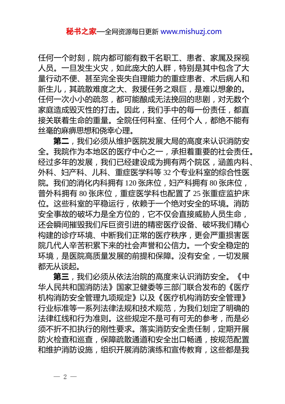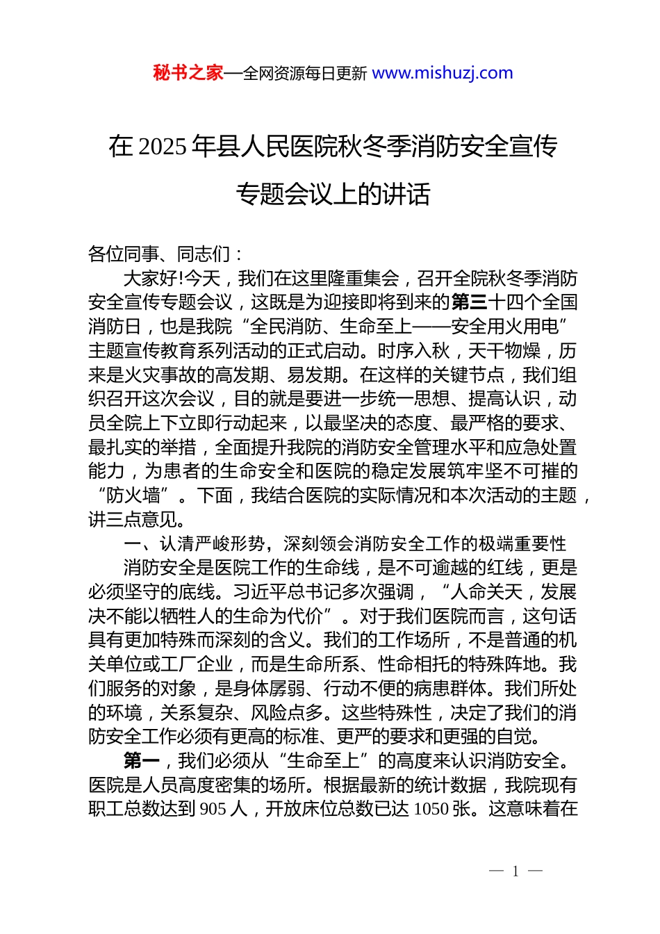 秘书之家—全网资源每日更新 www.mishuzj.com在 2025 年县人民医院秋冬季消防安全宣传专题会议上的讲话各位同事、同志们:大家好!今天,我们在这里隆重集会,召开全院秋冬季消防安全宣传专题会议,这既是为迎接即将到来的第三十四个全国消防日,也是我院“全民消防、生命至上——安全用火用电”主题宣传教育系列活动的正式启动。时序入秋,天干物燥,历来是火灾事故的高发期、易发期。在这样的关键节点,我们组织召开这次会议,目的就是要进一步统一思想、提高认识,动员全院上下立即行动起来,以最坚决的态度、最严格的要求、最扎实的举措,全面提升我院的消防安全管理水平和应急处置能力,为患者的生命安全和医院的稳定发展筑牢坚不可摧的“防火墙”。下面,我结合医院的实际情况和本次活动的主题,讲三点意见。一、认清严峻形势,深刻领会消防安全工作的极端重要性消防安全是医院工作的生命线,是不可逾越的红线,更是必须坚守的底线。习近平总书记多次强调,“人命关天,发展决不能以牺牲人的生命为代价”。对于我们医院而言,这句话具有更加特殊而深刻的含义。我们的工作场所,不是普通的机关单位或工厂企业,而是生命所系、性命相托的特殊阵地。我们服务的对象,是身体孱弱、行动不便的病患群体。我们所处的环境,关系复杂、风险点多。这些特殊性,决定了我们的消防安全工作必须有更高的标准、更严的要求和更强的自觉。第一,我们必须从“生命至上”的高度来认识消防安全。医院是人员高度密集的场所。根据最新的统计数据,我院现有职工总数达到 905 人,开放床位总数已达 1050 张。这意味着在— 1 —秘书之家—全网资源每日更新 www.mishuzj.com任何一个时刻,院内都可能有数千名职工、患者、家属及探视人员。一旦发生火灾,如此庞大的人群,特别是其中包含了大量行动不便、甚至完全丧失自理能力的重症患者、术后病人和新生儿,其疏散难度之大、救援任务之艰巨,是难以想象的。任何一次小小的疏忽,都可能酿成无法挽回的悲剧,对无数个家庭造成毁灭性的打击。因此,我们手中的每一份责任,都直接关联着生命的重量。全院任何科室、任何个人,都绝不能有丝毫的麻痹思想和侥幸心理。第二,我们必须从维护医院发展大局的高度来认识消防安全。我院作为本地区的医疗中心之一,承担着重要的社会责任。经过多年的发展,我们已经建设成为拥有两个院区,涵盖内科、外科、妇产科、儿科、重症医学科等 32 个专业科室的综合性医院。我们的消化内科拥有 120 张床位,妇产科拥有 80 张床位,普外科拥有 80 张床位,重症医学科也配置了 25 张重症监护床位。这些科室的平稳运行,依赖于一个绝对安全的环境。消防安全事故的破坏力是全方位的,它不仅会直接威胁人员生命,还会瞬间摧毁我们斥巨资引进的精密医疗设备、破坏我们精心构建的诊疗环境、中断我们正常的医疗秩序,更会严重损害医院几代人辛苦积累下来的社会声誉和公信力。一个安全稳定的环境,是医院高质量发展的前提和保障。没有安全,一切发展都无从谈起。第三,我们必须从依法治院的高度来认识消防安全。《中华人民共和国消防法》国家卫健委等三部门联合发布的《医疗机构消防安全管理九项规定》以及《医疗机构消防安全管理》行业标准等一系列法律法规和技术规范,为我们划定了明确的法律红线和行为准则。这些规定不是可有可无的参考,而是必须不折不扣执行的刚性要求。落实消防安全责任制,定期开展防火检查和巡查,保障疏散通道和安全出口畅通,按规范配置和维护消防设施,组织开展消防演练和宣传教育,这些都是我— 2 —秘书之家—全网资源每日更新 www.mishuzj.com们的法定职责。漠视法规,就是对人民生命财产安全的漠视;玩忽职守,必将受到法律的严惩。我们必须将法治思维贯穿于消防安全管理的全过程,做到有法必依、执法必严、违法必究。二、正视工作现状,清醒把握当前存在的成绩与不足近年来,院党委和院行政始终高度重视消防安全工作,我们持续加大投入,不断完善制度,积极开展各类安全生产检查和消防演练活动全院职工的消防安全意识和应急处置能力得到了显著提升,医院连续多年保持了消防安全形势...