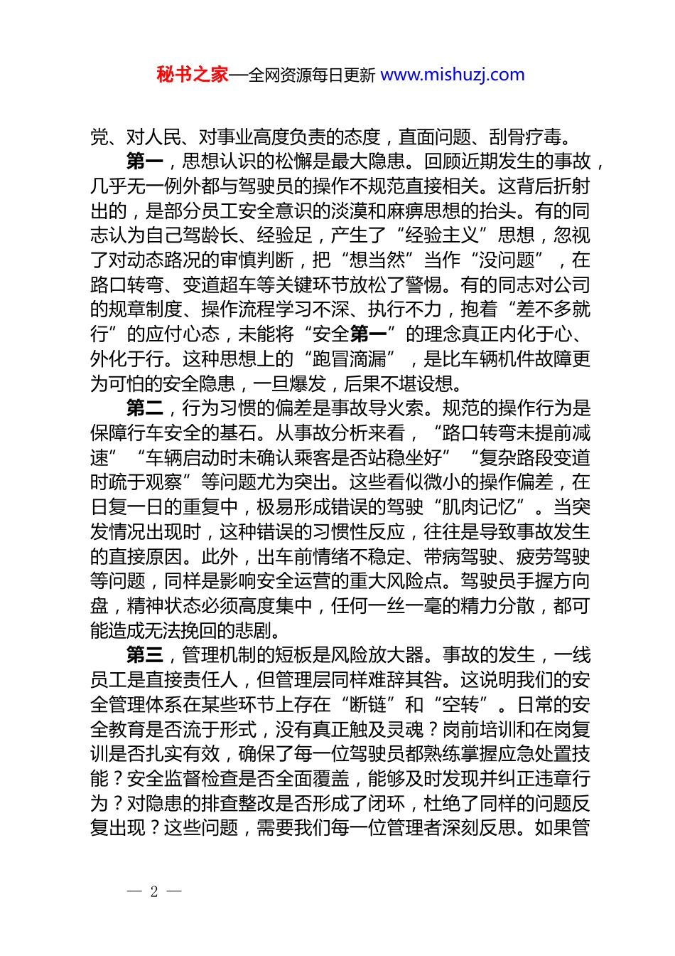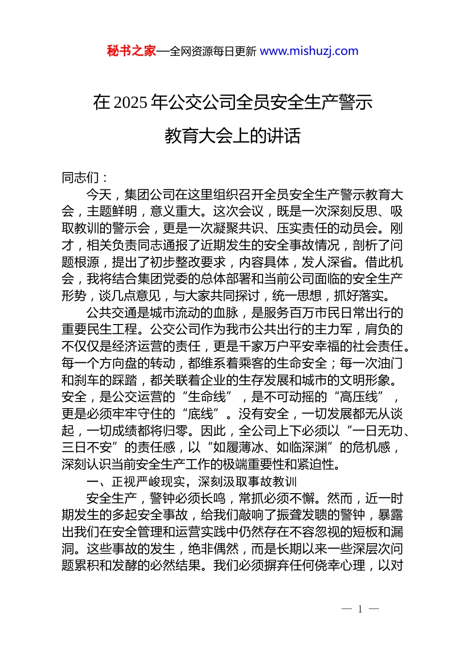 秘书之家—全网资源每日更新 www.mishuzj.com在 2025 年公交公司全员安全生产警示教育大会上的讲话同志们:今天,集团公司在这里组织召开全员安全生产警示教育大会,主题鲜明,意义重大。这次会议,既是一次深刻反思、吸取教训的警示会,更是一次凝聚共识、压实责任的动员会。刚才,相关负责同志通报了近期发生的安全事故情况,剖析了问题根源,提出了初步整改要求,内容具体,发人深省。借此机会,我将结合集团党委的总体部署和当前公司面临的安全生产形势,谈几点意见,与大家共同探讨,统一思想,抓好落实。公共交通是城市流动的血脉,是服务百万市民日常出行的重要民生工程。公交公司作为我市公共出行的主力军,肩负的不仅仅是经济运营的责任,更是千家万户平安幸福的社会责任。每一个方向盘的转动,都维系着乘客的生命安全;每一次油门和刹车的踩踏,都关联着企业的生存发展和城市的文明形象。安全,是公交运营的“生命线”,是不可动摇的“高压线”,更是必须牢牢守住的“底线”。没有安全,一切发展都无从谈起,一切成绩都将归零。因此,全公司上下必须以“一日无功、三日不安”的责任感,以“如履薄冰、如临深渊”的危机感,深刻认识当前安全生产工作的极端重要性和紧迫性。一、正视严峻现实,深刻汲取事故教训安全生产,警钟必须长鸣,常抓必须不懈。然而,近一时期发生的多起安全事故,给我们敲响了振聋发聩的警钟,暴露出我们在安全管理和运营实践中仍然存在不容忽视的短板和漏洞。这些事故的发生,绝非偶然,而是长期以来一些深层次问题累积和发酵的必然结果。我们必须摒弃任何侥幸心理,以对— 1 —秘书之家—全网资源每日更新 www.mishuzj.com党、对人民、对事业高度负责的态度,直面问题、刮骨疗毒。第一,思想认识的松懈是最大隐患。回顾近期发生的事故,几乎无一例外都与驾驶员的操作不规范直接相关。这背后折射出的,是部分员工安全意识的淡漠和麻痹思想的抬头。有的同志认为自己驾龄长、经验足,产生了“经验主义”思想,忽视了对动态路况的审慎判断,把“想当然”当作“没问题”,在路口转弯、变道超车等关键环节放松了警惕。有的同志对公司的规章制度、操作流程学习不深、执行不力,抱着“差不多就行”的应付心态,未能将“安全第一”的理念真正内化于心、外化于行。这种思想上的“跑冒滴漏”,是比车辆机件故障更为可怕的安全隐患,一旦爆发,后果不堪设想。第二,行为习惯的偏差是事故导火索。规范的操作行为是保障行车安全的基石。从事故分析来看,“路口转弯未提前减速”“车辆启动时未确认乘客是否站稳坐好”“复杂路段变道时疏于观察”等问题尤为突出。这些看似微小的操作偏差,在日复一日的重复中,极易形成错误的驾驶“肌肉记忆”。当突发情况出现时,这种错误的习惯性反应,往往是导致事故发生的直接原因。此外,出车前情绪不稳定、带病驾驶、疲劳驾驶等问题,同样是影响安全运营的重大风险点。驾驶员手握方向盘,精神状态必须高度集中,任何一丝一毫的精力分散,都可能造成无法挽回的悲剧。第三,管理机制的短板是风险放大器。事故的发生,一线员工是直接责任人,但管理层同样难辞其咎。这说明我们的安全管理体系在某些环节上存在“断链”和“空转”。日常的安全教育是否流于形式,没有真正触及灵魂?岗前培训和在岗复训是否扎实有效,确保了每一位驾驶员都熟练掌握应急处置技能?安全监督检查是否全面覆盖,能够及时发现并纠正违章行为?对隐患的排查整改是否形成了闭环,杜绝了同样的问题反复出现?这些问题,需要我们每一位管理者深刻反思。如果管— 2 —秘书之家—全网资源每日更新 www.mishuzj.com理有漏洞、监督不到位、考核不严格,就等于为事故的发生打开了方便之门,放大了潜在的风险。同志们,血的教训必须用铁的纪律来回应。公司明确提出对违规操作将采取“零容忍”态度,对于屡教不改者,将按照重大安全隐患处置,坚决予以开除。这不是不近人情,而是对全体乘客生命安全负责,对全体遵纪守规的员工负责,更是对企业长远发展负责。希望每一位员工都能从这些事故中吸取教训,举一反三,真正做到“一子落错,满盘皆输”的清醒和...
