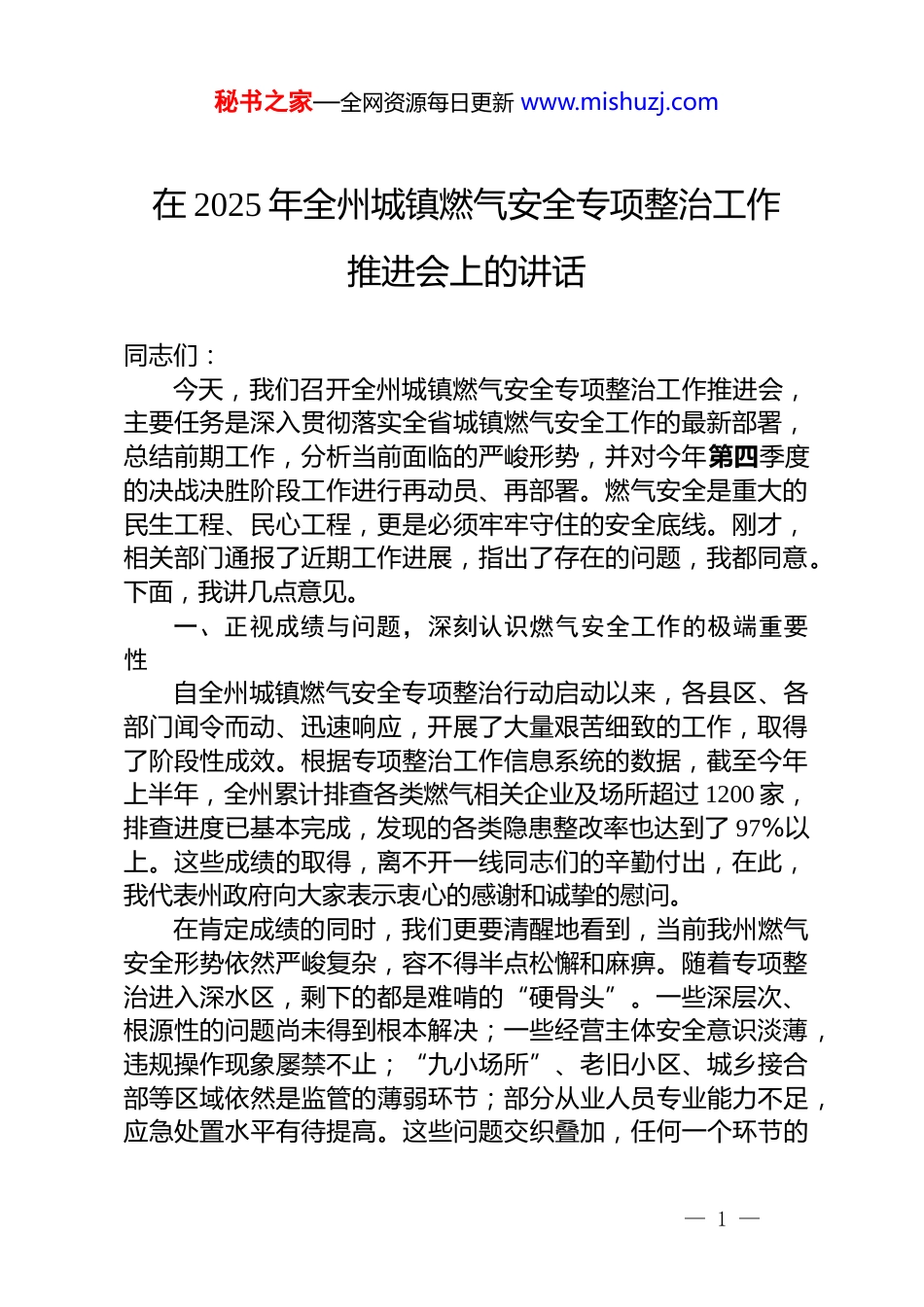 秘书之家—全网资源每日更新 www.mishuzj.com在 2025 年全州城镇燃气安全专项整治工作推进会上的讲话同志们:今天,我们召开全州城镇燃气安全专项整治工作推进会,主要任务是深入贯彻落实全省城镇燃气安全工作的最新部署,总结前期工作,分析当前面临的严峻形势,并对今年第四季度的决战决胜阶段工作进行再动员、再部署。燃气安全是重大的民生工程、民心工程,更是必须牢牢守住的安全底线。刚才,相关部门通报了近期工作进展,指出了存在的问题,我都同意。下面,我讲几点意见。一、正视成绩与问题,深刻认识燃气安全工作的极端重要性自全州城镇燃气安全专项整治行动启动以来,各县区、各部门闻令而动、迅速响应,开展了大量艰苦细致的工作,取得了阶段性成效。根据专项整治工作信息系统的数据,截至今年上半年,全州累计排查各类燃气相关企业及场所超过 1200 家,排查进度已基本完成,发现的各类隐患整改率也达到了 97%以上。这些成绩的取得,离不开一线同志们的辛勤付出,在此,我代表州政府向大家表示衷心的感谢和诚挚的慰问。在肯定成绩的同时,我们更要清醒地看到,当前我州燃气安全形势依然严峻复杂,容不得半点松懈和麻痹。随着专项整治进入深水区,剩下的都是难啃的“硬骨头”。一些深层次、根源性的问题尚未得到根本解决;一些经营主体安全意识淡薄,违规操作现象屡禁不止;“九小场所”、老旧小区、城乡接合部等区域依然是监管的薄弱环节;部分从业人员专业能力不足,应急处置水平有待提高。这些问题交织叠加,任何一个环节的— 1 —秘书之家—全网资源每日更新 www.mishuzj.com疏漏,都可能引发重特大安全事故,给人民群众生命财产安全造成不可挽回的损失。安全生产,须臾不可放松。燃气安全工作,尤其需要我们时刻保持“如履薄冰、如临深渊”的警觉和“时时放心不下”的责任感。全州上下必须从讲政治、保民生、护稳定的高度,深刻认识做好这项工作的极端重要性和现实紧迫性,切实把思想和行动统一到省委、省政府和州委、州政府的决策部署上来,以最高的标准、最严的要求、最实的举措,坚决打赢这场燃气安全专项整治的攻坚战。二、坚持问题导向,开展彻底的“起底式”隐患排查隐患险于明火,防范胜于救灾。排查是整治的前提,只有把底数摸清、把问题找准,后续工作才能有的放矢。会议要求,要立即组织开展“起底式”“全覆盖”的隐患排查,这绝不是一句空话,而是必须不折不扣执行的硬任务。所谓“起底式”,就是要穿透表层、深挖根源,实现“全覆盖、清底数、无盲区”。一是要聚焦排查重点,实现精准发力。排查工作不能搞“大水漫灌”,必须紧盯关键领域和薄弱环节。要重点围绕“问题气、问题瓶、问题阀、问题管、问题灶、问题环境”等全链条风险点,对燃气经营、充装、运输、储存、使用等各个环节进行无死角检查。特别是餐饮等公共场所、劳动密集型企业、老旧小区、城中村等区域,要作为重中之重,逐户、逐企、逐店过筛子。要坚决取缔无证经营、非法储存、跨区域违规供气等行为,严厉打击“黑气瓶”“黑窝点”,从源头上消除风险。二是要创新排查方式,提升排查效能。传统的排查方式有人力、时间的局限。各县区、各部门要积极探索“部门联合、专家指导、企业自查、群众举报”相结合的立体化排查模式。要充分发挥网格化管理优势,将燃气安全排查纳入基层网格员的日常巡查范围。要善于借助第三方专业机构的技术力量,对— 2 —秘书之家—全网资源每日更新 www.mishuzj.com燃气管网、重要设施进行全面“体检”。同时,要畅通投诉举报渠道,鼓励群众成为燃气安全的“吹哨人”,形成全社会共同参与监督的良好局面。三是要建立闭环台账,确保动态清零。排查出的每一个问题,都必须建立详细的隐患台账,明确问题清单、责任清单和整改清单。要严格按照“谁排查、谁签字、谁负责”的原则,将责任落实到具体单位和个人。对于一般隐患,要责令立即整改或限期整改;对于重大隐患,必须实行挂牌督办,由州、县两级专班跟踪问效,确保整改一个、销号一个,实现隐患的动态清零和闭环管理。决不能让问题清单变成“睡眠清单”,坚决杜绝“带病运行”现象的存在。三、狠抓关...
