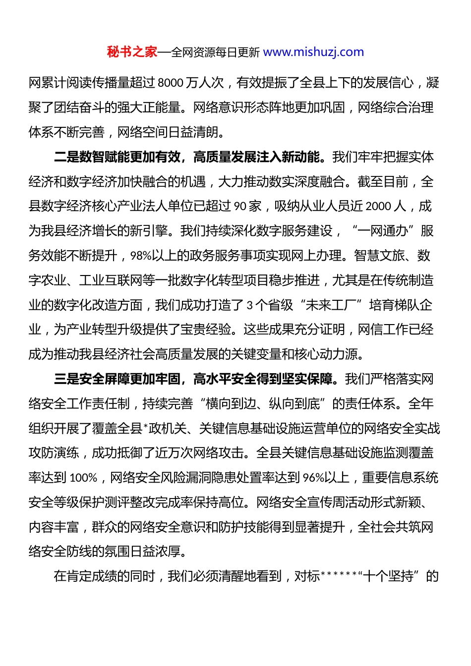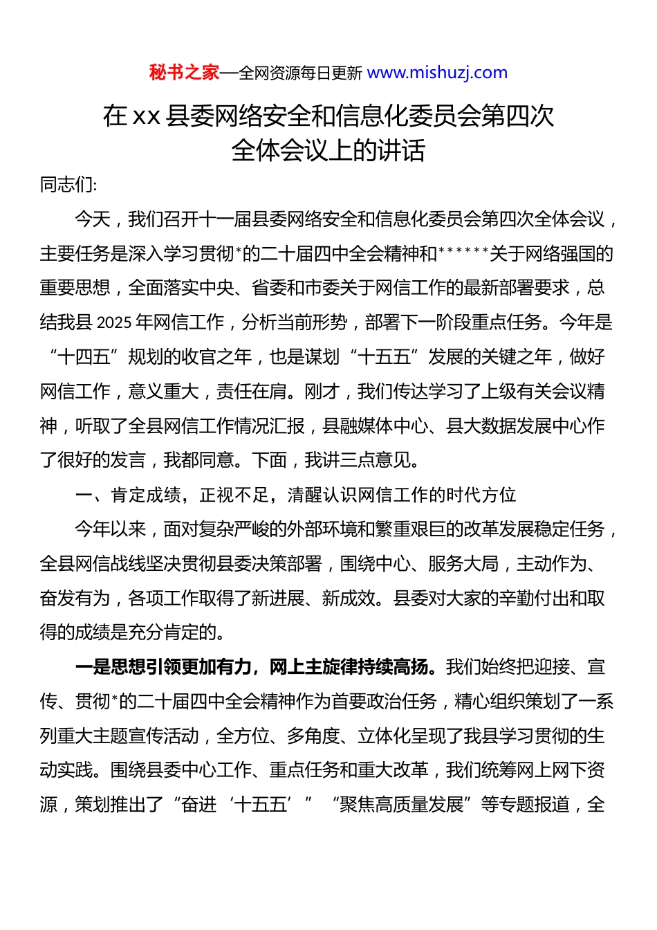 秘书之家—全网资源每日更新 www.mishuzj.com在 xx 县委网络安全和信息化委员会第四次全体会议上的讲话同志们:今天,我们召开十一届县委网络安全和信息化委员会第四次全体会议,主要任务是深入学习贯彻*的二十届四中全会精神和******关于网络强国的重要思想,全面落实中央、省委和市委关于网信工作的最新部署要求,总结我县 2025 年网信工作,分析当前形势,部署下一阶段重点任务。今年是“十四五”规划的收官之年,也是谋划“十五五”发展的关键之年,做好网信工作,意义重大,责任在肩。刚才,我们传达学习了上级有关会议精神,听取了全县网信工作情况汇报,县融媒体中心、县大数据发展中心作了很好的发言,我都同意。下面,我讲三点意见。一、肯定成绩,正视不足,清醒认识网信工作的时代方位今年以来,面对复杂严峻的外部环境和繁重艰巨的改革发展稳定任务,全县网信战线坚决贯彻县委决策部署,围绕中心、服务大局,主动作为、奋发有为,各项工作取得了新进展、新成效。县委对大家的辛勤付出和取得的成绩是充分肯定的。一是思想引领更加有力,网上主旋律持续高扬。我们始终把迎接、宣传、贯彻*的二十届四中全会精神作为首要政治任务,精心组织策划了一系列重大主题宣传活动,全方位、多角度、立体化呈现了我县学习贯彻的生动实践。围绕县委中心工作、重点任务和重大改革,我们统筹网上网下资源,策划推出了“奋进‘十五五’”“聚焦高质量发展”等专题报道,全秘书之家—全网资源每日更新 www.mishuzj.com网累计阅读传播量超过 8000 万人次,有效提振了全县上下的发展信心,凝聚了团结奋斗的强大正能量。网络意识形态阵地更加巩固,网络综合治理体系不断完善,网络空间日益清朗。二是数智赋能更加有效,高质量发展注入新动能。我们牢牢把握实体经济和数字经济加快融合的机遇,大力推动数实深度融合。截至目前,全县数字经济核心产业法人单位已超过 90 家,吸纳从业人员近 2000 人,成为我县经济增长的新引擎。我们持续深化数字服务建设,“一网通办”服务效能不断提升,98%以上的政务服务事项实现网上办理。智慧文旅、数字农业、工业互联网等一批数字化转型项目稳步推进,尤其是在传统制造业的数字化改造方面,我们成功打造了 3 个省级“未来工厂”培育梯队企业,为产业转型升级提供了宝贵经验。这些成果充分证明,网信工作已经成为推动我县经济社会高质量发展的关键变量和核心动力源。三是安全屏障更加牢固,高水平安全得到坚实保障。我们严格落实网络安全工作责任制,持续完善“横向到边、纵向到底”的责任体系。全年组织开展了覆盖全县*政机关、关键信息基础设施运营单位的网络安全实战攻防演练,成功抵御了近万次网络攻击。全县关键信息基础设施监测覆盖率达到 100%,网络安全风险漏洞隐患处置率达到 96%以上,重要信息系统安全等级保护测评整改完成率保持高位。网络安全宣传周活动形式新颖、内容丰富,群众的网络安全意识和防护技能得到显著提升,全社会共筑网络安全防线的氛围日益浓厚。在肯定成绩的同时,我们必须清醒地看到,对标******“十个坚持”的秘书之家—全网资源每日更新 www.mishuzj.com重要原则,对标省委、市委的高标准严要求,对标我县高质量发展的迫切需要,我们的工作还存在一些短板和不足。比如,网络安全人才队伍结构性短缺问题依然存在,高层次、实战型人才尤为紧缺;部分传统企业对数字化转型的认识还不够深刻,主动性不强,“不愿转、不敢转、不会转”的问题依然突出;数据孤岛现象尚未彻底根除,跨部门、跨层级的数据共享和业务协同还有待进一步加强;网络安全防护体系仍有薄弱环节,应对新型网络攻击和有组织网络犯罪的能力仍需提升。对于这些问题,我们必须高度重视,采取有力措施,切实加以解决。二、把握大势,抢抓机遇,深刻领会网信工作的使命任务同志们,网信事业代表着新的生产力和新的发展方向。我们必须胸怀“国之大者”,深刻认识和把握网信工作面临的新形势新挑战,在服务大局中找准定位、明确方向。第一,必须从践行“两个维护”的政治高度,深刻把握网信工作的根本原则。做好网信工作,首要的是讲政治。******关于网...