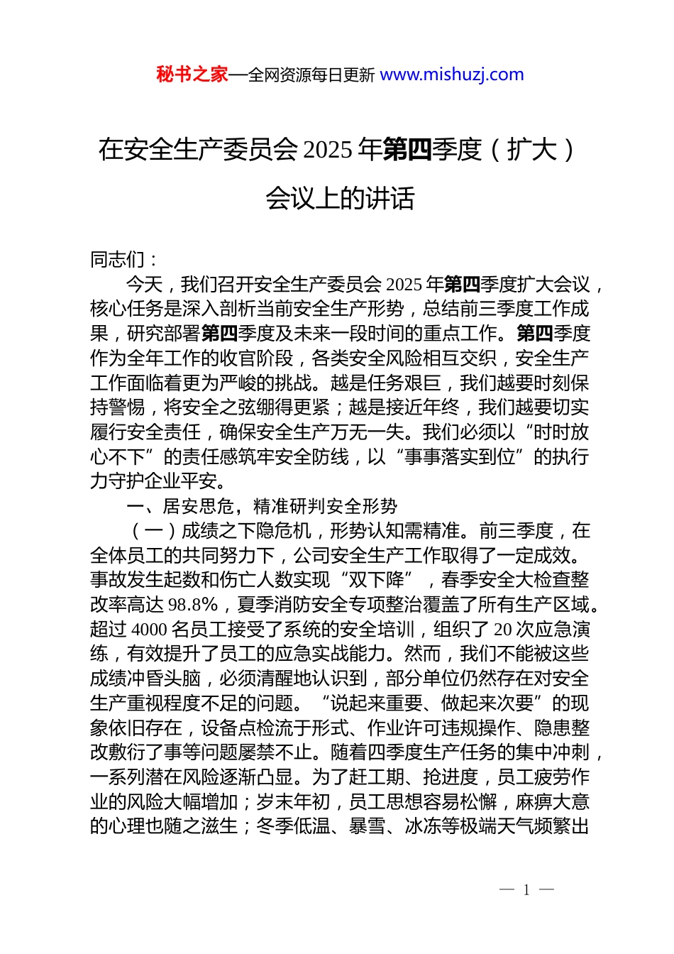 秘书之家—全网资源每日更新 www.mishuzj.com在安全生产委员会 2025 年第四季度(扩大)会议上的讲话同志们:今天,我们召开安全生产委员会 2025 年第四季度扩大会议,核心任务是深入剖析当前安全生产形势,总结前三季度工作成果,研究部署第四季度及未来一段时间的重点工作。第四季度作为全年工作的收官阶段,各类安全风险相互交织,安全生产工作面临着更为严峻的挑战。越是任务艰巨,我们越要时刻保持警惕,将安全之弦绷得更紧;越是接近年终,我们越要切实履行安全责任,确保安全生产万无一失。我们必须以“时时放心不下”的责任感筑牢安全防线,以“事事落实到位”的执行力守护企业平安。一、居安思危,精准研判安全形势(一)成绩之下隐危机,形势认知需精准。前三季度,在全体员工的共同努力下,公司安全生产工作取得了一定成效。事故发生起数和伤亡人数实现“双下降”,春季安全大检查整改率高达 98.8%,夏季消防安全专项整治覆盖了所有生产区域。超过 4000 名员工接受了系统的安全培训,组织了 20 次应急演练,有效提升了员工的应急实战能力。然而,我们不能被这些成绩冲昏头脑,必须清醒地认识到,部分单位仍然存在对安全生产重视程度不足的问题。“说起来重要、做起来次要”的现象依旧存在,设备点检流于形式、作业许可违规操作、隐患整改敷衍了事等问题屡禁不止。随着四季度生产任务的集中冲刺,一系列潜在风险逐渐凸显。为了赶工期、抢进度,员工疲劳作业的风险大幅增加;岁末年初,员工思想容易松懈,麻痹大意的心理也随之滋生;冬季低温、暴雪、冰冻等极端天气频繁出— 1 —秘书之家—全网资源每日更新 www.mishuzj.com现,给生产环境带来了诸多不利影响。这“三重压力”相互叠加,犹如悬在我们头顶的“达摩克利斯之剑”,稍有疏忽就可能引发严重的安全事故。(二)安全发展相融合,理念树立要牢固。安全生产与企业发展相辅相成、密不可分。安全生产是企业发展的前提和基础,没有安全保障,企业的发展就如空中楼阁,随时可能崩塌。我们必须深刻认识到,抓安全就是抓发展,在事故面前,没有任何企业能够独善其身。一次小小的违规操作,可能导致宝贵的生命消逝;一起看似不起眼的设备故障,可能让企业多年的努力付诸东流。近年来,行业内发生的多起重特大安全事故给我们敲响了警钟。这些惨痛的教训告诉我们,安全和生产并非二选一的选择题,而是企业必须同时答好的必答题。脱离安全的发展是不切实际的“空中楼阁”,忽视安全的效益是虚幻的“海市蜃楼”。各级管理人员要坚决摒弃“安全只是安全部门的事”这种错误观念,将“安全第一、预防为主”的理念贯穿于生产经营的每一个环节,让“我要安全”成为全体员工的自觉意识和实际行动。(三)常态长效相结合,底线思维需强化。当前,公司正处于数字化转型和智能化升级的关键时期。机器人巡检、自动化生产线、智能监控系统等新技术、新设备的广泛应用,在提高生产效率的同时,也带来了一系列新的安全挑战。有限空间作业、危险化学品储存与运输等传统安全风险,与新技术带来的网络安全、数据安全等风险相互交织,使得安全管理的难度进一步加大。四季度向来是安全事故的高发期。电气火灾、设备冻裂、人员冻伤等季节性安全隐患不容忽视。我们必须树立“隐患就是事故”的底线思维,既要集中力量解决当前存在的突出安全问题,又要着眼长远,建立健全安全生产的长效机制。要以严谨细致的态度全面排查安全隐患,像“啄木鸟”一样不放过任何一个细微的问题;以坚韧不拔的毅力抓好隐患整改,— 2 —秘书之家—全网资源每日更新 www.mishuzj.com确保每一个安全隐患都能得到彻底消除。要将安全生产工作常态化、日常化,融入到企业生产经营的每一个细节中。二、警钟长鸣,构建全员防控体系(一)源头把控筑防线,风险辨识无盲区。风险管控是安全生产的首要环节,如同守护企业安全的“第一道大门”。各部门和车间要按照全面覆盖、不留死角的原则,对生产全过程进行深入细致的风险排查。重点关注生产工艺参数的变化、设备的运行状况、作业环境的安全等关键因素,建立详细的风险清单和设备档案,确保每一个岗位、每一台设...
