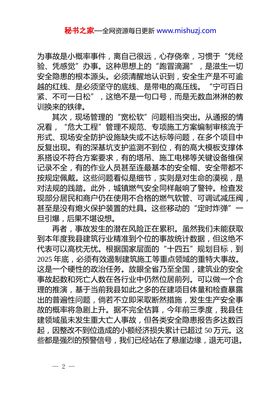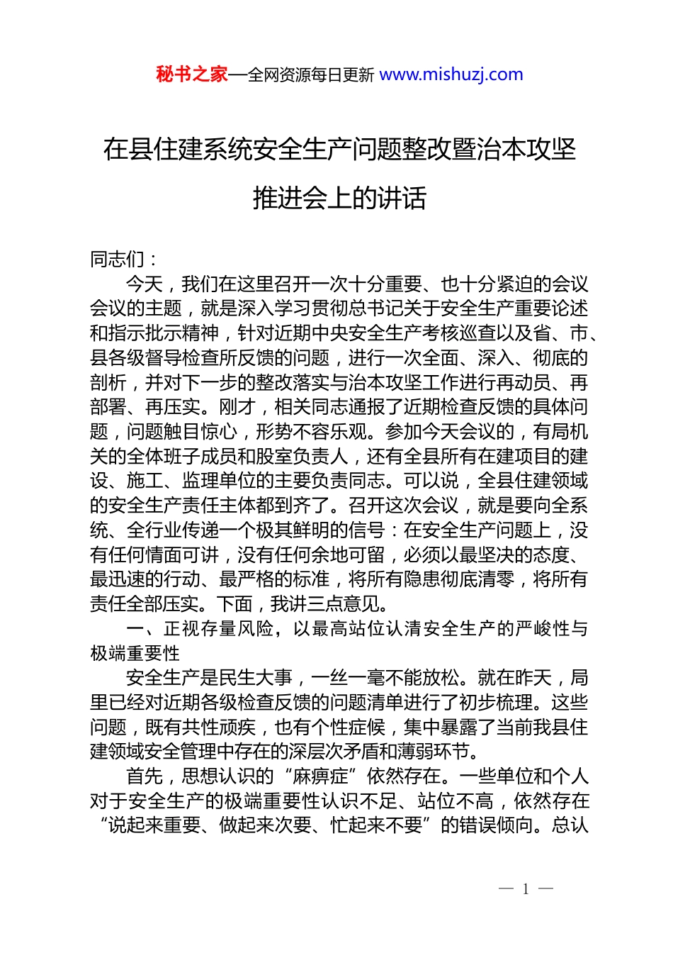 秘书之家—全网资源每日更新 www.mishuzj.com在县住建系统安全生产问题整改暨治本攻坚推进会上的讲话同志们:今天,我们在这里召开一次十分重要、也十分紧迫的会议会议的主题,就是深入学习贯彻总书记关于安全生产重要论述和指示批示精神,针对近期中央安全生产考核巡查以及省、市、县各级督导检查所反馈的问题,进行一次全面、深入、彻底的剖析,并对下一步的整改落实与治本攻坚工作进行再动员、再部署、再压实。刚才,相关同志通报了近期检查反馈的具体问题,问题触目惊心,形势不容乐观。参加今天会议的,有局机关的全体班子成员和股室负责人,还有全县所有在建项目的建设、施工、监理单位的主要负责同志。可以说,全县住建领域的安全生产责任主体都到齐了。召开这次会议,就是要向全系统、全行业传递一个极其鲜明的信号:在安全生产问题上,没有任何情面可讲,没有任何余地可留,必须以最坚决的态度、最迅速的行动、最严格的标准,将所有隐患彻底清零,将所有责任全部压实。下面,我讲三点意见。一、正视存量风险,以最高站位认清安全生产的严峻性与极端重要性安全生产是民生大事,一丝一毫不能放松。就在昨天,局里已经对近期各级检查反馈的问题清单进行了初步梳理。这些问题,既有共性顽疾,也有个性症候,集中暴露了当前我县住建领域安全管理中存在的深层次矛盾和薄弱环节。首先,思想认识的“麻痹症”依然存在。一些单位和个人对于安全生产的极端重要性认识不足、站位不高,依然存在“说起来重要、做起来次要、忙起来不要”的错误倾向。总认— 1 —秘书之家—全网资源每日更新 www.mishuzj.com为事故是小概率事件,离自己很远,心存侥幸,习惯于“凭经验、凭感觉”办事。这种思想上的“跑冒滴漏”,是滋生一切安全隐患的根本源头。必须清醒地认识到,安全生产是不可逾越的红线、是必须坚守的底线、是带电的高压线。“宁可百日紧、不可一日松”,这绝不是一句口号,而是无数血淋淋的教训换来的铁律。其次,现场管理的“宽松软”问题相当突出。从通报的情况看,“危大工程”管理不规范、专项施工方案编制审核流于形式、现场安全防护设施缺失或不达标等问题,在多个项目中反复出现。有的深基坑支护监测不到位,有的高大模板支撑体系搭设不符合方案要求,有的塔吊、施工电梯等关键设备维保记录不全,有的作业人员甚至连最基本的安全帽、安全带都不按规定佩戴。这些问题看似是细节,实则是对生命的漠视,是对法规的践踏。此外,城镇燃气安全同样敲响了警钟。检查发现部分居民和商户仍在使用不合格的燃气软管、可调试减压阀,甚至是没有熄火保护装置的灶具。这些移动的“定时炸弹”一旦引爆,后果不堪设想。再者,事故发生的潜在风险正在累积。虽然我们未能获取到本年度我县建筑行业精准到个位的事故统计数据,但这绝不代表可以高枕无忧。根据国家层面的“十四五”规划目标,到2025 年底,必须有效遏制建筑施工等重点领域的重特大事故。这是一个硬性的政治任务。放眼全省乃至全国,建筑业的安全事故起数和死亡人数在各行业中仍然位居前列。可以做一个合理的推演,基于当前我县如此之多的在建项目体量和检查暴露出的普遍性问题,倘若不立即采取断然措施,发生生产安全事故的概率将急剧上升。据不完全估算,今年前三季度,我县住建领域虽未发生重大亡人事故,但各类安全隐患报告多达数百起,因整改不到位造成的小额经济损失累计已超过 50 万元。这些都是强烈的预警信号,我们已经站在了悬崖边缘,退无可退。— 2 —秘书之家—全网资源每日更新 www.mishuzj.com同志们,安全生产工作,是“一失万无”的工作,任何一次疏忽都可能造成无法挽回的损失。各单位、各企业必须立即从“要我安全”的被动应付,彻底转变为“我要安全、我懂安全、我能安全”的主动作为,真正把人民群众的生命财产安全放在第一位,把安全发展的理念贯穿于项目建设的全过程。二、聚焦问题清零,以最实举措打赢隐患整改的歼灭战与攻坚战面对问题清单,回避没有出路,拖延就是纵容。必须拿出“快、准、狠”的作风,分层级、分类别、分阶段地推进整改,确保所有问题见底清零,坚决防止问题反弹回潮。第一...