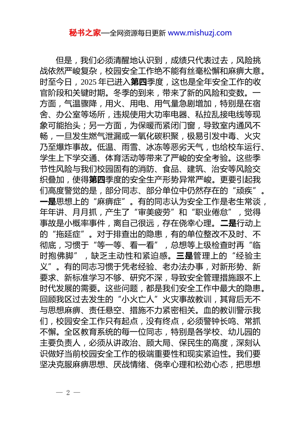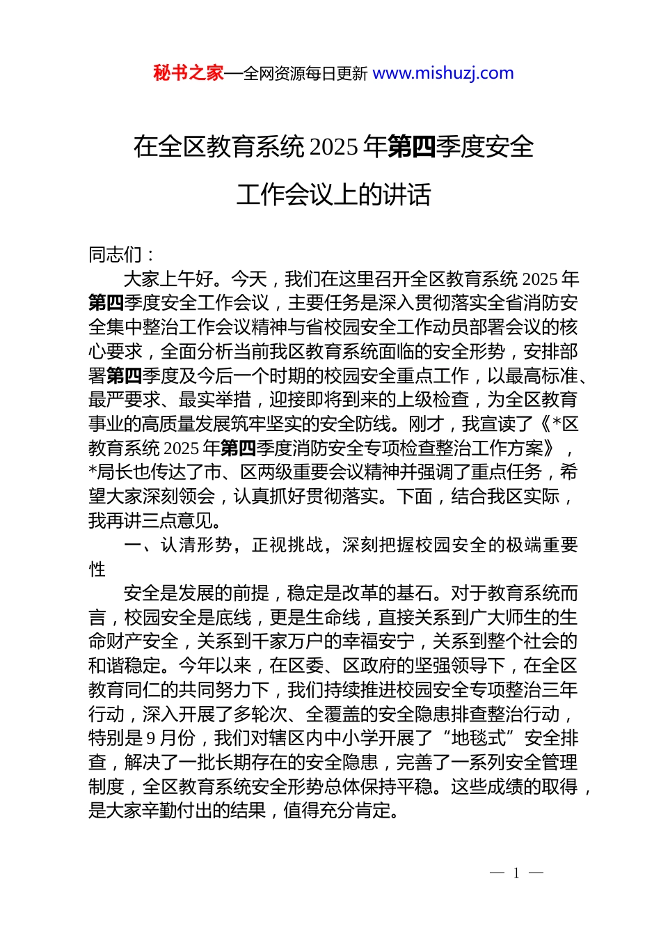 秘书之家—全网资源每日更新 www.mishuzj.com在全区教育系统 2025 年第四季度安全工作会议上的讲话同志们:大家上午好。今天,我们在这里召开全区教育系统 2025 年第四季度安全工作会议,主要任务是深入贯彻落实全省消防安全集中整治工作会议精神与省校园安全工作动员部署会议的核心要求,全面分析当前我区教育系统面临的安全形势,安排部署第四季度及今后一个时期的校园安全重点工作,以最高标准、最严要求、最实举措,迎接即将到来的上级检查,为全区教育事业的高质量发展筑牢坚实的安全防线。刚才,我宣读了《*区教育系统 2025 年第四季度消防安全专项检查整治工作方案》,*局长也传达了市、区两级重要会议精神并强调了重点任务,希望大家深刻领会,认真抓好贯彻落实。下面,结合我区实际,我再讲三点意见。一、认清形势,正视挑战,深刻把握校园安全的极端重要性安全是发展的前提,稳定是改革的基石。对于教育系统而言,校园安全是底线,更是生命线,直接关系到广大师生的生命财产安全,关系到千家万户的幸福安宁,关系到整个社会的和谐稳定。今年以来,在区委、区政府的坚强领导下,在全区教育同仁的共同努力下,我们持续推进校园安全专项整治三年行动,深入开展了多轮次、全覆盖的安全隐患排查整治行动,特别是 9 月份,我们对辖区内中小学开展了“地毯式”安全排查,解决了一批长期存在的安全隐患,完善了一系列安全管理制度,全区教育系统安全形势总体保持平稳。这些成绩的取得,是大家辛勤付出的结果,值得充分肯定。— 1 —秘书之家—全网资源每日更新 www.mishuzj.com但是,我们必须清醒地认识到,成绩只代表过去,风险挑战依然严峻复杂,校园安全工作绝不能有丝毫松懈和麻痹大意。时至今日,2025 年已进入第四季度,这也是全年安全工作的收官阶段和关键时期。冬季的到来,带来了新的风险和变数。一方面,气温骤降,用火、用电、用气量急剧增加,特别是在宿舍、办公室等场所,违规使用大功率电器、私拉乱接电线等现象可能抬头;另一方面,为保暖而紧闭门窗,导致室内通风不畅,一旦发生燃气泄漏或一氧化碳积聚,极易引发中毒、火灾乃至爆炸事故。低温、雨雪、冰冻等恶劣天气,也给校车运行、学生上下学交通、体育活动等带来了严峻的安全考验。这些季节性风险与我们校园固有的消防、食品、建筑、治安等风险交织叠加,使得第四季度的安全生产形势异常严峻。更要引起我们高度警觉的是,部分同志、部分单位中仍然存在的“顽疾”。一是思想上的“麻痹症”。有的同志认为安全工作是老生常谈,年年讲、月月抓,产生了“审美疲劳”和“职业倦怠”,觉得事故是小概率事件,离自己很远,存在侥幸心理。二是行动上的“拖延症”。对于排查出的隐患,有的单位整改不及时、不彻底,习惯于“等一等、看一看”,总想等上级检查时再“临时抱佛脚”,缺乏主动性和紧迫感。三是管理上的“经验主义”。有的同志习惯于凭老经验、老办法办事,对新形势、新要求、新标准学习不够、研究不深,导致安全管理措施跟不上时代发展的需要。这些问题,都是我们安全工作中最大的隐患。回顾我区过去发生的“小火亡人”火灾事故教训,其背后无不与思想麻痹、责任悬空、措施不力紧密相关。血的教训警示我们,校园安全工作只有起点,没有终点,必须警钟长鸣、常抓不懈。全区教育系统的每一位同志,特别是各学校、幼儿园的主要负责人,必须从讲政治、顾大局、保民生的高度,深刻认识做好当前校园安全工作的极端重要性和现实紧迫性。我们要坚决克服麻痹思想、厌战情绪、侥幸心理和松劲心态,把思想— 2 —秘书之家—全网资源每日更新 www.mishuzj.com和行动统一到省、市、区的决策部署上来,以“时时放心不下”的责任感和“眼睛瞪得大大的”敏锐性,把安全责任扛在肩上、抓在手上,以扎实有效的工作迎接上级检查,并向全区人民交上一份满意的“安全答卷”。二、聚焦重点,精准施策,全面筑牢校园安全防线第四季度校园安全工作头绪多、任务重。我们必须坚持问题导向、目标导向和结果导向,聚焦关键领域和薄弱环节,采取超常规的力度和措施,下好先手棋,打好主动仗,坚决防范和遏制重特大事故发...