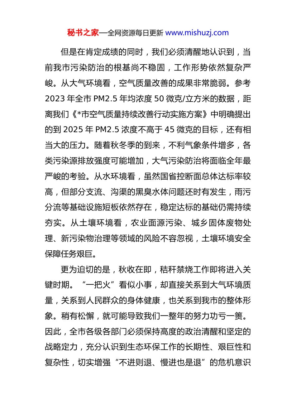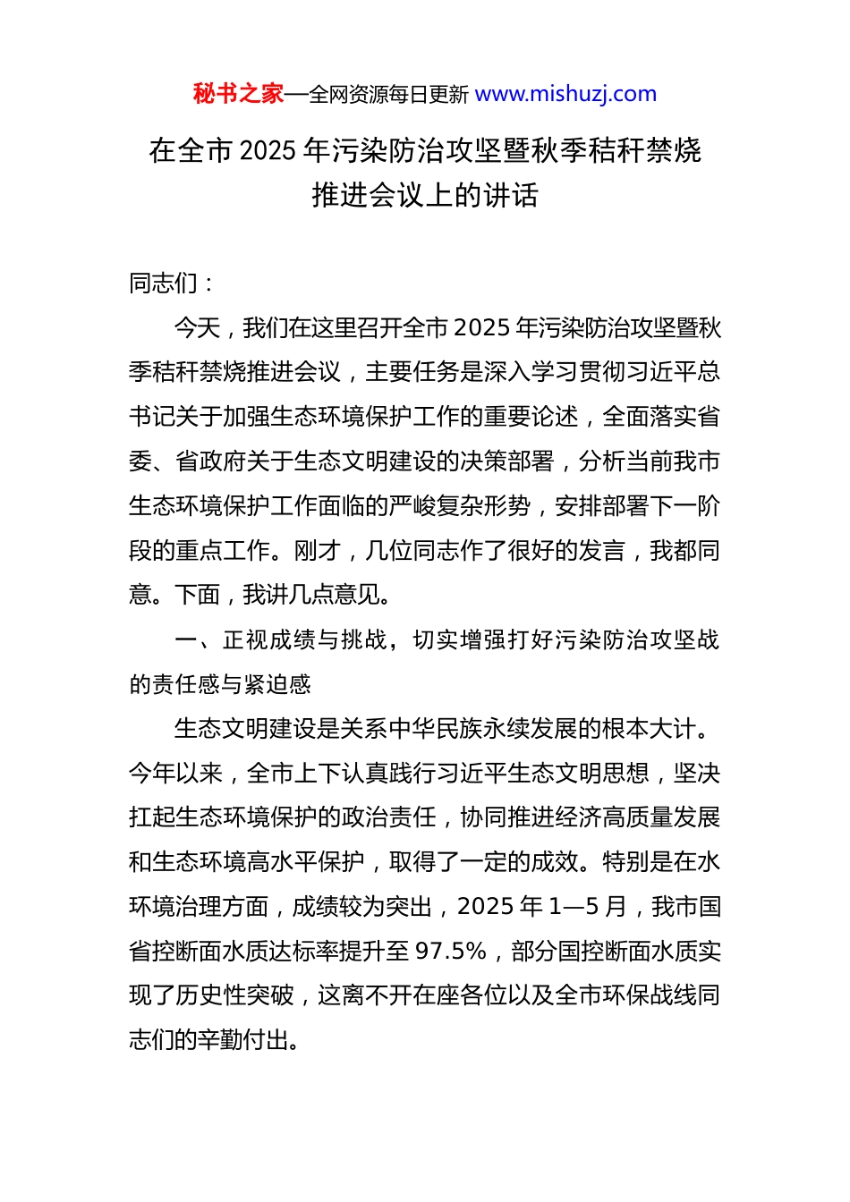 秘书之家—全网资源每日更新 www.mishuzj.com在全市 2025 年污染防治攻坚暨秋季秸秆禁烧推进会议上的讲话 同志们:今天,我们在这里召开全市 2025 年污染防治攻坚暨秋季秸秆禁烧推进会议,主要任务是深入学习贯彻习近平总书记关于加强生态环境保护工作的重要论述,全面落实省委、省政府关于生态文明建设的决策部署,分析当前我市生态环境保护工作面临的严峻复杂形势,安排部署下一阶段的重点工作。刚才,几位同志作了很好的发言,我都同意。下面,我讲几点意见。一、正视成绩与挑战,切实增强打好污染防治攻坚战的责任感与紧迫感生态文明建设是关系中华民族永续发展的根本大计。今年以来,全市上下认真践行习近平生态文明思想,坚决扛起生态环境保护的政治责任,协同推进经济高质量发展和生态环境高水平保护,取得了一定的成效。特别是在水环境治理方面,成绩较为突出,2025 年 1—5 月,我市国省控断面水质达标率提升至 97.5%,部分国控断面水质实现了历史性突破,这离不开在座各位以及全市环保战线同志们的辛勤付出。秘书之家—全网资源每日更新 www.mishuzj.com但是在肯定成绩的同时,我们必须清醒地认识到,当前我市污染防治的根基尚不稳固,工作形势依然复杂严峻。从大气环境看,空气质量改善的成果非常脆弱。参考2023 年全市 PM2.5 年均浓度 50 微克/立方米的数据,距离我们《*市空气质量持续改善行动实施方案》中明确提出的到 2025 年 PM2.5 浓度不高于 45 微克的目标,还有相当大的压力。随着秋冬季的到来,不利气象条件增多,各类污染源排放强度可能增加,大气污染防治将面临全年最严峻的考验。从水环境看,虽然国省控断面总体达标率较高,但部分支流、沟渠的黑臭水体问题还时有发生,雨污分流等基础设施短板依然存在,稳定达标的基础仍需持续夯实。从土壤环境看,农业面源污染、城乡固体废物处理、新污染物治理等领域的风险不容忽视,土壤环境安全保障任务艰巨。更为迫切的是,秋收在即,秸秆禁烧工作即将进入关键时期。“一把火”看似小事,却直接关系到大气环境质量,关系到人民群众的身体健康,也关系到我市的整体形象。稍有松懈,就可能导致我们一整年的努力功亏一篑。因此,全市各级各部门必须保持高度的政治清醒和坚定的战略定力,充分认识到生态环保工作的长期性、艰巨性和复杂性,切实增强“不进则退、慢进也是退”的危机意识秘书之家—全网资源每日更新 www.mishuzj.com和紧迫感,以“时时放心不下”的责任感,把各项工作抓得更紧、更实、更细。二、聚焦重点领域与关键环节,以精准有力的举措推动环境质量持续改善打好污染防治攻坚战,必须坚持问题导向、目标导向、结果导向,抓住主要矛盾和矛盾的主要方面,精准施策、靶向发力。第一,深化系统治理,坚决打赢蓝天保卫战。大气污染治理是一项系统工程,必须坚持源头治理、综合施策。要紧盯 PM2.5 浓度这一核心指标,对各类污染源进行全方位、全链条的管控。一是要严控工业企业污染。严格执行重污染行业超低排放标准,对钢铁、焦化、水泥等重点行业的无组织排放进行深度治理。推广使用清洁生产技术,从源头上减少污染物排放。二是要严控移动源污染。持续优化调整运输结构,大力发展公铁联运、水铁联运,减少公路货物运输量。加快老旧柴油货车淘汰更新进度,推广应用新能源汽车,加强对非道路移动机械的监管。三是要严控扬尘污染。严格落实建筑工地“六个百分之百”要求,强化道路清扫保洁,对重点区域实施精细化管理。针对秋冬季易发扬尘的特点,要加大洒水、喷雾等降尘作业频次。四是要严控生活源污染。加强餐饮油烟净化设施安秘书之家—全网资源每日更新 www.mishuzj.com装、使用和维护的监管,持续推进散煤清洁能源替代,确保人民群众温暖过冬、清洁过冬。第二,强化标本兼治,持续筑牢水环境安全屏障。水是生命之源、生态之基。必须坚持“保好水、治差水”并重,统筹水资源、水环境、水生态治理。一是要加快补齐基础设施短板。全力推进城镇污水处理厂提标改造和配套管网建设,提高污水收集率和处理效能。系统规划和实施城市雨污分流改造工程,从根本上减少雨季溢流污染。二是要强...