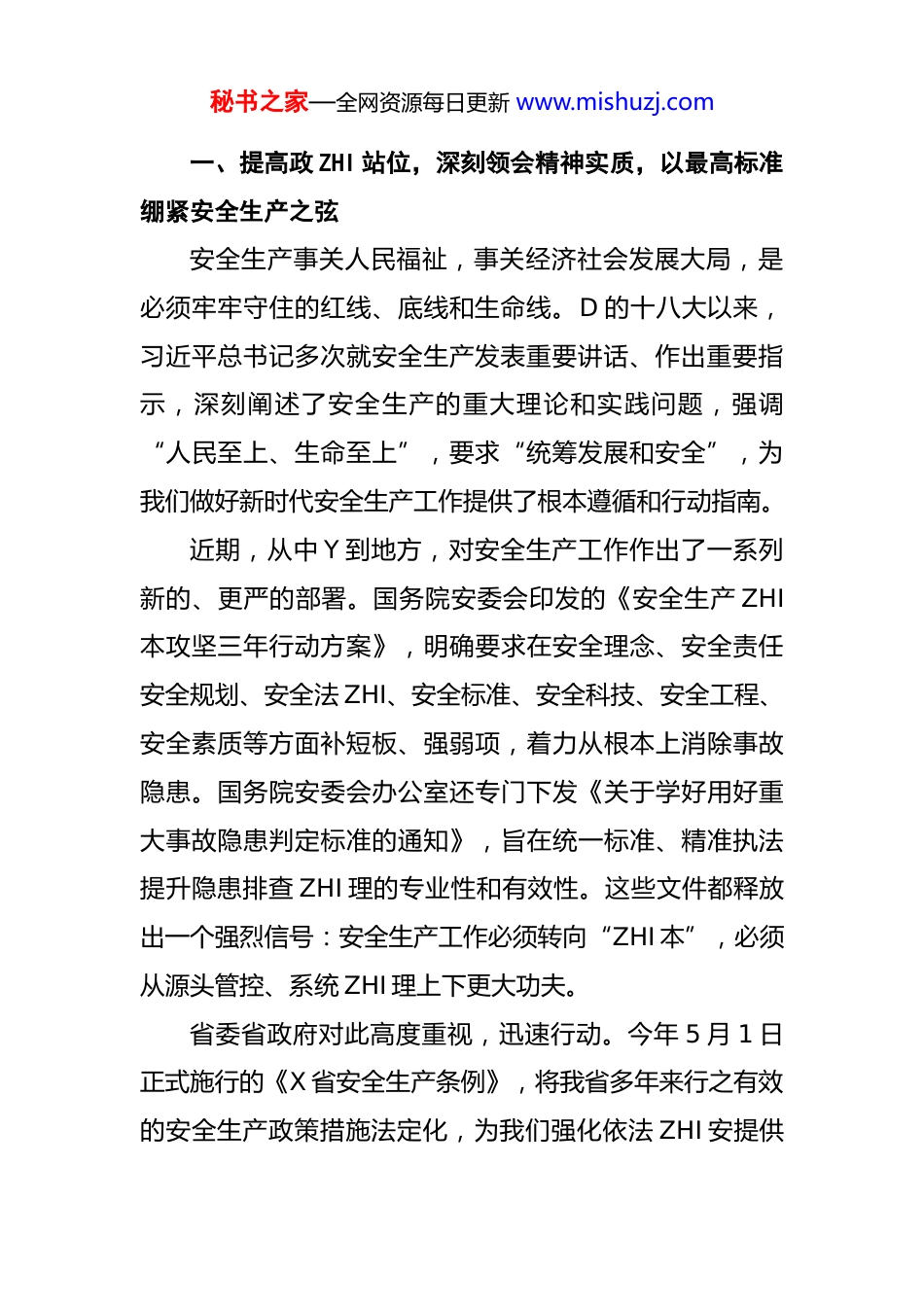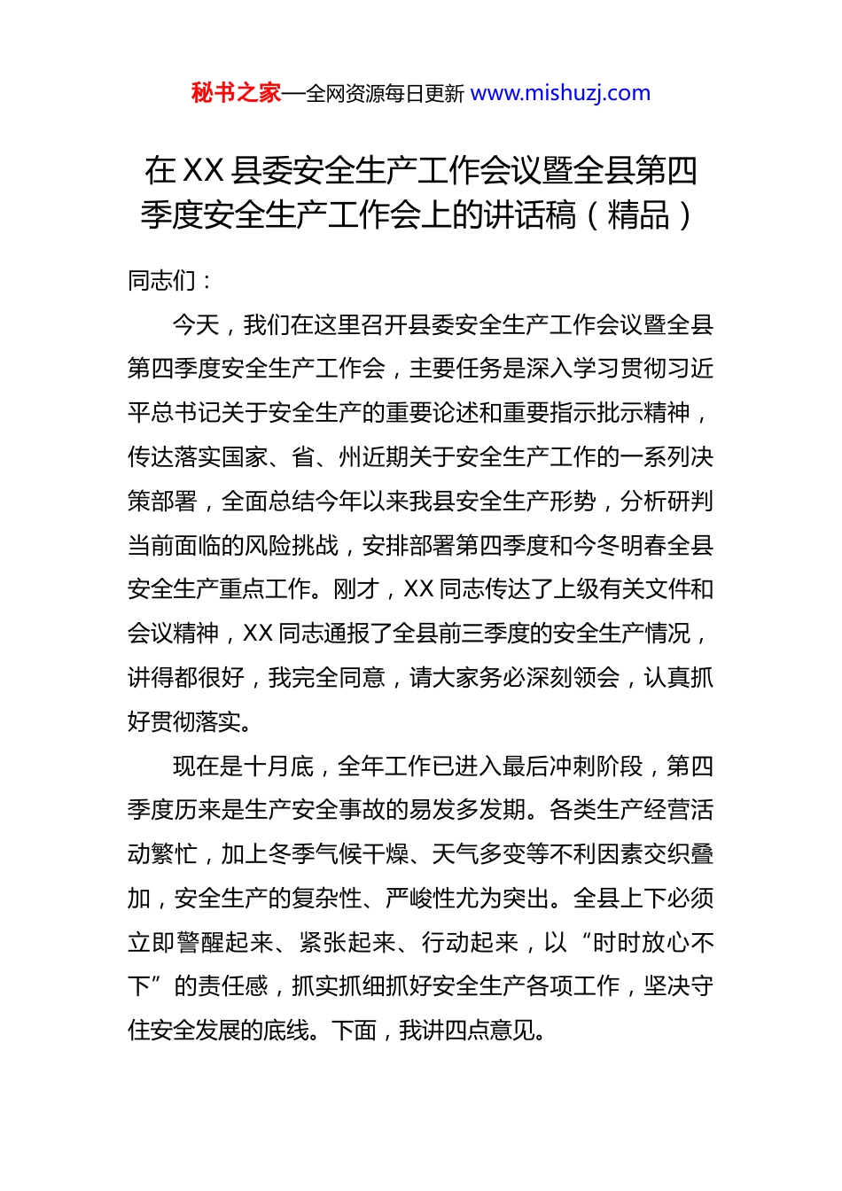 秘书之家—全网资源每日更新 www.mishuzj.com在 XX 县委安全生产工作会议暨全县第四季度安全生产工作会上的讲话稿(精品)同志们:今天,我们在这里召开县委安全生产工作会议暨全县第四季度安全生产工作会,主要任务是深入学习贯彻习近平总书记关于安全生产的重要论述和重要指示批示精神,传达落实国家、省、州近期关于安全生产工作的一系列决策部署,全面总结今年以来我县安全生产形势,分析研判当前面临的风险挑战,安排部署第四季度和今冬明春全县安全生产重点工作。刚才,XX 同志传达了上级有关文件和会议精神,XX 同志通报了全县前三季度的安全生产情况,讲得都很好,我完全同意,请大家务必深刻领会,认真抓好贯彻落实。现在是十月底,全年工作已进入最后冲刺阶段,第四季度历来是生产安全事故的易发多发期。各类生产经营活动繁忙,加上冬季气候干燥、天气多变等不利因素交织叠加,安全生产的复杂性、严峻性尤为突出。全县上下必须立即警醒起来、紧张起来、行动起来,以“时时放心不下”的责任感,抓实抓细抓好安全生产各项工作,坚决守住安全发展的底线。下面,我讲四点意见。秘书之家—全网资源每日更新 www.mishuzj.com一、提高政 ZHI 站位,深刻领会精神实质,以最高标准绷紧安全生产之弦安全生产事关人民福祉,事关经济社会发展大局,是必须牢牢守住的红线、底线和生命线。D 的十八大以来,习近平总书记多次就安全生产发表重要讲话、作出重要指示,深刻阐述了安全生产的重大理论和实践问题,强调“人民至上、生命至上”,要求“统筹发展和安全”,为我们做好新时代安全生产工作提供了根本遵循和行动指南。近期,从中 Y 到地方,对安全生产工作作出了一系列新的、更严的部署。国务院安委会印发的《安全生产 ZHI本攻坚三年行动方案》,明确要求在安全理念、安全责任安全规划、安全法 ZHI、安全标准、安全科技、安全工程、安全素质等方面补短板、强弱项,着力从根本上消除事故隐患。国务院安委会办公室还专门下发《关于学好用好重大事故隐患判定标准的通知》,旨在统一标准、精准执法提升隐患排查 ZHI 理的专业性和有效性。这些文件都释放出一个强烈信号:安全生产工作必须转向“ZHI 本”,必须从源头管控、系统 ZHI 理上下更大功夫。省委省政府对此高度重视,迅速行动。今年 5 月 1 日正式施行的《X 省安全生产条例》,将我省多年来行之有效的安全生产政策措施法定化,为我们强化依法 ZHI 安提供秘书之家—全网资源每日更新 www.mishuzj.com了坚实的法制保障。省安委会也结合我省实际,印发了《X省安全生产 ZHI 本攻坚三年行动总体方案》,并以省政府2024 年“一号文件”的形式专题部署全年安全生产工作,提出了 31 项硬核举措,决心之大、要求之严、措施之实前所未有。州委、州政府也多次召开会议,强调要不折不扣地落实好中 Y 和省委的决策部署,层层传导压力,确保安全责任落到实处。全县各级 D 组织、各部门和各单位必须深刻认识到,抓安全生产就是抓发展、抓民生,更是践行“两个维护”的具体体现。要把学习贯彻习近平总书记重要论述和上级文件精神作为当前和今后一个时期的重要政 ZHI 任务,真正入脑入心、见行见效。要坚决摒弃“说起来重要、做起来次要、忙起来不要”的错误思想,克服麻痹思想、厌战情绪和侥幸心理,以最高标准、最严要求、最实举措,把思想和行动统一到中 Y 和省州委的决策部署上来,切实把安全生产之弦绷得紧而又紧。二、正视问题差距,科学研判风险挑战,以最清醒头脑认清严峻复杂形势今年以来,在全县上下的共同努力下,我县安全生产形势总体保持平稳。截至 9 月底,全县共发生各类生产安全事故 18 起,死亡 5 人,受伤 11 人,同比分别下降秘书之家—全网资源每日更新 www.mishuzj.com10%、16.7%和 8.3%这些成绩的取得,是全县各级干部和广大企业职工辛勤付出的结果,值得肯定。但是,我们必须清醒地看到,成绩的背后依然隐患重重,形势不容乐观,基础仍不牢固。数据下降并不代表风险消失,更不代表我们可以高枕无忧。从事故分析来看,几个突出问题必须引起我们高度警惕:一是重点行业领域...