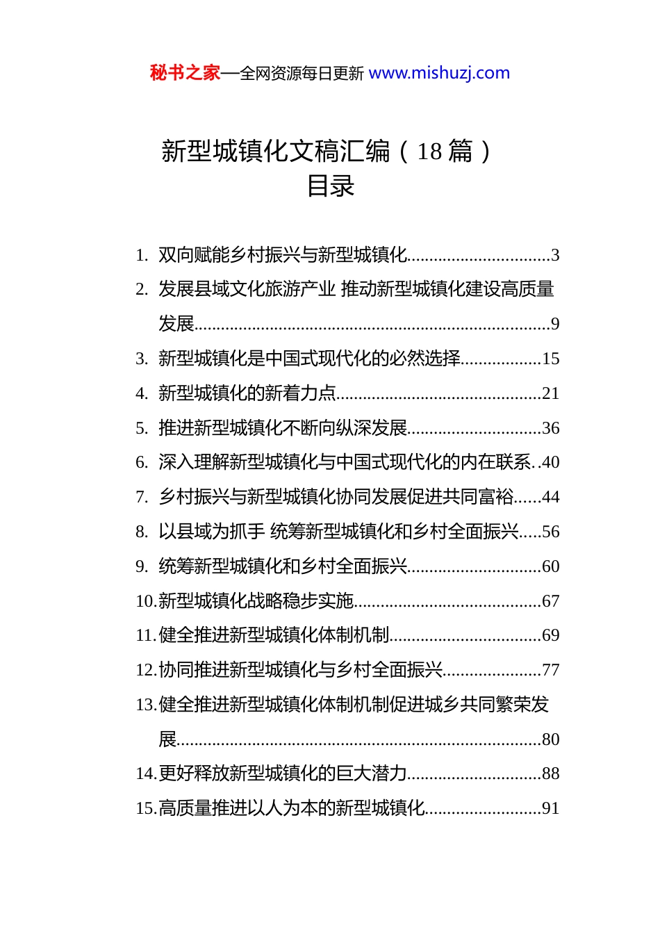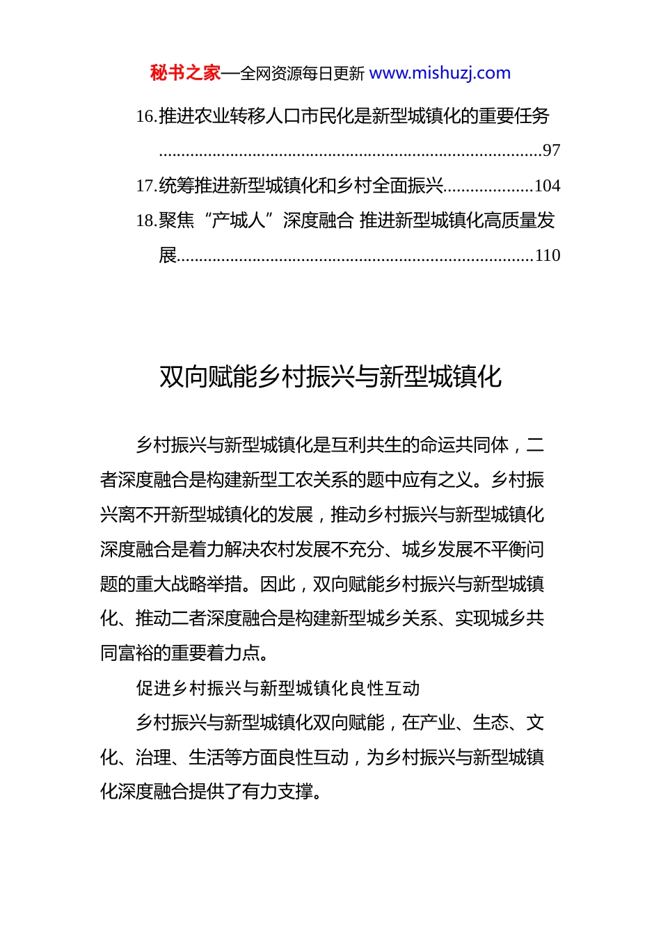 秘书之家—全网资源每日更新 www.mishuzj.com新型城镇化文稿汇编(18 篇)目录1. 双向赋能乡村振兴与新型城镇化................................32. 发展县域文化旅游产业 推动新型城镇化建设高质量发展................................................................................93. 新型城镇化是中国式现代化的必然选择..................154. 新型城镇化的新着力点..............................................215. 推进新型城镇化不断向纵深发展..............................366. 深入理解新型城镇化与中国式现代化的内在联系..407. 乡村振兴与新型城镇化协同发展促进共同富裕......448. 以县域为抓手 统筹新型城镇化和乡村全面振兴.....569. 统筹新型城镇化和乡村全面振兴..............................6010.新型城镇化战略稳步实施..........................................6711.健全推进新型城镇化体制机制..................................6912.协同推进新型城镇化与乡村全面振兴......................7713.健全推进新型城镇化体制机制促进城乡共同繁荣发展..................................................................................8014.更好释放新型城镇化的巨大潜力..............................8815.高质量推进以人为本的新型城镇化..........................91秘书之家—全网资源每日更新 www.mishuzj.com16.推进农业转移人口市民化是新型城镇化的重要任务......................................................................................9717.统筹推进新型城镇化和乡村全面振兴....................10418.聚焦“产城人”深度融合 推进新型城镇化高质量发展................................................................................110双向赋能乡村振兴与新型城镇化乡村振兴与新型城镇化是互利共生的命运共同体,二者深度融合是构建新型工农关系的题中应有之义。乡村振兴离不开新型城镇化的发展,推动乡村振兴与新型城镇化深度融合是着力解决农村发展不充分、城乡发展不平衡问题的重大战略举措。因此,双向赋能乡村振兴与新型城镇化、推动二者深度融合是构建新型城乡关系、实现城乡共同富裕的重要着力点。促进乡村振兴与新型城镇化良性互动乡村振兴与新型城镇化双向赋能,在产业、生态、文化、治理、生活等方面良性互动,为乡村振兴与新型城镇化深度融合提供了有力支撑。秘书之家—全网资源每日更新 www.mishuzj.com以城乡产业融合互补,促进产业兴旺与高效城镇化良性互动。产业发展是关键。以城乡产业融合互补为桥梁,带动乡村和城镇产业的发展,实现乡村产业兴旺和高效城镇化。一方面,发挥城镇的辐射带动作用,以城市群带动周边县域经济发展,以县域经济发展带动乡村产业,在以城带乡的发展过程中,进一步优化城乡产业布局。另一方面,乡村要主动承接城镇产业梯度转移,发挥农村土地、劳动力方面的比较优势,在产业转移过程中,带动乡村一二三产业融合,优化产业结构。以生态环境共建共治,促进生态宜居与绿色城镇化良性互动。良好的生态环境是最普惠的民生福祉。以生态环境共建共治为手段,推动农村人居环境整治和美丽城镇建设,实现乡村生态宜居与绿色城镇化。一方面,加大生态修复力度,发展低碳产业和循环经济,为腹地农村生态宜居提供保障。另一方面,着力改善农村生产生活生态环境,连线成片打造一批山清水秀、天蓝地绿、村美人和的新型农村社区,以更加优美的生态环境满足市民对绿色空间的需要。以城乡文化融合发展,促进乡风文明与人文城镇化良性互动。城乡经济的融合为文化的融合奠定了基础。以城乡文化融合发展为纽带,推动城乡之间文化在长期的相互秘书之家—全网资源每日更新 www.mishuzj.com浸润中逐渐促进人的现代化,实现乡村乡风文明与人文城镇化。一方面,新型城镇化发展带动人口流动,使进城农民主动融入先进文化,自觉提升科学文化素养,摒弃陈规陋习。另一方面,乡村振兴要注重传承和保护优秀传统的乡土文化,打造充满魅力的乡土文化符号,夯实文明根基。以城乡治理统...