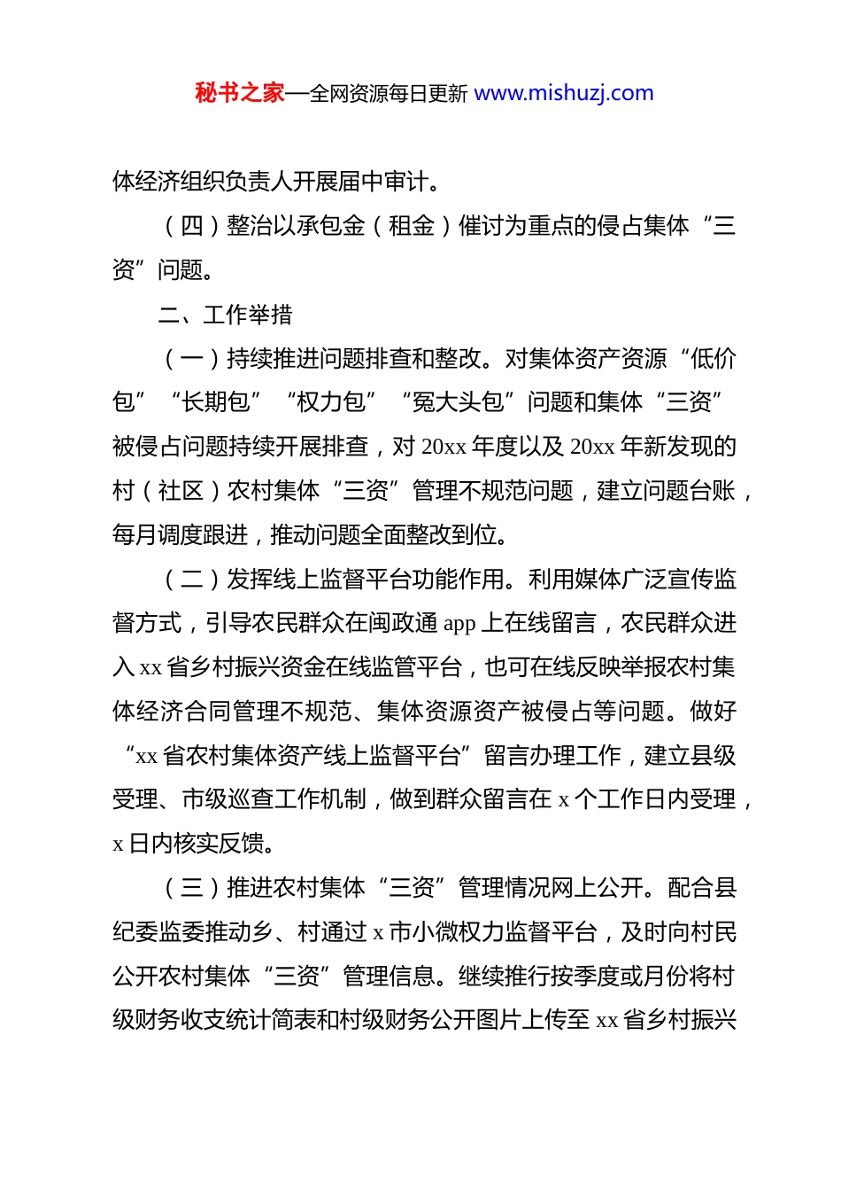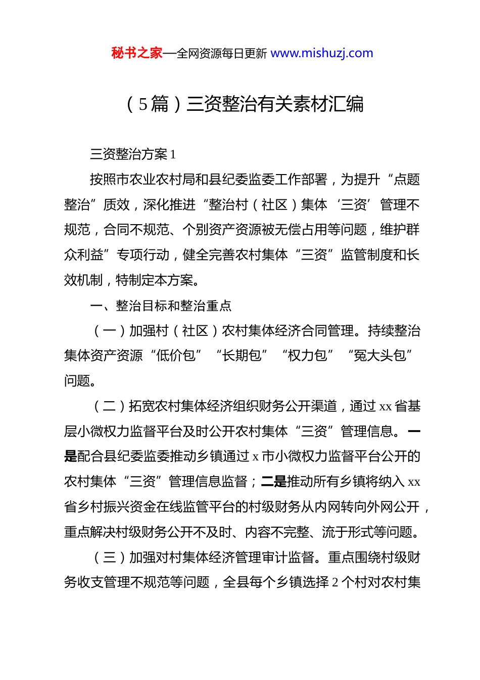 秘书之家—全网资源每日更新 www.mishuzj.com(5 篇)三资整治有关素材汇编三资整治方案 1按照市农业农村局和县纪委监委工作部署,为提升“点题整治”质效,深化推进“整治村(社区)集体‘三资’管理不规范,合同不规范、个别资产资源被无偿占用等问题,维护群众利益”专项行动,健全完善农村集体“三资”监管制度和长效机制,特制定本方案。一、整治目标和整治重点(一)加强村(社区)农村集体经济合同管理。持续整治集体资产资源“低价包”“长期包”“权力包”“冤大头包”问题。(二)拓宽农村集体经济组织财务公开渠道,通过 xx 省基层小微权力监督平台及时公开农村集体“三资”管理信息。一是配合县纪委监委推动乡镇通过 x 市小微权力监督平台公开的农村集体“三资”管理信息监督;二是推动所有乡镇将纳入 xx省乡村振兴资金在线监管平台的村级财务从内网转向外网公开,重点解决村级财务公开不及时、内容不完整、流于形式等问题。(三)加强对村集体经济管理审计监督。重点围绕村级财务收支管理不规范等问题,全县每个乡镇选择 2 个村对农村集秘书之家—全网资源每日更新 www.mishuzj.com体经济组织负责人开展届中审计。(四)整治以承包金(租金)催讨为重点的侵占集体“三资”问题。二、工作举措(一)持续推进问题排查和整改。对集体资产资源“低价包”“长期包”“权力包”“冤大头包”问题和集体“三资”被侵占问题持续开展排查,对 20xx 年度以及 20xx 年新发现的村(社区)农村集体“三资”管理不规范问题,建立问题台账,每月调度跟进,推动问题全面整改到位。(二)发挥线上监督平台功能作用。利用媒体广泛宣传监督方式,引导农民群众在闽政通 app 上在线留言,农民群众进入 xx 省乡村振兴资金在线监管平台,也可在线反映举报农村集体经济合同管理不规范、集体资源资产被侵占等问题。做好“xx 省农村集体资产线上监督平台”留言办理工作,建立县级受理、市级巡查工作机制,做到群众留言在 x 个工作日内受理,x 日内核实反馈。(三)推进农村集体“三资”管理情况网上公开。配合县纪委监委推动乡、村通过 x 市小微权力监督平台,及时向村民公开农村集体“三资”管理信息。继续推行按季度或月份将村级财务收支统计简表和村级财务公开图片上传至 xx 省乡村振兴秘书之家—全网资源每日更新 www.mishuzj.com资金在线监管平台。推动村级财务网上公开从内网转向外网公开,做好按村(社区)录入集体经济组织成员身份信息,实现集体经济组织成员可通过外网实时查询本集体经济组织财务管理情况。(四)提升集体资产管理信息化水平。健全完善 x 市农村集体“三资”管理平台,涵盖农村集体财务管理、合同管理、资产资源管理、预警监测等多种功能。(五)加强村集体财务审计监督工作。试点开展村干部任期经济责任届中审计工作,重点对集体经济体量大、工程项目建设多、廉政风险高的村加强审计监督,对村级财务管理制度执行、财务收支和收益分配等群众反映强烈的方面进行专项审计。对审计中发现的集体资产和资金被侵占、集体财务管理不规范等问题,限期整改落实;涉及国家工作人员及村干部违规违纪的,及时移交当地纪检监察部门处理。三、进度安排(一)排查整改集体资产管理不规范问题。(x 月 x 日前)。x 月底前,继续开展集体资产资源“低价包”“长期包”“权力包”“冤大头包”问题和集体“三资”被侵占问题排查。x月底前,对群众举报或自查发现合同不规范、个别资产资源被无偿占用等问题,逐一分析梳理,提出整改措施,明确整改时秘书之家—全网资源每日更新 www.mishuzj.com限,确保群众反映问题件件有回应、事事有着落。(二)宣传推广集体资产线上监督平台。(x 月底前)。实现 xx 省农村集体资产线上监督平台与闽政通 app、xx 省乡村振兴资金在线监管平台 app 对接,对群众在平台留言限期办结,推动问题整改到位。同时,加大宣传力度,进一步提高平台知晓度,加强对群众留言办理情况的分析研判,有针对性地曝光典型案例。(三)升级村级财务网上公开系统(x 月底前)。6 月底前,完成在线监管平台村级财务网上公开内网数...