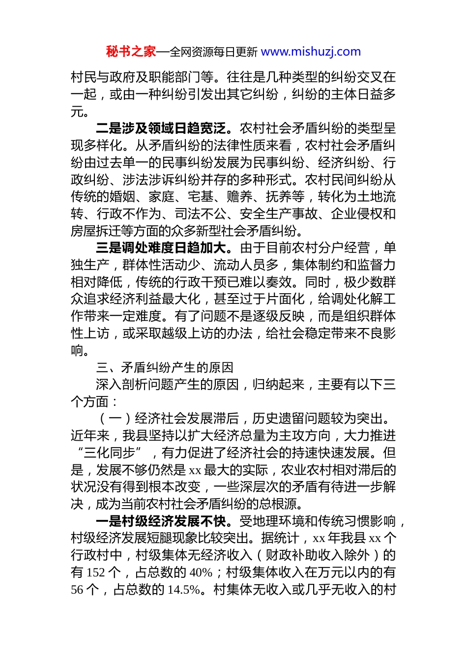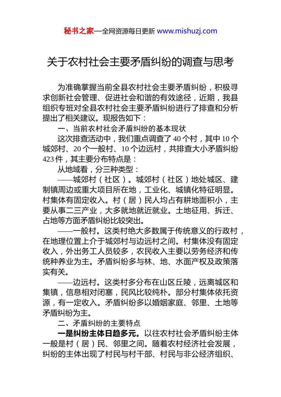 秘书之家—全网资源每日更新 www.mishuzj.com关于农村社会主要矛盾纠纷的调查与思考为准确掌握当前全县农村社会主要矛盾纠纷,积极寻求创新社会管理、促进社会和谐的有效途径,近期,我县组织专班对全县农村社会主要矛盾纠纷进行了排查和分析提出了相关建议。现报告如下:一、当前农村社会矛盾纠纷的基本现状这次排查活动中,我们重点调查了 40 个村,其中 10 个城郊村、20 个一般村、10 个边远村,共排查大小矛盾纠纷423 件,其主要分布特点是:从地域看,分三种类型:——城郊村(社区)。城郊村(社区)地处城区、建制镇周边或重大项目所在地,工业化、城镇化特征明显。村集体有固定收入。村(居)民人均占有耕地面积小,主要从事二三产业,大多就地就近就业。土地征用、拆迁、占地等方面矛盾纠纷比较突出。——一般村。这类村绝大多数属于传统意义的行政村,在地理位置上介于城郊村与边远村之间。村集体没有固定收入,外出务工人员较多,农民收入主要以劳务经济和传统种养业为主。矛盾纠纷多与林、地、水面产权及政策落实有关。——边远村。这类村多分布在山区丘陵,远离城区和集镇,信息相对闭塞,民风比较纯朴。部分村集体依托资源,有一定收入。矛盾纠纷多以婚姻家庭、邻里、土地等矛盾纠纷为主。二、矛盾纠纷的主要特点一是纠纷主体日趋多元。以往农村社会矛盾纠纷主体一般是村(居)民、邻里之间。随着农村经济社会发展,纠纷的主体出现了村民与村干部、村民与非公经济组织、秘书之家—全网资源每日更新 www.mishuzj.com村民与政府及职能部门等。往往是几种类型的纠纷交叉在一起,或由一种纠纷引发出其它纠纷,纠纷的主体日益多元。二是涉及领域日趋宽泛。农村社会矛盾纠纷的类型呈现多样化。从矛盾纠纷的法律性质来看,农村社会矛盾纠纷由过去单一的民事纠纷发展为民事纠纷、经济纠纷、行政纠纷、涉法涉诉纠纷并存的多种形式。农村民间纠纷从传统的婚姻、家庭、宅基、赡养、抚养等,转化为土地流转、行政不作为、司法不公、安全生产事故、企业侵权和房屋拆迁等方面的众多新型社会矛盾纠纷。三是调处难度日趋加大。由于目前农村分户经营,单独生产,群体性活动少、流动人员多,集体制约和监督力相对降低,传统的行政干预已难以奏效。同时,极少数群众追求经济利益最大化,甚至过于片面化,给调处化解工作带来一定难度。有了问题不是逐级反映,而是组织群体性上访,或采取越级上访的办法,给社会稳定带来不良影响。三、矛盾纠纷产生的原因深入剖析问题产生的原因,归纳起来,主要有以下三个方面:(一)经济社会发展滞后,历史遗留问题较为突出。近年来,我县坚持以扩大经济总量为主攻方向,大力推进“三化同步”,有力促进了经济社会的持速快速发展。但是,发展不够仍然是 xx 最大的实际,农业农村相对滞后的状况没有得到根本改变,一些深层次的矛盾有待进一步解决,成为当前农村社会矛盾纠纷的总根源。一是村级经济发展不快。受地理环境和传统习惯影响,村级经济发展短腿现象比较突出。据统计,xx 年我县 xx 个行政村中,村级集体无经济收入(财政补助收入除外)的有 152 个,占总数的 40%;村级集体收入在万元以内的有56 个,占总数的 14.5%。村集体无收入或几乎无收入的村秘书之家—全网资源每日更新 www.mishuzj.com占半数以上,无钱办事成为农村工作的主要压力。当前,基础设施建设、公益事业发展办得越多,村集体拿的钱越多。同时,计划生育、抗旱、新农保、新农合、水稻保险保费征缴,村级都要补贴一定费用。据初步测算,村平每年要贴 1 万元左右。二是农民增收渠道有限。农业抗风险能力弱。目前我县农业基础设施依然薄弱,“靠天收”的现状还没有得到根本扭转。每遇自然灾害和县场行情影响,很多农户赚不到钱,甚至亏本。另外,农村困难群体的大量存在,也是制约农民增收和农村发展的一个重要因素。据调查,在部分山区乡镇,每个乡镇的痴、呆、傻等精神异常人口都达50 人以上。因病致贫、因病返贫的现象十分普遍。三是历史遗留问题突出。比如土地抛荒的问题。农业税免征以前,由于种田的比较效益低下,农村劳动力大量外出务工,造成大量土...