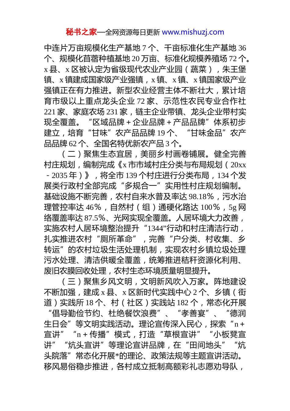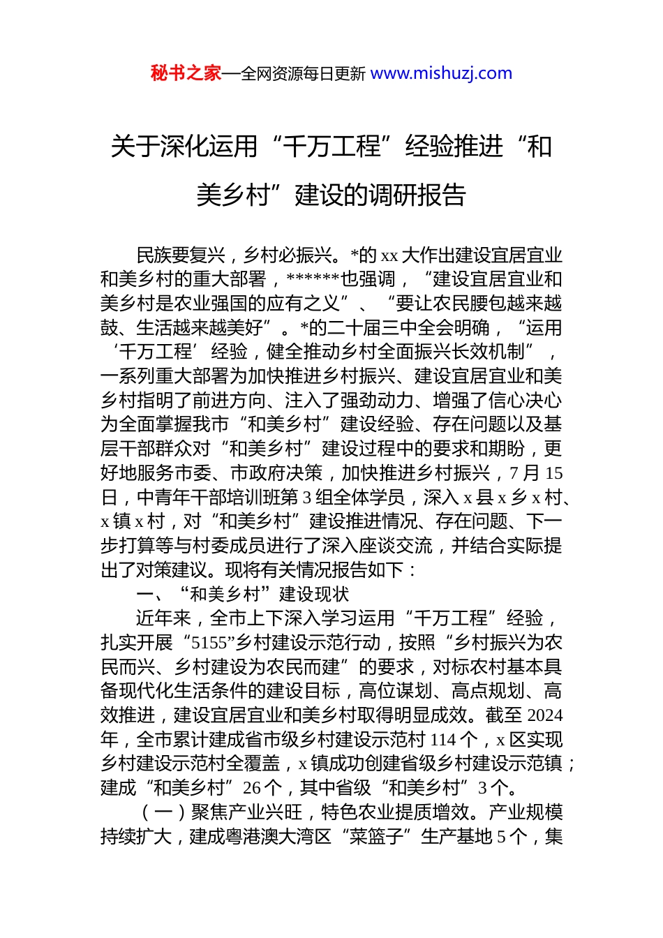 秘书之家—全网资源每日更新 www.mishuzj.com关于深化运用“千万工程”经验推进“和美乡村”建设的调研报告民族要复兴,乡村必振兴。*的 xx 大作出建设宜居宜业和美乡村的重大部署,******也强调,“建设宜居宜业和美乡村是农业强国的应有之义”、“要让农民腰包越来越鼓、生活越来越美好”。*的二十届三中全会明确,“运用‘千万工程’经验,健全推动乡村全面振兴长效机制”,一系列重大部署为加快推进乡村振兴、建设宜居宜业和美乡村指明了前进方向、注入了强劲动力、增强了信心决心为全面掌握我市“和美乡村”建设经验、存在问题以及基层干部群众对“和美乡村”建设过程中的要求和期盼,更好地服务市委、市政府决策,加快推进乡村振兴,7 月 15日,中青年干部培训班第 3 组全体学员,深入 x 县 x 乡 x 村、x 镇 x 村,对“和美乡村”建设推进情况、存在问题、下一步打算等与村委成员进行了深入座谈交流,并结合实际提出了对策建议。现将有关情况报告如下:一、“和美乡村”建设现状近年来,全市上下深入学习运用“千万工程”经验,扎实开展“5155”乡村建设示范行动,按照“乡村振兴为农民而兴、乡村建设为农民而建”的要求,对标农村基本具备现代化生活条件的建设目标,高位谋划、高点规划、高效推进,建设宜居宜业和美乡村取得明显成效。截至 2024年,全市累计建成省市级乡村建设示范村 114 个,x 区实现乡村建设示范村全覆盖,x 镇成功创建省级乡村建设示范镇;建成“和美乡村”26 个,其中省级“和美乡村”3 个。(一)聚焦产业兴旺,特色农业提质增效。产业规模持续扩大,建成粤港澳大湾区“菜篮子”生产基地 5 个,集秘书之家—全网资源每日更新 www.mishuzj.com中连片万亩规模化生产基地 7 个、千亩标准化生产基地 36个、规模化苜蓿种植基地 20 万亩、标准化规模养殖场 72 个。x 县、x 区被认定为省级现代农业产业园(蔬菜),朱王堡镇、x 镇建成国家级产业强镇,x 镇、x 镇、x 镇国家级产业强镇正在有力推进。新型农业经营主体不断壮大,累计培育市级以上重点龙头企业 72 家、示范性农民专业合作社221 家、家庭农场 231 家,链主企业带镇、龙头企业带村实现全覆盖。“区域品牌+企业品牌+产品品牌”体系初步建立,培育“甘味”农产品品牌 19 个、“甘味金品”农产品品牌 62 个、全国名特优新农产品 3 个。(二)聚焦生态宜居,美丽乡村画卷铺展。健全完善村庄规划,编制完成《x 市市域村庄分类与布局规划(20xx-2035 年)》,将全市 139 个村庄进行分类布局,134 个发展类行政村全部完成“多规合一”实用性村庄规划编制。基础设施不断完善,农村自来水普及率达 98.18%,污水治理管控率达 46%,自然村(组)通硬化路达 100%,5g 网络覆盖率达 87.5%、光网实现全覆盖。人居环境大力改善,实施农村人居环境整治提升“1344”行动和村庄清洁行动,扎实推进农村“厕所革命”,完善“户分类、村收集、乡转运”的农村垃圾生活处理机制,实现农村乡镇垃圾处理污水处理、清洁供暖全覆盖,统筹推进秸秆资源化利用、废旧农膜回收处理,农村生态环境质量明显提升。(三)聚焦乡风文明,文明新风吹入万家。阵地建设不断加强,建成 x 县、x 区新时代实践中心 2 个、乡镇(街道)实践所 18 个、村(社区)实践站 182 个,常态化开展“倡导勤俭节约、杜绝餐饮浪费”、“孝善宴”、“德润生日会”等文明实践活动。理论宣传深入民心,探索“n+宣讲”“n+传播”模式,打造“草根宣讲”“小板凳宣讲”“炕头宣讲”等理论宣讲品牌,在“田间地头”“炕头院落”常态化开展*的理论、政策法规等主题宣讲活动。移风易俗稳步推进,各村成立抵制高额彩礼志愿劝导队,秘书之家—全网资源每日更新 www.mishuzj.com常态化开展“抵制高额彩礼、倡导文明婚俗”主题宣传活动,x 县建立治理高价彩礼、精简酒席数量、倡导“婚事新办”、推行“丧事简办”等 12 条倡导性标准,x 区探索实施“1234 移风易俗工作法”、“理”出婚丧嫁娶新风尚等10 项做法。(四)聚焦治理有效,善治效能持续提升。平安乡村建设扎实推进,...