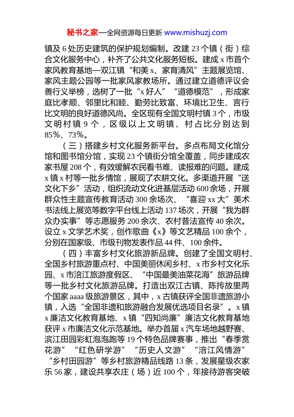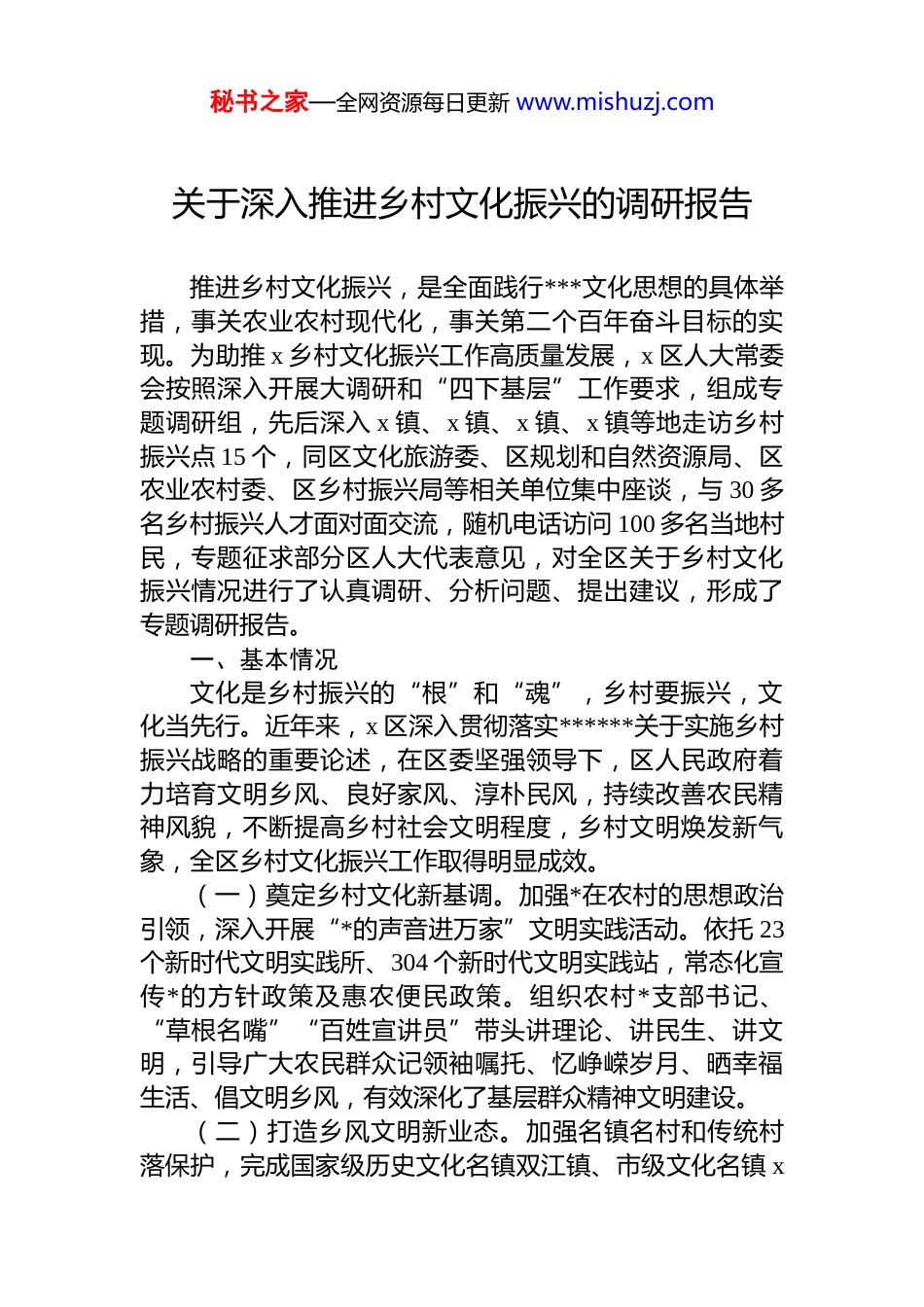 秘书之家—全网资源每日更新 www.mishuzj.com关于深入推进乡村文化振兴的调研报告推进乡村文化振兴,是全面践行***文化思想的具体举措,事关农业农村现代化,事关第二个百年奋斗目标的实现。为助推 x 乡村文化振兴工作高质量发展,x 区人大常委会按照深入开展大调研和“四下基层”工作要求,组成专题调研组,先后深入 x 镇、x 镇、x 镇、x 镇等地走访乡村振兴点 15 个,同区文化旅游委、区规划和自然资源局、区农业农村委、区乡村振兴局等相关单位集中座谈,与 30 多名乡村振兴人才面对面交流,随机电话访问 100 多名当地村民,专题征求部分区人大代表意见,对全区关于乡村文化振兴情况进行了认真调研、分析问题、提出建议,形成了专题调研报告。一、基本情况文化是乡村振兴的“根”和“魂”,乡村要振兴,文化当先行。近年来,x 区深入贯彻落实******关于实施乡村振兴战略的重要论述,在区委坚强领导下,区人民政府着力培育文明乡风、良好家风、淳朴民风,持续改善农民精神风貌,不断提高乡村社会文明程度,乡村文明焕发新气象,全区乡村文化振兴工作取得明显成效。(一)奠定乡村文化新基调。加强*在农村的思想政治引领,深入开展“*的声音进万家”文明实践活动。依托 23个新时代文明实践所、304 个新时代文明实践站,常态化宣传*的方针政策及惠农便民政策。组织农村*支部书记、“草根名嘴”“百姓宣讲员”带头讲理论、讲民生、讲文明,引导广大农民群众记领袖嘱托、忆峥嵘岁月、晒幸福生活、倡文明乡风,有效深化了基层群众精神文明建设。(二)打造乡风文明新业态。加强名镇名村和传统村落保护,完成国家级历史文化名镇双江镇、市级文化名镇 x秘书之家—全网资源每日更新 www.mishuzj.com镇及 6 处历史建筑的保护规划编制。改建 23 个镇(街)综合文化服务中心,补齐了公共文化服务短板。建成 x 市首个家风教育基地—双江镇“和美 x、家育清风”主题展览馆、家风主题公园等一批家风家教场所。通过建立道德评议会善行义举榜,选树了一批“x 好人”“道德模范”,形成家庭比孝顺、邻里比和睦、勤劳比致富、环境比卫生、言行比文明的良好道德风尚。全区现有全国文明村镇 3 个,市级文 明 村 镇 9 个 , 区 级 以 上 文 明 镇 、 村 占 比 分 别 达 到85%、73%。(三)搭建乡村文化服务新平台。多点布局文化馆分馆和图书馆分馆,实现 23 个镇街分馆全覆盖,同步建成农家书屋 208 个,有效缓解农民看书难、读报难的问题。建成x 镇 x 村等一批乡情馆,展现了农耕文化。多渠道开展“送文化下乡”活动,组织流动文化进基层活动 600 余场,开展群众性主题宣传教育活动 300 余场次、“喜迎 xx 大”美术书法线上展览等数字平台线上活动 137 场次,开展“我为群众办实事”等志愿服务 200 余次、农村普法宣传 40 余次。设立 x 文学艺术奖,创作歌曲《x》等文艺精品 100 余个,分别在国家级、市级刊物发表作品 44 件、100 余件。(四)丰富乡村文化旅游新品牌。创建了全国文明村、全国乡村旅游重点村、中国美丽休闲乡村、x 市乡村文化乐园、x 市涪江旅游度假区、“中国最美油菜花海”旅游品牌等一批乡村文化旅游品牌。打造出双江古镇、陈抟故里两个国家 aaaa 级旅游景区,其中,x 古镇获评全国非遗旅游小镇,入选“全国非遗和旅游融合发展优选项目名录”。x 镇x 廉洁文化教育基地、x 镇“四知尚廉”廉洁文化教育基地获评 x 市廉洁文化示范基地。举办首届 x 汽车场地越野赛、滨江田园彩虹泡泡跑等 19 个特色品牌赛事,推出“春季赏花游”“红色研学游”“历史人文游”“涪江风情游”“乡村田园游”等乡村旅游精品线路 13 条,发展星级农家乐 56 家,建设共享农庄(场)近 100 个,年接待游客突破秘书之家—全网资源每日更新 www.mishuzj.com1500 万人次,x 首次上榜春节假日最热目的地城市。(五)探索乡村文化建设新路径。全面推进农科城、新农城建设,探索打造乡村文化与现代农业、乡村旅游深度融合新样板。引进阿里、腾讯、奇安信等数字企业,丰富拓展数字化应用场景,聚力推动农...