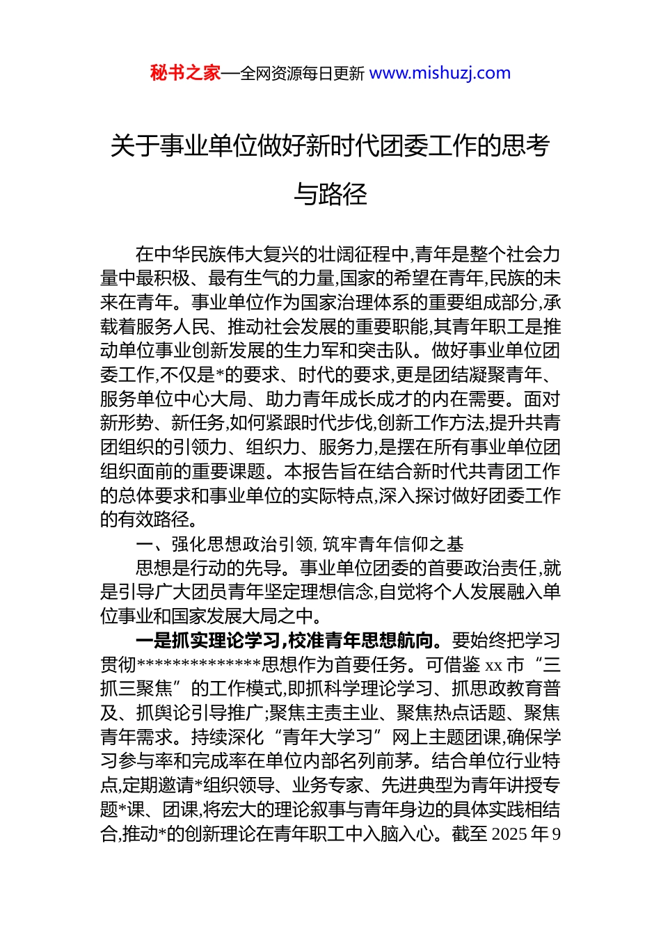 秘书之家—全网资源每日更新 www.mishuzj.com关于事业单位做好新时代团委工作的思考与路径在中华民族伟大复兴的壮阔征程中,青年是整个社会力量中最积极、最有生气的力量,国家的希望在青年,民族的未来在青年。事业单位作为国家治理体系的重要组成部分,承载着服务人民、推动社会发展的重要职能,其青年职工是推动单位事业创新发展的生力军和突击队。做好事业单位团委工作,不仅是*的要求、时代的要求,更是团结凝聚青年、服务单位中心大局、助力青年成长成才的内在需要。面对新形势、新任务,如何紧跟时代步伐,创新工作方法,提升共青团组织的引领力、组织力、服务力,是摆在所有事业单位团组织面前的重要课题。本报告旨在结合新时代共青团工作的总体要求和事业单位的实际特点,深入探讨做好团委工作的有效路径。一、强化思想政治引领,筑牢青年信仰之基思想是行动的先导。事业单位团委的首要政治责任,就是引导广大团员青年坚定理想信念,自觉将个人发展融入单位事业和国家发展大局之中。一是抓实理论学习,校准青年思想航向。要始终把学习贯彻**************思想作为首要任务。可借鉴 xx 市“三抓三聚焦”的工作模式,即抓科学理论学习、抓思政教育普及、抓舆论引导推广;聚焦主责主业、聚焦热点话题、聚焦青年需求。持续深化“青年大学习”网上主题团课,确保学习参与率和完成率在单位内部名列前茅。结合单位行业特点,定期邀请*组织领导、业务专家、先进典型为青年讲授专题*课、团课,将宏大的理论叙事与青年身边的具体实践相结合,推动*的创新理论在青年职工中入脑入心。截至 2025 年 9秘书之家—全网资源每日更新 www.mishuzj.com月,全年可围绕重要节点和主题开展各类学习活动 50 余场次,覆盖青年职工超千人次,确保思想引领不断线、不缺位。二是创新宣传载体,占领青年舆论阵地。要主动适应媒体格局的深刻变化,建好用好单位团委的新媒体矩阵。以“xx 单位共青团就在你身边”为主题,整合运营微信公众号、视频号、抖音等青年喜闻乐见的平台。内容上,既要及时传达*团组织的声音,又要紧密围绕单位中心工作和青年成长需求,发布权威资讯、展示青年风采、回应青年关切。在关键时间节点和重大事件中,要主动设置议题,组织青年职工积极发声、弘扬正气,展现单位青年的良好形象。通过打造有温度、有深度、有态度的网上共青团品牌,将思想引领化于无形,凝聚起强大的网络正能量。三是融入中心工作,深化青年职业认同。思想引领不能空对空,必须与单位的中心工作紧密结合。要围绕单位的年度重点任务、重大项目、发展规划,组织青年开展主题讨论、形势任务教育,让青年深刻理解自身岗位在单位发展全局中的重要价值。通过宣传在科研攻关、技术革新、管理服务等领域涌现出的青年榜样,讲述他们立足岗位、建功立业的奋斗故事,引导广大青年职工增强对单位事业的归属感、认同感和自豪感,将“听*话、跟*走”的政治自觉转化为推动单位高质量发展的实际行动。二、夯实基层组织建设,激发组织内在活力团的基层组织是团的一切工作的基础和战斗力的源泉。事业单位团委必须牢固树立大抓基层的鲜明导向,着力破解组织建设中的难题,让团组织真正成为联系和服务青年的坚强堡垒。一是推进“智慧团建”,实现动态精准管理。“智慧团建”系统是共青团深化改革、加强自身建设的重大创新举措。要高度重视系统的数据录入、更新和应用工作,确保组织树完整、团员信息准确。截至 2025 年 9 月,力争实现单位“智慧团建”系统团员信息录入完整度达到 99.9%以上,组秘书之家—全网资源每日更新 www.mishuzj.com织信息完整度达到 100%。通过系统实现组织关系转接、团费缴纳、活动发布、数据分析等功能的线上化,打通联系服务青年的“最后一公里”。同时,要善于运用系统数据分析青年职工的年龄结构、学历层次、分布状况等,为科学决策、精准施策提供数据支撑,提升团组织工作的科学化水平。二是优化组织设置,扩大有效覆盖范围。要严格遵循《团章》规定,根据单位内设机构、项目团队和青年分布情况,科学合理地设置团的总支、支部。对于新成立的部门、青年人数较多的课题组,要及时跟进建立团组织,确保“哪里有青年,哪里就有团的组织”。积极探...