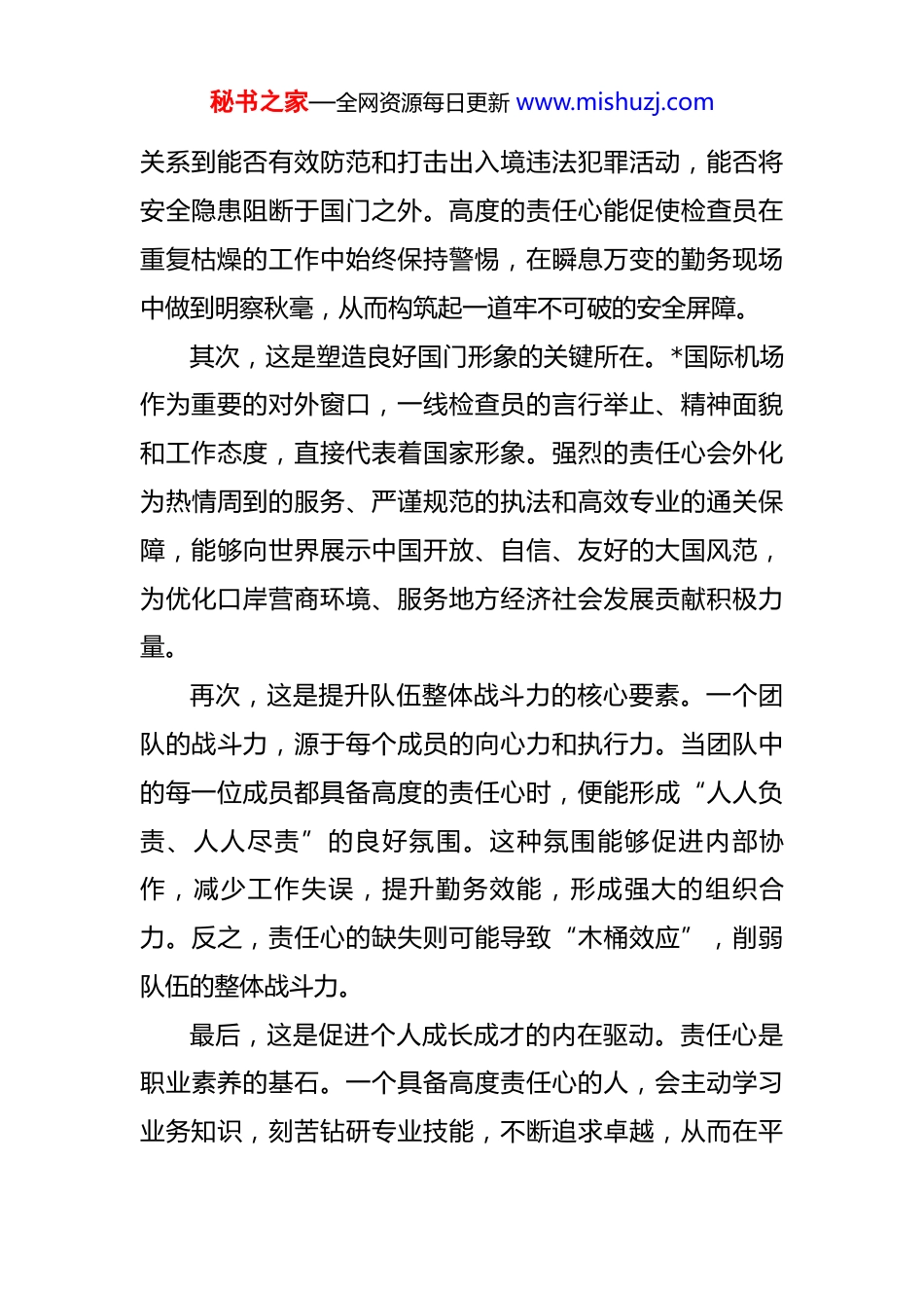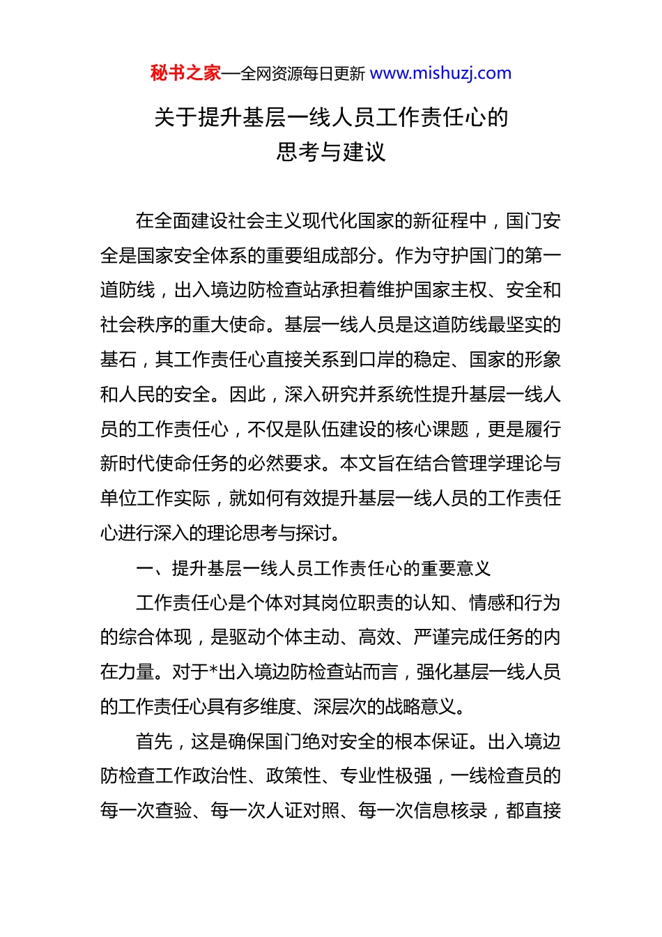 秘书之家—全网资源每日更新 www.mishuzj.com关于提升基层一线人员工作责任心的思考与建议 在全面建设社会主义现代化国家的新征程中,国门安全是国家安全体系的重要组成部分。作为守护国门的第一道防线,出入境边防检查站承担着维护国家主权、安全和社会秩序的重大使命。基层一线人员是这道防线最坚实的基石,其工作责任心直接关系到口岸的稳定、国家的形象和人民的安全。因此,深入研究并系统性提升基层一线人员的工作责任心,不仅是队伍建设的核心课题,更是履行新时代使命任务的必然要求。本文旨在结合管理学理论与单位工作实际,就如何有效提升基层一线人员的工作责任心进行深入的理论思考与探讨。一、提升基层一线人员工作责任心的重要意义工作责任心是个体对其岗位职责的认知、情感和行为的综合体现,是驱动个体主动、高效、严谨完成任务的内在力量。对于*出入境边防检查站而言,强化基层一线人员的工作责任心具有多维度、深层次的战略意义。首先,这是确保国门绝对安全的根本保证。出入境边防检查工作政治性、政策性、专业性极强,一线检查员的每一次查验、每一次人证对照、每一次信息核录,都直接秘书之家—全网资源每日更新 www.mishuzj.com关系到能否有效防范和打击出入境违法犯罪活动,能否将安全隐患阻断于国门之外。高度的责任心能促使检查员在重复枯燥的工作中始终保持警惕,在瞬息万变的勤务现场中做到明察秋毫,从而构筑起一道牢不可破的安全屏障。其次,这是塑造良好国门形象的关键所在。*国际机场作为重要的对外窗口,一线检查员的言行举止、精神面貌和工作态度,直接代表着国家形象。强烈的责任心会外化为热情周到的服务、严谨规范的执法和高效专业的通关保障,能够向世界展示中国开放、自信、友好的大国风范,为优化口岸营商环境、服务地方经济社会发展贡献积极力量。再次,这是提升队伍整体战斗力的核心要素。一个团队的战斗力,源于每个成员的向心力和执行力。当团队中的每一位成员都具备高度的责任心时,便能形成“人人负责、人人尽责”的良好氛围。这种氛围能够促进内部协作,减少工作失误,提升勤务效能,形成强大的组织合力。反之,责任心的缺失则可能导致“木桶效应”,削弱队伍的整体战斗力。最后,这是促进个人成长成才的内在驱动。责任心是职业素养的基石。一个具备高度责任心的人,会主动学习业务知识,刻苦钻研专业技能,不断追求卓越,从而在平秘书之家—全网资源每日更新 www.mishuzj.com凡的岗位上实现自我价值。组织通过引导和培养员工的责任心,实际上也是在为其长远职业发展赋能,实现个人成长与组织发展的同频共振。二、当前基层一线人员工作责任心现状与存在问题总体来看,*出入境边防检查站基层一线队伍主流是好的,广大检查员忠于职守、爱岗敬业,在平凡岗位上做出了不平凡的贡献。然而,面对新形势、新任务、新挑战,对标“绝对忠诚、绝对纯洁、绝对可靠”的政治要求,基层一线人员工作责任心建设领域仍存在一些亟待研究和解决的深层次问题。这些问题并非*出入境边防检查站所独有,而是在类似组织中具有一定的普遍性。(一)能力培养与岗位胜任的匹配度有待提升。能力是责任心的基础。缺乏胜任工作的能力,责任心便无从谈起。当前存在的问题主要表现为:一是培训模式较为单一,系统性不足。部分培训内容与实战需求结合不够紧密,存在“为培训而培训”的现象,导致新入职人员对岗位职责和规章制度的理解不够深入,难以快速适应高强度、高标准的工作要求。二是知识更新速度滞后于形势发展。随着新型出入境证件、新型违法犯罪手段的不断出现,对检查员的知识结构和专业技能提出了更高要求。部分人员满足于现有知识储备,主动学习和自我提升的意识秘书之家—全网资源每日更新 www.mishuzj.com不强,缺乏成为具备双专长乃至多专长的“π 型人”的动力。三是实战化训练的深度和广度不足,导致部分人员在面对复杂疑难情况时,风险识别和应急处置能力存在短板。(二)激励机制与内在动力的耦合度有待增强。有效的激励是激发责任心的催化剂。当前,激励机制在激发内在动力方面存在一些堵点:一是正向激励的精准性不足。表彰奖励体系在一定...