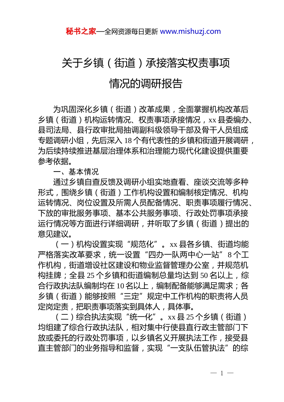 秘书之家—全网资源每日更新 www.mishuzj.com关于乡镇(街道)承接落实权责事项情况的调研报告为巩固深化乡镇(街道)改革成果,全面掌握机构改革后乡镇(街道)机构运转情况、权责事项承接情况,xx 县委编办、县司法局、县行政审批局抽调副科级领导干部及骨干人员组成专题调研小组,先后深入 18 个有代表性的乡镇和街道开展调研,为后续持续推进基层治理体系和治理能力现代化建设提供重要参考依据。一、基本情况通过乡镇自查反馈及调研小组实地查看、座谈交流等多种形式,围绕乡镇(街道)工作机构设置和编制核定情况、机构运转情况、岗位设置及所需人员配备情况、职责事项履行情况、下放的审批服务事项、基本公共服务事项、行政处罚事项承接运行情况等方面进行详细调研,并听取了乡镇(街道)提出的意见建议。(一)机构设置实现“规范化”。xx 县各乡镇、街道均能严格落实改革要求,统一设置“四办一队两中心一站”8 个工作机构,街道增设社区建设和物业监督管理办公室,并规范机构挂牌;全县 25 个乡镇和街道编制总量均达到 50 名以上,综合行政执法队编制均在 10 名以上,编制配备能够满足需求;各乡镇(街道)能够按照“三定”规定中工作机构的职责将人员定岗定责,把职责事项落实到具体人,具体事。(二)综合执法实现“统一化”。xx 县 25 个乡镇(街道)均组建了综合行政执法队,相对集中行使县直行政主管部门下放或委托的行政处罚事项,以乡镇名义开展执法工作,接受县直主管部门的业务指导和监督,实现“一支队伍管执法”的综— 1 —秘书之家—全网资源每日更新 www.mishuzj.com合执法机制。自 2020 年乡镇(街道)综合行政执法改革以来,省级部门下放乡镇和街道行政处罚事项指导清单总计 111 项,xx 县目前共下放和委托涉及城乡建设、市场监管、生态环境、农业农村等多个领域的行政处罚事项 84 项,加上改革前乡镇和街道可直接办结事项 3 项,总计承接 87 项,未下放 27 项。(三)便民服务实现“标准化”。xx 县 25 个乡镇均组建了行政综合服务中心,将与卫生健康、民生保障等群众联系密切的审批服务和基本公共服务事项集中到便民服务中心服务窗口办理,简化办事流程,实现了“一站式”便民服务、“一枚印章管审批(服务)”的政务综合受理模式。2020 年乡镇和街道改革省级文件中乡镇和街道审批服务事项指导清单 84 项、乡镇和街道基本公共服务事项指导清单 34 项,xx 县目前共下放乡镇和街道审批服务事项 68 项,未下放 16 项,34 项基本公共服务事项全部下放,下放事项能够按照相关要求正常办理业务。二、存在的问题乡镇(街道)是联系群众的“最后一公里”,随着改革的深入推进,实际运行中暴露出了以下问题。(一)人力资源短板突出。一是人员摆布不合理。目前,xx 县各乡镇(街道)综合执法队实有人员 153 人,各乡镇(街道)持证人员总计 176 人,但乡镇执法队总计只有 45 人持执法证。一些乡镇将合同工、临时工等无法办理执法证件没有执法资格的人员安排在执法队,一定程度上影响执法工作开展。二是主观能动性发挥不强。执法队业务骨干在完成本职工作的同时还承担着其他重点任务,潜心钻研执法业务,主动适应工作、主动承担责任的积极性还需要充分调动。(二)工作衔接不够顺畅。一是缺少跟进指导。对于专业性较强、定性难度较大、情况较复杂的问题,乡镇(街道)缺少经验,部门在下放权力事项后缺乏后续跟进指导。二是专业培训不足。各部门权力事项下放后,全面系统的培训不够,已— 2 —秘书之家—全网资源每日更新 www.mishuzj.com有的基础知识培训效果不明显,不能满足实际工作需要。三是下放进驻不彻底。已下放到乡镇(街道)的“内地居民婚姻登记”事项,由于民政部门提出“下放需要省级民政部门批准且乡镇不具备承接条件”未按要求下放;部分乡镇已下放的审批事项涉及退役军人、卫生健康、户籍办理等,由于行政综合服务中心办理人员培训不到位,仍由改革前原所站相关人员办理,未进驻行政综合服务中心。(三)实际履职存在困难。一是存在畏难情绪。行政审批、行政处罚是乡镇(街道)接触的全新...