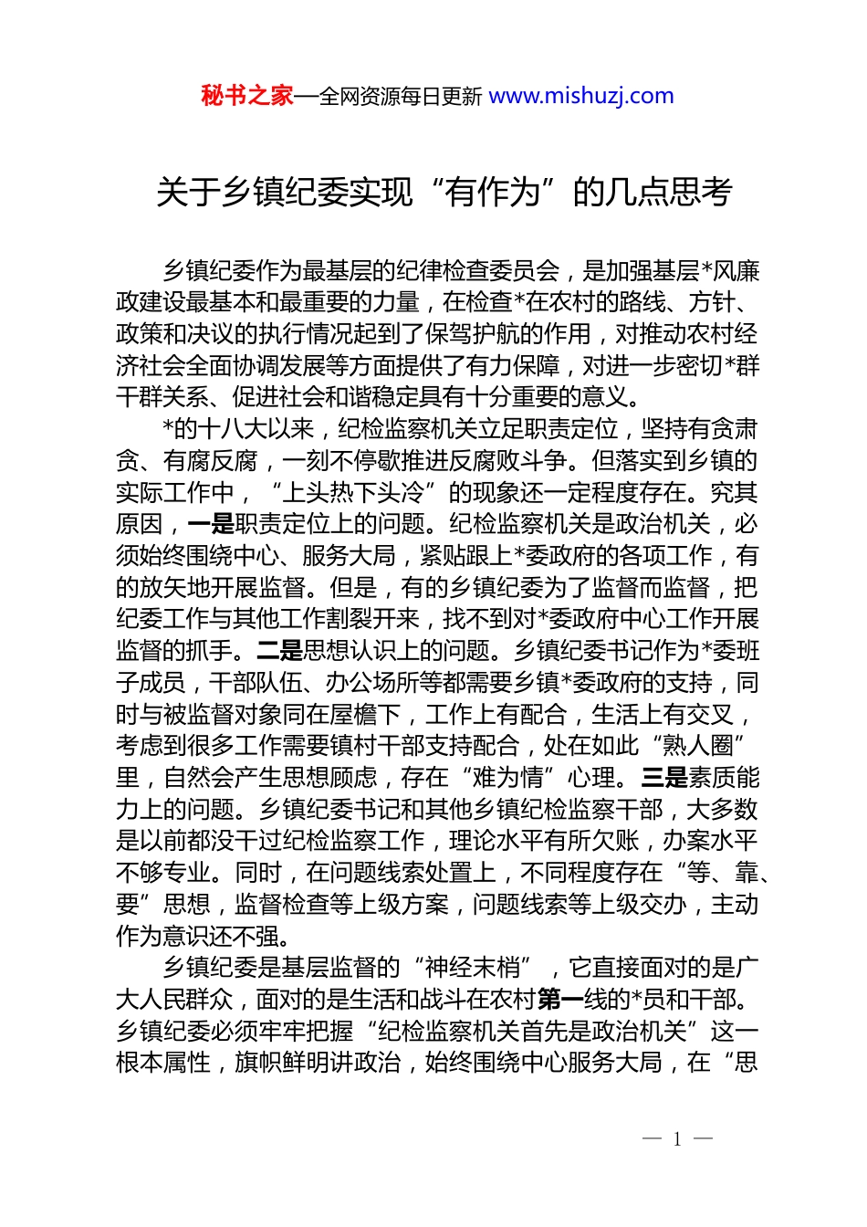 秘书之家—全网资源每日更新 www.mishuzj.com关于乡镇纪委实现“有作为”的几点思考乡镇纪委作为最基层的纪律检查委员会,是加强基层*风廉政建设最基本和最重要的力量,在检查*在农村的路线、方针、政策和决议的执行情况起到了保驾护航的作用,对推动农村经济社会全面协调发展等方面提供了有力保障,对进一步密切*群干群关系、促进社会和谐稳定具有十分重要的意义。*的十八大以来,纪检监察机关立足职责定位,坚持有贪肃贪、有腐反腐,一刻不停歇推进反腐败斗争。但落实到乡镇的实际工作中,“上头热下头冷”的现象还一定程度存在。究其原因,一是职责定位上的问题。纪检监察机关是政治机关,必须始终围绕中心、服务大局,紧贴跟上*委政府的各项工作,有的放矢地开展监督。但是,有的乡镇纪委为了监督而监督,把纪委工作与其他工作割裂开来,找不到对*委政府中心工作开展监督的抓手。二是思想认识上的问题。乡镇纪委书记作为*委班子成员,干部队伍、办公场所等都需要乡镇*委政府的支持,同时与被监督对象同在屋檐下,工作上有配合,生活上有交叉,考虑到很多工作需要镇村干部支持配合,处在如此“熟人圈”里,自然会产生思想顾虑,存在“难为情”心理。三是素质能力上的问题。乡镇纪委书记和其他乡镇纪检监察干部,大多数是以前都没干过纪检监察工作,理论水平有所欠账,办案水平不够专业。同时,在问题线索处置上,不同程度存在“等、靠、要”思想,监督检查等上级方案,问题线索等上级交办,主动作为意识还不强。乡镇纪委是基层监督的“神经末梢”,它直接面对的是广大人民群众,面对的是生活和战斗在农村第一线的*员和干部。乡镇纪委必须牢牢把握“纪检监察机关首先是政治机关”这一根本属性,旗帜鲜明讲政治,始终围绕中心服务大局,在“思— 1 —秘书之家—全网资源每日更新 www.mishuzj.com想认识、工作开展、自身能力”三方面深耕细作,着力推动乡镇纪委“有作为”。一、深化思想认识,厘清工作关系。乡镇纪委开展工作,要准确把握好“双重领导”和“三个为主”的辩证关系,横向上,加强*委对反腐败工作的全过程领导,纵向上,加强上级纪委对下级纪委的重点领导。如此,乡镇纪委才能不缺位、不越位、不冒进。一要按照“*委统一领导,*政齐抓共管,纪委组织协调,部门各负其责,依靠群众支持和参与”的反腐败体制机制,提高乡镇*委政府主要领导对乡镇纪委工作的认识程度,争取主要领导对纪委工作在干部队伍、办公场所等方面的重视和支持,这是有效开展工作的前提和基础。二要充分发挥组织协调,全面履行对乡属站办所和农村*组织的监管职责,在*委的统一领导下,对乡属站办所负有组织协调、监督管理职责。三要加强与县纪检监察机关的沟通和联系,严格落实请示报告制度,为乡镇纪委放手监督执纪壮胆撑腰。二、做实监督首责,提升工作质效。一是强化政治监督。在任何时候,政治监督都是打头的、首要的,*中央重大决策部署到哪里,政治监督就跟进到哪里。“上面千根线,下面一根针”,对于乡镇纪委来说,政治监督的内涵极其丰富。在监督内容上来说,乡镇纪委必须紧紧围绕乡镇*委各项工作部署,通过强化政治监督,督促农村基层干部以实际行动落实“四个意识”,坚定“四个自信”,做到“两个维护”,坚决保障政令畅通、令行禁止。在监督方式方法上,必须围绕“深”字做文章,不仅要紧盯干部作风问题、严肃查处农村干部违纪案件等,还要注重透过现象看本质,推动政治与业务深度融合,坚持从政治上看、政治上办,着力检查发现在落实具体工作中的政治立场、政治责任、政治忠诚、政治担当等深层次问题。二是创新日常监督。乡镇纪委监督的对象是广大的农村干部,其特点是人数多、分布广,因此必须探索出有效的日常监督方式,以— 2 —秘书之家—全网资源每日更新 www.mishuzj.com充分发挥乡镇纪委的监督作用。要盯紧“关键少数”,重点监督村*支部书记(主任),通过监督他们正确履行责任,达到“四两拨千斤”的效果。除此之外,还可以广泛运用“谈心谈话”等手段,前移监督关口,沉下心了解干部八小时内外的工作生活状态,全面客观真实了解掌握乡村干部的“活情况”和具体表现...