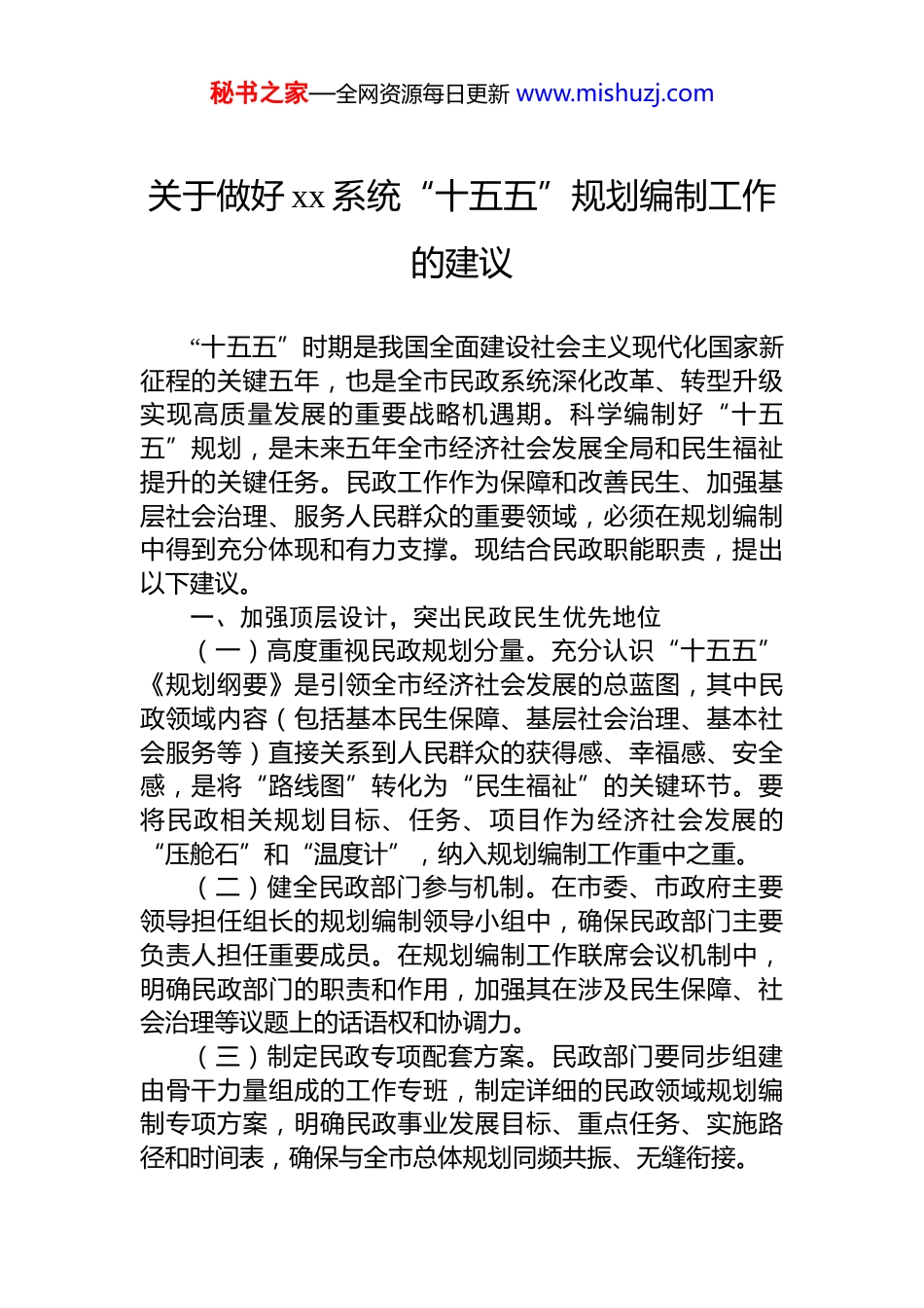 秘书之家—全网资源每日更新 www.mishuzj.com关于做好 xx 系统“十五五”规划编制工作的建议“十五五”时期是我国全面建设社会主义现代化国家新征程的关键五年,也是全市民政系统深化改革、转型升级实现高质量发展的重要战略机遇期。科学编制好“十五五”规划,是未来五年全市经济社会发展全局和民生福祉提升的关键任务。民政工作作为保障和改善民生、加强基层社会治理、服务人民群众的重要领域,必须在规划编制中得到充分体现和有力支撑。现结合民政职能职责,提出以下建议。一、加强顶层设计,突出民政民生优先地位(一) 高度重视民政规划分量 。充分认识“十五五”《规划纲要》是引领全市经济社会发展的总蓝图,其中民政领域内容(包括基本民生保障、基层社会治理、基本社会服务等)直接关系到人民群众的获得感、幸福感、安全感,是将“路线图”转化为“民生福祉”的关键环节。要将民政相关规划目标、任务、项目作为经济社会发展的“压舱石”和“温度计”,纳入规划编制工作重中之重。(二) 健全民政部门参与机制 。在市委、市政府主要领导担任组长的规划编制领导小组中,确保民政部门主要负责人担任重要成员。在规划编制工作联席会议机制中,明确民政部门的职责和作用,加强其在涉及民生保障、社会治理等议题上的话语权和协调力。(三) 制定民政专项配套方案 。民政部门要同步组建由骨干力量组成的工作专班,制定详细的民政领域规划编制专项方案,明确民政事业发展目标、重点任务、实施路径和时间表,确保与全市总体规划同频共振、无缝衔接。秘书之家—全网资源每日更新 www.mishuzj.com二、深入调查研究,聚焦民政核心关切与发展方向(一) 精准开展民政需求调研 。围绕基本民生保障(社会救助、养老服务、儿童福利、残疾人福利)、基层社会治理(城乡社区治理、社会组织发展、社会工作人才队伍建设、志愿服务)、基本社会服务(殡葬服务、婚姻登记、行政区划管理)等领域,深入开展调查研究。摸清现状、找准痛点、把握趋势,特别是人口老龄化、城乡融合、治理现代化带来的新挑战新需求,为规划编制提供坚实依据。(二) 强化民政规划上下左右衔接 。加强与民政部、省民政厅的沟通汇报,精准对接国家在分层分类社会救助体系、基本养老服务体系建设、儿童福利保障、城乡社区治理现代化等方面的政策导向和战略部署。注重与县级民政部门规划的统筹联动,加强与发改、财政、人社、卫健乡村振兴等相关部门专项规划的横向协调,确保民政规划目标一致、政策协同、资源整合。(三) 加强民政政策趋势研究 。密切关注国家及省级在民生保障、社会治理、公共服务均等化等方面的政策动态,加强对相关金融、土地、人才支持等配套政策的研究预判。研究国内外在智慧养老、社区服务、慈善事业等领域的先进经验,为规划编制提供前瞻性、创新性思路。(四) 明确民政事业发展主线 。立足市情,深入分析民政事业发展面临的机遇挑战与短板弱项。明确未来五年民政工作的主攻方向。如健全分层分类的社会救助体系、构建优质均衡的基本养老服务体系、深化基层治理体系和治理能力现代化、提升专项社会事务管理服务水平、引导支持社会组织健康有序发展、壮大“五社联动”力量等,并将其全面融入全市“十五五”发展蓝图。三、做实课题研究,夯实民政规划基础支撑(一) 聚焦民政关键领域研究选题 。围绕民政工作的重点、难点、前瞻性问题,提出针对性研究课题。例如。秘书之家—全网资源每日更新 www.mishuzj.com应对人口深度老龄化的养老服务高质量发展路径研究;共同富裕目标下精准识别与高效救助机制研究;城乡社区减负增效与治理能力提升研究;社会工作与志愿服务深度融入基层治理模式研究;“智慧民政”建设应用场景与效能提升研究;慈善资源在第三次分配中的作用发挥机制研究等。(二) 科学确定民政专项课题 。在市级规划前期研究选题征集和评审中,优先保障民政领域的战略性、基础性课题。民政部门也可独立或联合相关部门、高校、研究机构设立专项课题。细化课题任务,明确主体责任单位(民政部门牵头或参与)。(三) 整合汇聚民政研究力量 。保障民政课题研究经费...