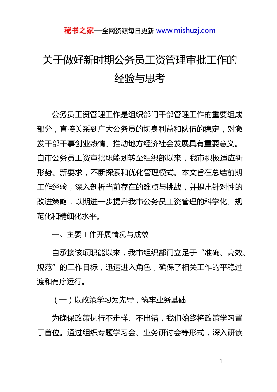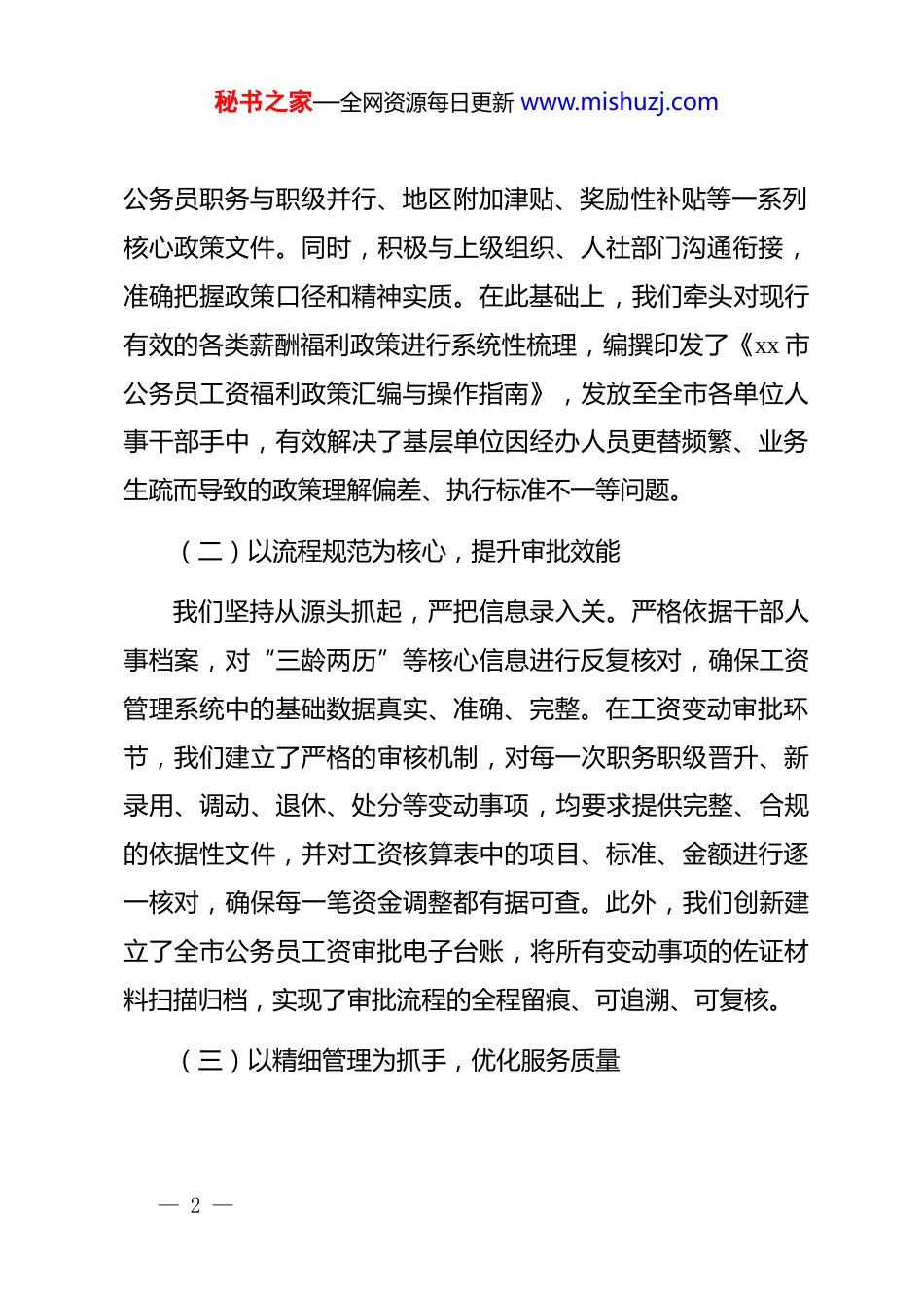 秘书之家—全网资源每日更新 www.mishuzj.com关于做好新时期公务员工资管理审批工作的经验与思考公务员工资管理工作是组织部门干部管理工作的重要组成部分,直接关系到广大公务员的切身利益和队伍的稳定,对激发干部干事创业热情、推动地方经济社会发展具有重要意义。自市公务员工资审批职能划转至组织部以来,我市积极适应新形势、新要求,不断探索和优化管理模式。本文旨在总结前期工作经验,深入剖析当前存在的难点与挑战,并提出针对性的改进策略,以期进一步提升我市公务员工资管理的科学化、规范化和精细化水平。一、主要工作开展情况与成效自承接该项职能以来,我市组织部门立足于“准确、高效、规范”的工作目标,迅速进入角色,确保了相关工作的平稳过渡和有序运行。(一)以政策学习为先导,筑牢业务基础为确保政策执行不走样、不出错,我们始终将政策学习置于首位。通过组织专题学习会、业务研讨会等形式,深入研读— 1 —秘书之家—全网资源每日更新 www.mishuzj.com公务员职务与职级并行、地区附加津贴、奖励性补贴等一系列核心政策文件。同时,积极与上级组织、人社部门沟通衔接,准确把握政策口径和精神实质。在此基础上,我们牵头对现行有效的各类薪酬福利政策进行系统性梳理,编撰印发了《xx 市公务员工资福利政策汇编与操作指南》,发放至全市各单位人事干部手中,有效解决了基层单位因经办人员更替频繁、业务生疏而导致的政策理解偏差、执行标准不一等问题。(二)以流程规范为核心,提升审批效能我们坚持从源头抓起,严把信息录入关。严格依据干部人事档案,对“三龄两历”等核心信息进行反复核对,确保工资管理系统中的基础数据真实、准确、完整。在工资变动审批环节,我们建立了严格的审核机制,对每一次职务职级晋升、新录用、调动、退休、处分等变动事项,均要求提供完整、合规的依据性文件,并对工资核算表中的项目、标准、金额进行逐一核对,确保每一笔资金调整都有据可查。此外,我们创新建立了全市公务员工资审批电子台账,将所有变动事项的佐证材料扫描归档,实现了审批流程的全程留痕、可追溯、可复核。(三)以精细管理为抓手,优化服务质量— 2 —秘书之家—全网资源每日更新 www.mishuzj.com为提升管理质效,我们建立了常态化的数据巡查机制,每月定期对工资系统数据进行比对分析,主动排查和预警异常数据。对发现的潜在问题,第一时间与相关单位联系,通过调阅工资档案、核对历史文件等方式予以纠正。在日常工作中,我们全面推行“一次性告知”和“即时办结”服务模式,对前来咨询或办理业务的同志,做到热情接待、耐心解答、高效审核。我们还建立了覆盖全市各单位人事干部的“工资业务工作群”,在人员调动、干部调整、职级晋升等关键时间节点,及时发布工作提示,在线指导业务办理,有效避免了因信息不畅导致工资关系转移不及时、待遇核算错误等情况的发生,赢得了基层单位的广泛好评。二、当前工作中存在的主要问题尽管我市在公务员工资管理方面取得了一定成效,但对照新时期高质量发展的要求,工作中仍存在一些亟待解决的深层次问题。(一)政策理解与执行的“温差”现象部分单位的人事干部对工资政策的理解仍然停留在表面,对一些特殊情况、复杂情形的政策运用能力不足,导致政策执— 3 —秘书之家—全网资源每日更新 www.mishuzj.com行在“最后一公里”出现偏差。一些单位对新旧政策的衔接把握不准,在处理涉及个人利益的敏感问题时,存在怕担责、不敢拍板的现象,将问题直接上交。一个突出的情况是,在处理受 dj 政务处分人员的工资待遇调整时,个别单位对于处分影响期满后如何恢复工资待遇、级别如何确定等具体操作细节理解不清,导致未能按规定及时调整到位,引发了不必要的矛盾。(二)信息孤岛与数据壁垒问题当前,干部管理信息系统、机构编制实名制系统与工资管理系统之间尚未实现完全的互联互通和数据实时共享。这种信息壁垒导致了数据不一致的风险。在实际操作中,可能出现某位干部在组织部门的任免文件已下发,职务已经变动,但其工资系统中的职务信息却未得到同步更新的情况。这种延迟或脱节,不仅影响了工资调整...