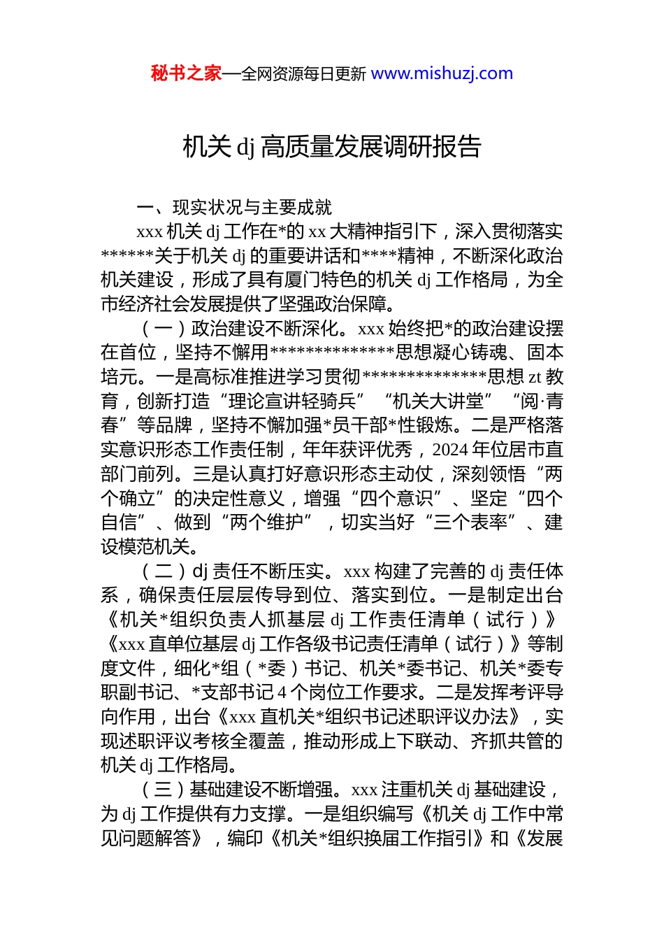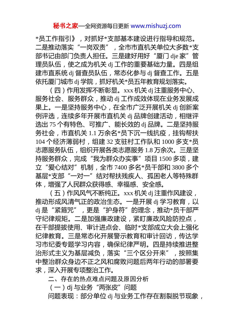 秘书之家—全网资源每日更新 www.mishuzj.com机关 dj 高质量发展调研报告一、现实状况与主要成就xxx 机关 dj 工作在*的 xx 大精神指引下,深入贯彻落实******关于机关 dj 的重要讲话和****精神,不断深化政治机关建设,形成了具有厦门特色的机关 dj 工作格局,为全市经济社会发展提供了坚强政治保障。(一)政治建设不断深化。xxx 始终把*的政治建设摆在首位,坚持不懈用**************思想凝心铸魂、固本培元。一是高标准推进学习贯彻**************思想 zt 教育,创新打造“理论宣讲轻骑兵”“机关大讲堂”“阅·青春”等品牌,坚持不懈加强*员干部*性锻炼。二是严格落实意识形态工作责任制,年年获评优秀,2024 年位居市直部门前列。三是认真打好意识形态主动仗,深刻领悟“两个确立”的决定性意义,增强“四个意识”、坚定“四个自信”、做到“两个维护”,切实当好“三个表率”、建设模范机关。(二)dj 责任不断压实。xxx 构建了完善的 dj 责任体系,确保责任层层传导到位、落实到位。一是制定出台《机关*组织负责人抓基层 dj 工作责任清单(试行)》《xxx 直单位基层 dj 工作各级书记责任清单(试行)》等制度文件,细化*组(*委)书记、机关*委书记、机关*委专职副书记、*支部书记 4 个岗位工作要求。二是发挥考评导向作用,出台《xxx 直机关*组织书记述职评议办法》,实现述职评议考核全覆盖,推动形成上下联动、齐抓共管的机关 dj 工作格局。(三)基础建设不断增强。xxx 注重机关 dj 基础建设,为 dj 工作提供有力支撑。一是组织编写《机关 dj 工作中常见问题解答》,编印《机关*组织换届工作指引》和《发展秘书之家—全网资源每日更新 www.mishuzj.com*员工作指引》,对抓好*支部基本建设进行指导和规范。二是推动落实“一岗双责”,全市市直机关单位大多数*支部书记由部门负责人担任。三是建好用好“厦门 dje 家”管理员队伍,使之成为机关 dj 工作的重要基础力量。四是组建市直系统 dj 督查员队伍,常态化参与 dj 督查工作。五是依托厦门城市 dj 学院,抓好机关*员五年教育规划落实。(四)作用发挥不断彰显。xxx 机关 dj 注重服务中心、服务社会、服务群众,推动 dj 工作成效体现在业务发展成果上。一是坚持服务中心,在全市广泛开展机关 dj 创新案例评选,连续多年开展市直机关 dj 品牌创建活动,相继评选出 75 个有特色、可推广、能长效的 dj 品牌。二是坚持服务社会,市直机关 1.1 万余名*员下沉一线抗疫,挂钩帮扶104 个经济薄弱村,组建 32 支驻村工作队和 1000 多支*员志愿服务队伍,组织开展各类志愿服务 1.8 万余次。三是坚持服务群众,完成“我为群众办实事”项目 1500 多项,建立“爱心结对”机制,全市 7400 多名*员干部和 3800 多个基层*支部“一对一”结对帮扶残疾人、孤困老人等特殊群体,增强了人民群众获得感、幸福感、安全感。(五)作风风气不断纯正。xxx 机关 dj 注重作风建设,推动形成风清气正的政治生态。一是开展 dj 学习教育,以dj 是“紧箍咒”,更是“护身符”的理念,推动*员干部严守纪律规矩。二是加强廉政建设,紧盯廉政风险防控点,在干部提拔使用、审计进点会、临时*支部成立大会上强化纪律教育。三是常态化开展警示教育和审计回访,传达学习市纪委专题学习内容,确保纪律严明。四是持续推进整治形式主义为基层减负,落实“三个区分开来”,按照集中整治群众身边不正之风和腐败问题后两年行动的部署要求,深入开展专项整治工作。二、存在的热点难点问题及原因分析(一)dj 与业务“两张皮”问题问题表现:部分单位 dj 与业务工作存在割裂脱节现象,秘书之家—全网资源每日更新 www.mishuzj.com谋划机关 dj 工作时对业务工作考虑不多,部署业务工作时没有考虑发挥机关基层*组织的作用,工作推动缺乏统筹,措施办法缺乏融合。有的机关基层*组织建设和业务工作“貌合神离”,dj 和业务融合停留在表面“物理拼接”层面,缺少深度“化学反应”。原因分析:一是思想认识不到位,部分*员干部存在“重业务轻 dj”现象,认为业务工作是“显绩”...