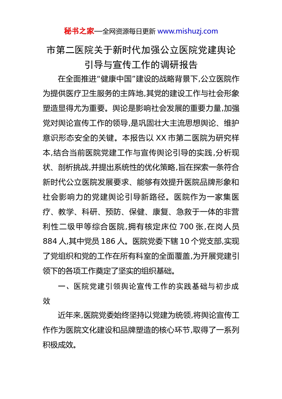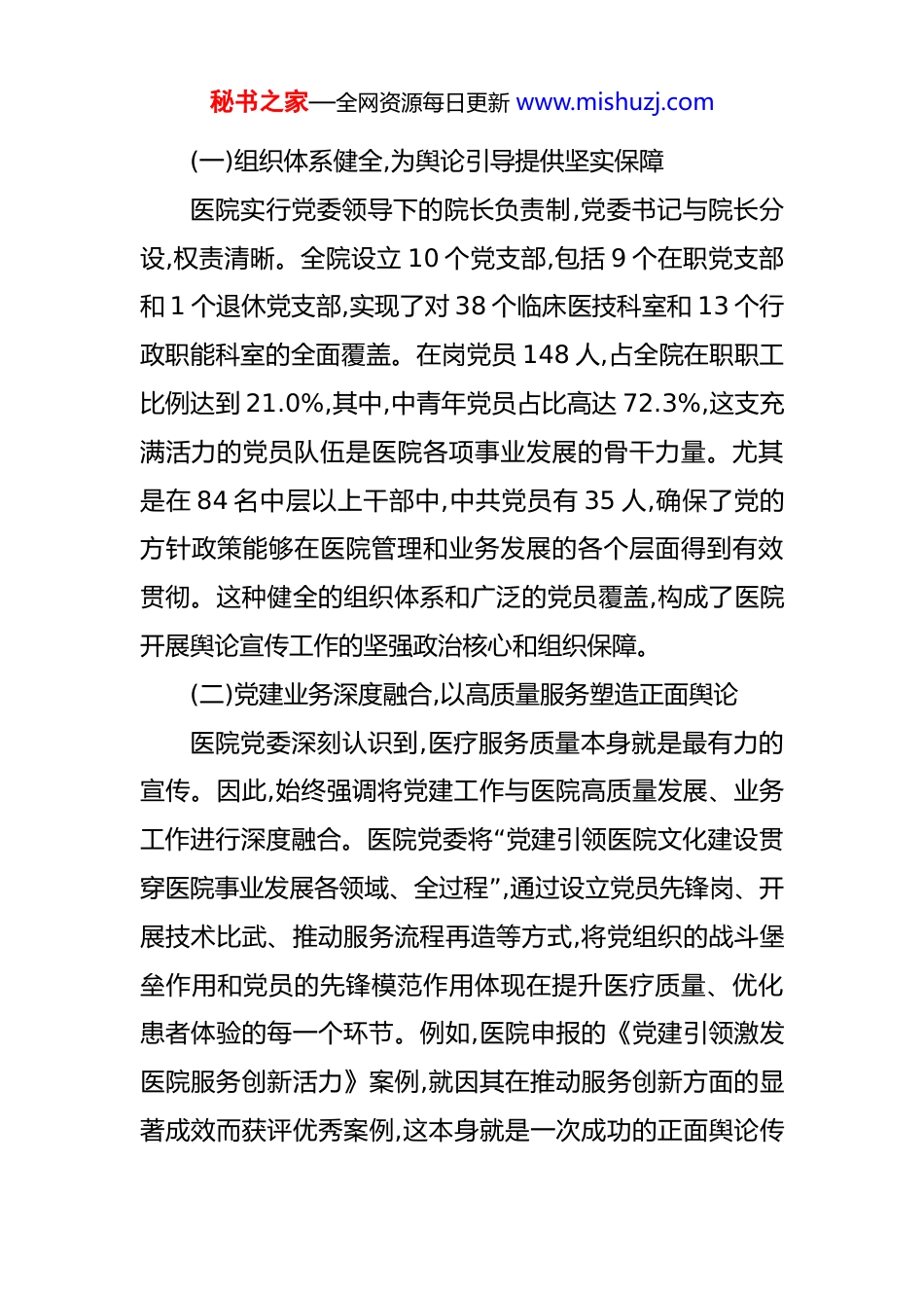 秘书之家—全网资源每日更新 www.mishuzj.com市第二医院关于新时代加强公立医院党建舆论引导与宣传工作的调研报告 “”在全面推进 健康中国 建设的战略背景下,公立医院作为提供医疗卫生服务的主阵地,其党的建设工作与社会形象塑造显得尤为重要。舆论是影响社会发展的重要力量,加强党对舆论宣传工作的领导,是巩固壮大主流思想舆论、维护意识形态安全的关键。本报告以 XX 市第二医院为研究样本,结合当前医院党建工作与宣传舆论引导的实践,分析现状、剖析挑战,并提出系统性的优化策略,旨在探索一条符合新时代公立医院发展要求、能够有效提升医院品牌形象和社会影响力的党建舆论引导新路径。医院作为一家集医疗、教学、科研、预防、保健、康复、急救于一体的非营利性二级甲等综合医院,拥有核定床位 700 张,在岗人员884 人,其中党员 186 人。医院党委下辖 10 个党支部,实现了党组织和党的工作在所有科室的全面覆盖,为开展党建引领下的各项工作奠定了坚实的组织基础。一、医院党建引领舆论宣传工作的实践基础与初步成效近年来,医院党委始终坚持以党建为统领,将舆论宣传工作作为医院文化建设和品牌塑造的核心环节,取得了一系列积极成效。秘书之家—全网资源每日更新 www.mishuzj.com(一)组织体系健全,为舆论引导提供坚实保障医院实行党委领导下的院长负责制,党委书记与院长分设,权责清晰。全院设立 10 个党支部,包括 9 个在职党支部和 1 个退休党支部,实现了对 38 个临床医技科室和 13 个行政职能科室的全面覆盖。在岗党员 148 人,占全院在职职工比例达到 21.0%,其中,中青年党员占比高达 72.3%,这支充满活力的党员队伍是医院各项事业发展的骨干力量。尤其是在 84 名中层以上干部中,中共党员有 35 人,确保了党的方针政策能够在医院管理和业务发展的各个层面得到有效贯彻。这种健全的组织体系和广泛的党员覆盖,构成了医院开展舆论宣传工作的坚强政治核心和组织保障。(二)党建业务深度融合,以高质量服务塑造正面舆论医院党委深刻认识到,医疗服务质量本身就是最有力的宣传。因此,始终强调将党建工作与医院高质量发展、业务“工作进行深度融合。医院党委将 党建引领医院文化建设贯”穿医院事业发展各领域、全过程 ,通过设立党员先锋岗、开展技术比武、推动服务流程再造等方式,将党组织的战斗堡垒作用和党员的先锋模范作用体现在提升医疗质量、优化患者体验的每一个环节。例如,医院申报的《党建引领激发医院服务创新活力》案例,就因其在推动服务创新方面的显著成效而获评优秀案例,这本身就是一次成功的正面舆论传秘书之家—全网资源每日更新 www.mishuzj.com播,向社会展示了医院以党建促发展的坚定决心和实际成果。(三)打造特色党建品牌,构建宣传工作核心抓手品牌是形象的载体,是舆论引导的焦点。医院党委高度重视党建品牌的创建与培育工作,“”“通过 品牌党委 和 品牌支”部 创建活动,形成了一批具有辨识度和影响力的党建文化品牌。例如,“”医院精心打造的 敬佑生命、甘于奉献 党建品牌,“以及 医路向党,”守护健康 的口号,鲜明地传递了医院的核心价值追求。同时,“”“通过举办 仁爱党建文化集市 、组织 书香”“二院 读书会、设立 XX”模范志愿服务岗 等活动,将抽象的党建理念转化为具体、生动、可感的文化实践,极大地增强了党建工作的吸引力和感染力,为正面宣传提供了源源不断的鲜活素材。这些品牌活动不仅凝聚了内部职工,也成为向社会展示医院良好形象的重要窗口。(四)拓展全媒体宣传矩阵,积极传播医院正能量在信息传播渠道日益多元化的今天,医院主动适应媒体生态变化,构建了多层次、立体化的宣传矩阵。一方面,充分利用微信公众号、医院官网、院内资讯等自有平台,定期发布医院动态、健康科普、先进事迹等内容。另一方面,积极加强与国家、省、市级主流媒体的合作,主动策划选题,通过权威媒体平台讲述医院故事,传播医者仁心。例如,在疫情防秘书之家—全网资源每日更新 www.mishuzj.com控、文明城市创建等重大工作中,医院党员干部冲锋在前的事迹,通过媒体报道得到了广泛传播有效塑造了医院勇于担当的社会形象。通过这些努力,医院逐步建立...