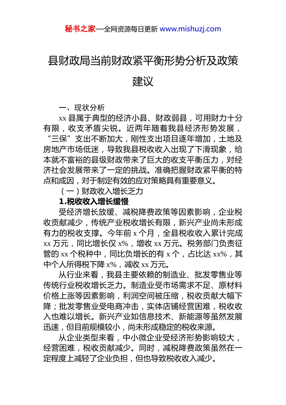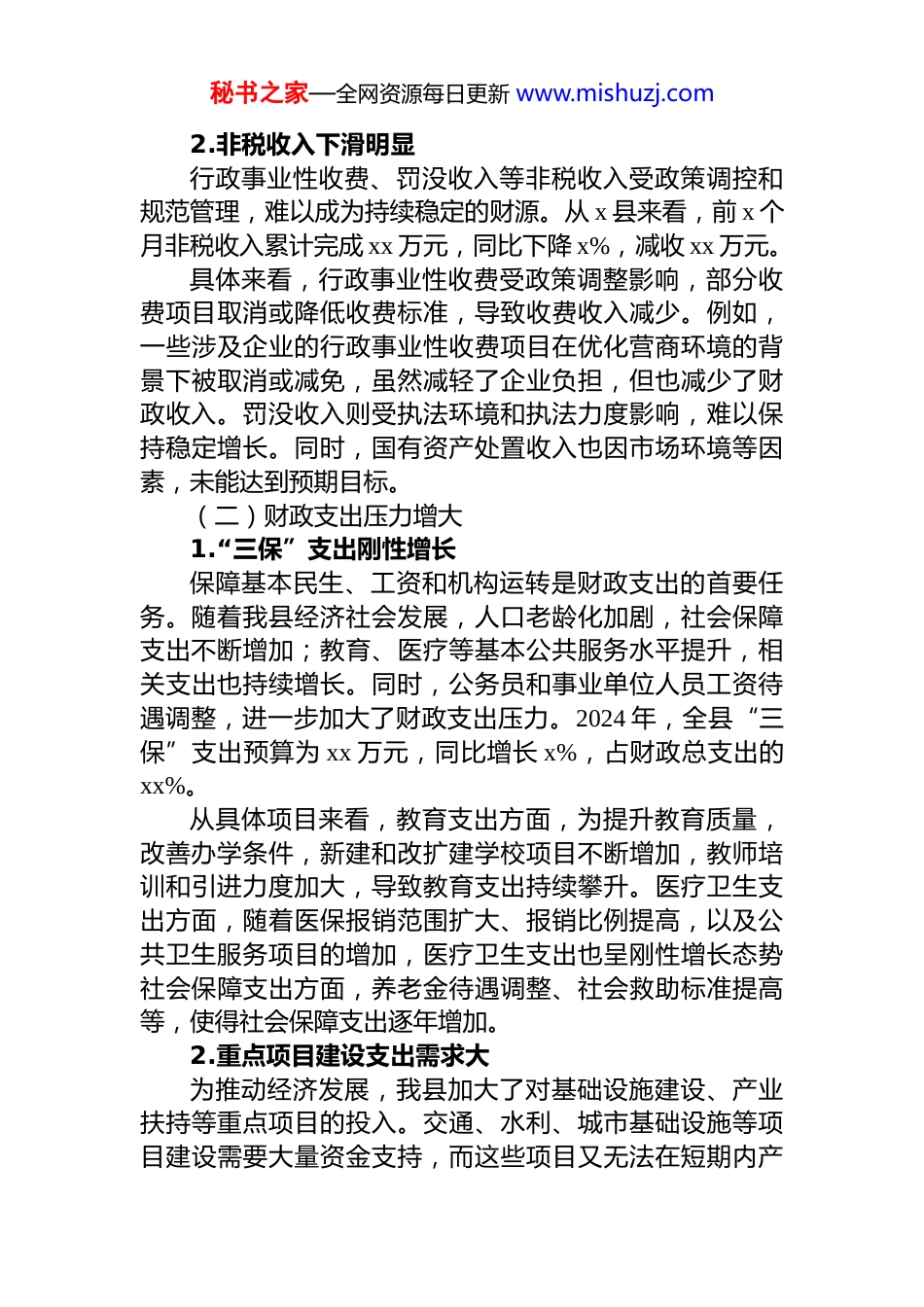 秘书之家—全网资源每日更新 www.mishuzj.com县财政局当前财政紧平衡形势分析及政策建议一、现状分析xx 县属于典型的经济小县、财政弱县,可用财力十分有限,收支矛盾尖锐。近两年随着我县经济形势发展,“三保”支出不断加大,刚性支出项目逐年增加,土地及房地产市场低迷,导致我县税收收入出现了下滑现象,给本就不富裕的县级财政带来了巨大的收支平衡压力,对经济社会发展带来了一定的挑战。准确把握财政紧平衡的特点和成因,对于制定有效的应对策略具有重要意义。(一)财政收入增长乏力1.税收收入增长缓慢受经济增长放缓、减税降费政策等因素影响,企业税收贡献减少,传统产业税收增长有限,新兴产业尚未形成有力的税收支撑。今年前 x 个月,全县税收收入累计完成xx 万元,同比增长仅 x%,增收 xx 万元。税务部门负责征管的 xx 个税种中,同比负增长的有 x 个,占比达 xx%,其中个人所得税下降 x%,减收 xx 万元。从行业来看,我县主要依赖的制造业、批发零售业等传统行业税收增长乏力。制造业受市场需求不足、原材料价格上涨等因素影响,利润空间被压缩,税收贡献大幅下降;批发零售业受电商冲击,实体店铺经营困难,税收收入也难以增长。新兴产业如信息技术、新能源等虽然发展迅速,但目前规模较小,尚未形成稳定的税收来源。从企业类型来看,中小微企业受经济形势影响较大,经营困难,税收贡献减少。同时,减税降费政策虽然在一定程度上减轻了企业负担,但也导致税收收入减少。秘书之家—全网资源每日更新 www.mishuzj.com2.非税收入下滑明显行政事业性收费、罚没收入等非税收入受政策调控和规范管理,难以成为持续稳定的财源。从 x 县来看,前 x 个月非税收入累计完成 xx 万元,同比下降 x%,减收 xx 万元。具体来看,行政事业性收费受政策调整影响,部分收费项目取消或降低收费标准,导致收费收入减少。例如,一些涉及企业的行政事业性收费项目在优化营商环境的背景下被取消或减免,虽然减轻了企业负担,但也减少了财政收入。罚没收入则受执法环境和执法力度影响,难以保持稳定增长。同时,国有资产处置收入也因市场环境等因素,未能达到预期目标。(二)财政支出压力增大1.“三保”支出刚性增长保障基本民生、工资和机构运转是财政支出的首要任务。随着我县经济社会发展,人口老龄化加剧,社会保障支出不断增加;教育、医疗等基本公共服务水平提升,相关支出也持续增长。同时,公务员和事业单位人员工资待遇调整,进一步加大了财政支出压力。2024 年,全县“三保”支出预算为 xx 万元,同比增长 x%,占财政总支出的xx%。从具体项目来看,教育支出方面,为提升教育质量,改善办学条件,新建和改扩建学校项目不断增加,教师培训和引进力度加大,导致教育支出持续攀升。医疗卫生支出方面,随着医保报销范围扩大、报销比例提高,以及公共卫生服务项目的增加,医疗卫生支出也呈刚性增长态势社会保障支出方面,养老金待遇调整、社会救助标准提高等,使得社会保障支出逐年增加。2.重点项目建设支出需求大为推动经济发展,我县加大了对基础设施建设、产业扶持等重点项目的投入。交通、水利、城市基础设施等项目建设需要大量资金支持,而这些项目又无法在短期内产秘书之家—全网资源每日更新 www.mishuzj.com生经济效益,给财政支出带来较大压力。2024 年,全县重点项目建设支出预算为 xx 万元,同比增长 x%。例如,交通基础设施建设方面,新建高速公路、农村公路改造等项目需要大量资金投入,且建设周期长,资金回收慢。产业扶持方面,为吸引投资、促进产业升级,我县出台了一系列优惠政策,包括税收优惠、财政补贴等,这些政策措施虽然对产业发展起到了积极作用,但也增加了财政支出负担。3.债务还本付息压力大近年来,为弥补财政资金缺口,我县通过发行地方政府债券等方式筹集资金用于项目建设。随着债务到期,还本付息压力逐渐增大。2024 年,全县债务还本付息支出预算为 xx 万元,占财政总支出的 xx%。从债务结构来看,地方政府专项债券还本付息支出占比较大。这些专项债券主要用于支持重大项目建设,如产业园区建设、棚户区改造等...