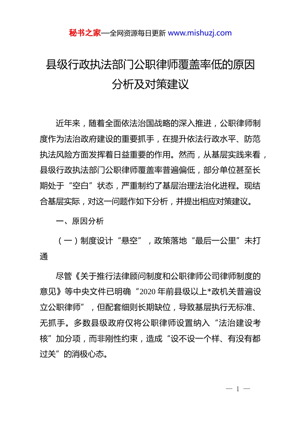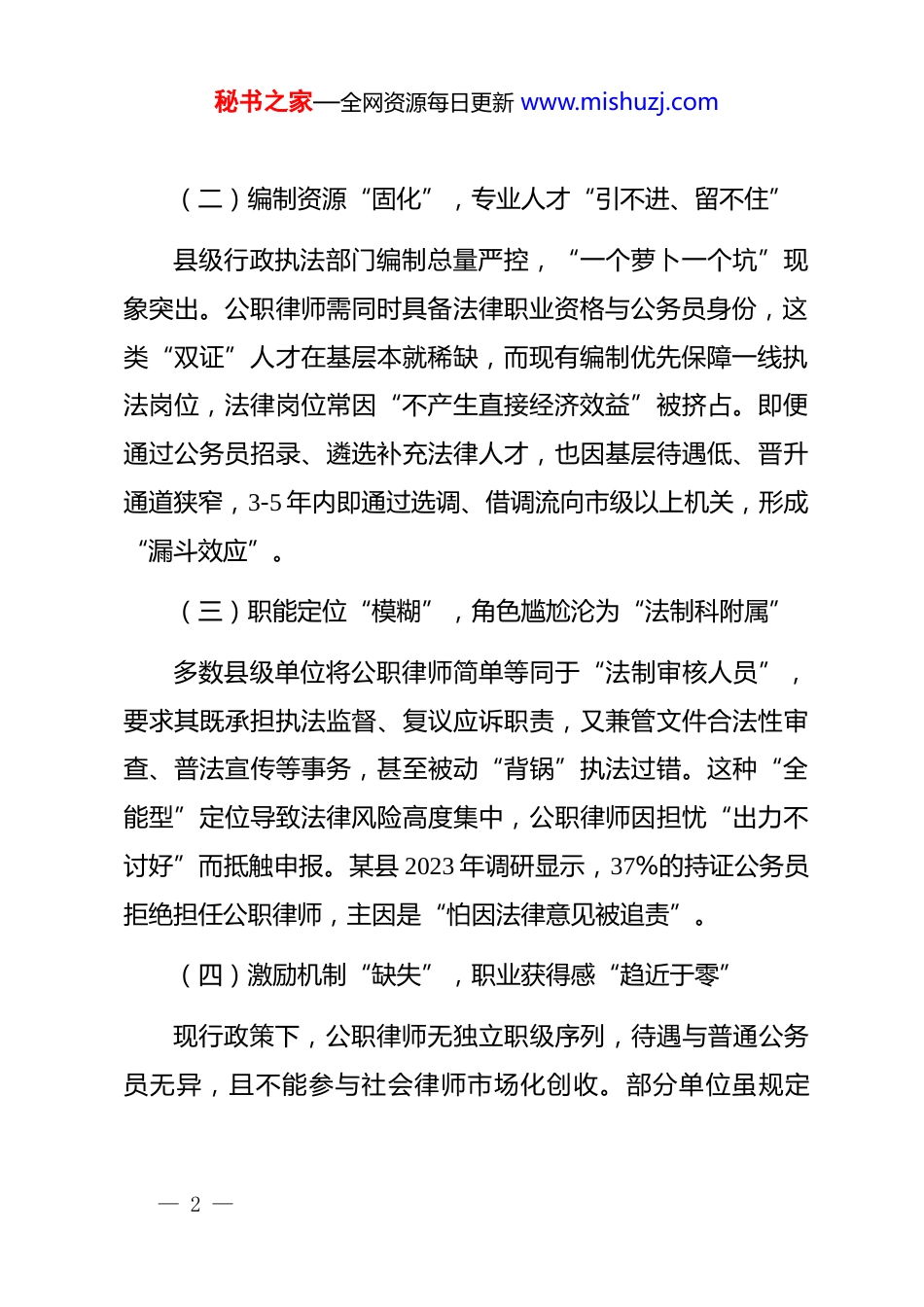 秘书之家—全网资源每日更新 www.mishuzj.com县级行政执法部门公职律师覆盖率低的原因分析及对策建议近年来,随着全面依法治国战略的深入推进,公职律师制度作为法治政府建设的重要抓手,在提升依法行政水平、防范执法风险方面发挥着日益重要的作用。然而,从基层实践来看,县级行政执法部门公职律师覆盖率普遍偏低,部分单位甚至长期处于“空白”状态,严重制约了基层治理法治化进程。现结合基层实际,对这一问题作如下分析,并提出相应对策建议。一、原因分析(一)制度设计“悬空”,政策落地“最后一公里”未打通尽管《关于推行法律顾问制度和公职律师公司律师制度的意见》等中央文件已明确“2020 年前县级以上*政机关普遍设立公职律师”,但配套细则长期缺位,导致基层执行无标准、无抓手。多数县级政府仅将公职律师设置纳入“法治建设考核”加分项,而非刚性约束,造成“设不设一个样、有没有都过关”的消极心态。— 1 —秘书之家—全网资源每日更新 www.mishuzj.com(二)编制资源“固化”,专业人才“引不进、留不住”县级行政执法部门编制总量严控,“一个萝卜一个坑”现象突出。公职律师需同时具备法律职业资格与公务员身份,这类“双证”人才在基层本就稀缺,而现有编制优先保障一线执法岗位,法律岗位常因“不产生直接经济效益”被挤占。即便通过公务员招录、遴选补充法律人才,也因基层待遇低、晋升通道狭窄,3-5 年内即通过选调、借调流向市级以上机关,形成“漏斗效应”。(三)职能定位“模糊”,角色尴尬沦为“法制科附属”多数县级单位将公职律师简单等同于“法制审核人员”,要求其既承担执法监督、复议应诉职责,又兼管文件合法性审查、普法宣传等事务,甚至被动“背锅”执法过错。这种“全能型”定位导致法律风险高度集中,公职律师因担忧“出力不讨好”而抵触申报。某县 2023 年调研显示,37%的持证公务员拒绝担任公职律师,主因是“怕因法律意见被追责”。(四)激励机制“缺失”,职业获得感“趋近于零”现行政策下,公职律师无独立职级序列,待遇与普通公务员无异,且不能参与社会律师市场化创收。部分单位虽规定— 2 —秘书之家—全网资源每日更新 www.mishuzj.com“公职律师办案可领取补贴”,但县级财政普遍未将经费纳入预算,实际执行中“能拖就拖”。某贫困县司法局坦言:“一个行政复议案件补贴 200 元,还不够打印案卷成本。”长期“既让马儿跑,又让马儿不吃草”,必然挫伤积极性。(五)培训体系“断层”,知识更新“跟不上、用不上”县级部门培训资源匮乏,公职律师年均参训机会不足 1 次,内容仍以“新法释义”为主,缺乏执法实务、舆情应对等实操课程。某县市场监管局公职律师反映:“我们处理的 80%案件涉及食品安全认定,但培训还在重复讲解《行政处罚法》条文。”知识供需脱节导致“持证却不会办案”,反向加剧单位“设岗无用”的认知。二、对策建议(一)以“刚性考核”破解“设而不立”由省级依法治省办牵头,将公职律师覆盖率纳入县级政府“法治建设”一票否决指标,明确“2025 年底前,县级行政执法部门公职律师配备率不低于 50%,重大执法决定法制审核事项 100%由公职律师参与”。对未达标单位,冻结其评优评先资格,并扣减年度编制招录计划,倒逼“一把手”主动解决— 3 —秘书之家—全网资源每日更新 www.mishuzj.com“有人用”问题。(二)以“编制池”制度打破“人才壁垒”建立“县级公职律师专项编制池”,由省级编办单列 5%的政法专项编制,定向用于招录、遴选法律职业资格人才,实行“县管市用”模式:编制关系留在县级,但工资、职级由市级统筹,工作满 5 年后可择优晋升至市级机关。通过“编制上浮一级”解决基层“留不住人”的痛点,某试点县 2022 年实施该政策后,公职律师流失率从 60%降至 12%。(三)以“权责清单”杜绝“无限背锅”省级行政执法部门需制定《县级公职律师权责负面清单》明确“仅对书面法律意见负责”“不参与具体执法操作”等免责条款,建立“公职律师意见档案”,对采纳意见后仍出现的执法过错,免除其个人责任。同时,赋予公职律师对违法执法的“一票否决权”,其签署...