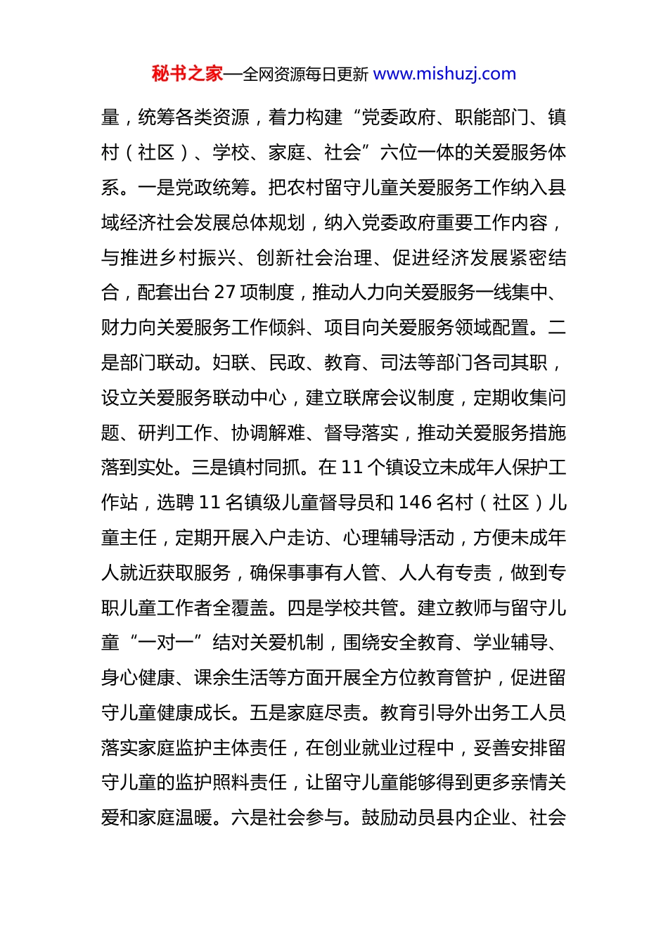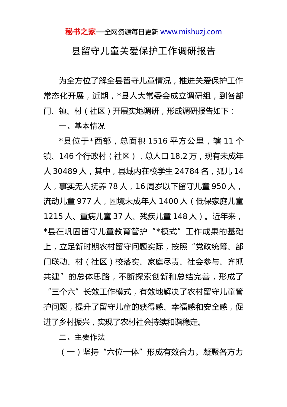 秘书之家—全网资源每日更新 www.mishuzj.com县留守儿童关爱保护工作调研报告 为全方位了解全县留守儿童情况,推进关爱保护工作常态化开展,近期,*县人大常委会成立调研组,到各部门、镇、村(社区)开展实地调研,形成调研报告如下:一、基本情况*县位于*西部,总面积 1516 平方公里,辖 11 个镇、146 个行政村(社区),总人口 18.2 万,现有未成年人 30489 人,其中,县域内在校学生 24784 名,孤儿 14人,事实无人抚养 78 人,16 周岁以下留守儿童 950 人,流动儿童 977 人,困境未成年人 1400 人(低保家庭儿童1215 人、重病儿童 37 人、残疾儿童 148 人)。近年来,*县在巩固留守儿童教育管护“*模式”工作成果的基础上,立足新时期农村留守问题实际,按照“党政统筹、部门联动、村(社区)校落实、家庭尽责、社会参与、齐抓共建”的总体思路,不断探索创新和总结完善,形成了“三个六”长效工作模式,有效地解决了农村留守儿童管护问题,提升了留守儿童的获得感、幸福感和安全感,促进了乡村振兴,实现了农村社会持续和谐稳定。二、主要作法(一)坚持“六位一体”形成有效合力。凝聚各方力秘书之家—全网资源每日更新 www.mishuzj.com量,统筹各类资源,着力构建“党委政府、职能部门、镇村(社区)、学校、家庭、社会”六位一体的关爱服务体系。一是党政统筹。把农村留守儿童关爱服务工作纳入县域经济社会发展总体规划,纳入党委政府重要工作内容,与推进乡村振兴、创新社会治理、促进经济发展紧密结合,配套出台 27 项制度,推动人力向关爱服务一线集中、财力向关爱服务工作倾斜、项目向关爱服务领域配置。二是部门联动。妇联、民政、教育、司法等部门各司其职,设立关爱服务联动中心,建立联席会议制度,定期收集问题、研判工作、协调解难、督导落实,推动关爱服务措施落到实处。三是镇村同抓。在 11 个镇设立未成年人保护工作站,选聘 11 名镇级儿童督导员和 146 名村(社区)儿童主任,定期开展入户走访、心理辅导活动,方便未成年人就近获取服务,确保事事有人管、人人有专责,做到专职儿童工作者全覆盖。四是学校共管。建立教师与留守儿童“一对一”结对关爱机制,围绕安全教育、学业辅导、身心健康、课余生活等方面开展全方位教育管护,促进留守儿童健康成长。五是家庭尽责。教育引导外出务工人员落实家庭监护主体责任,在创业就业过程中,妥善安排留守儿童的监护照料责任,让留守儿童能够得到更多亲情关爱和家庭温暖。六是社会参与。鼓励动员县内企业、社会秘书之家—全网资源每日更新 www.mishuzj.com组织、爱心人士、志愿队伍等社会力量,积极参与留守儿童关爱服务事业,常态化开展关爱服务公益活动,营造了全社会关心关爱农村留守儿童的浓厚氛围。(二)坚持“六制”并举做到常态长效。一是动态监测机制。建立县镇村三级信息收集、报送、研判机制,对留守人员信息定期核实更新,实行动态管理,确保底子清、信息准、情况明。二是关爱服务机制。通过结对帮扶、代理家长、校外托管、志愿服务等多种方式,为留守儿童提供全方位服务。三是落实政府保护机制。将留守儿童关爱服务工作纳入“321”网格化管理,常态开展法律宣传、线索收集、突发处置、评估帮扶、监护干预工作,全面保障留守儿童健康成长。四是权益维护机制。整合民政、公安、法院、司法等部门资源,组建妇女儿童维权服务中心、报警中心、合议庭、律师工作站和儿童庇护中心等机构,构建起集强制报告、应急处置、法律援助为一体的维权体系。五是投入保障机制。建立政府投入为主、社会资金为补充的资金筹措机制,保障留守儿童校内外关爱服务工作正常开展。六是督查考核机制。建立完善了关爱服务工作考核奖惩和责任追究机制,将工作质效与评优树模挂钩,促进各级各部门积极履职尽责。(三)坚持“六有”目标做到服务周全。一是精神有秘书之家—全网资源每日更新 www.mishuzj.com关怀。常态化开展亲情陪护、走访慰问、精神慰藉等关爱活动,搭建沟通桥梁,让留守不孤单。二是困难有帮扶。从“两代一委”、教师、党员、干部队伍中遴选代理家长、“爱心妈妈”,开展“...