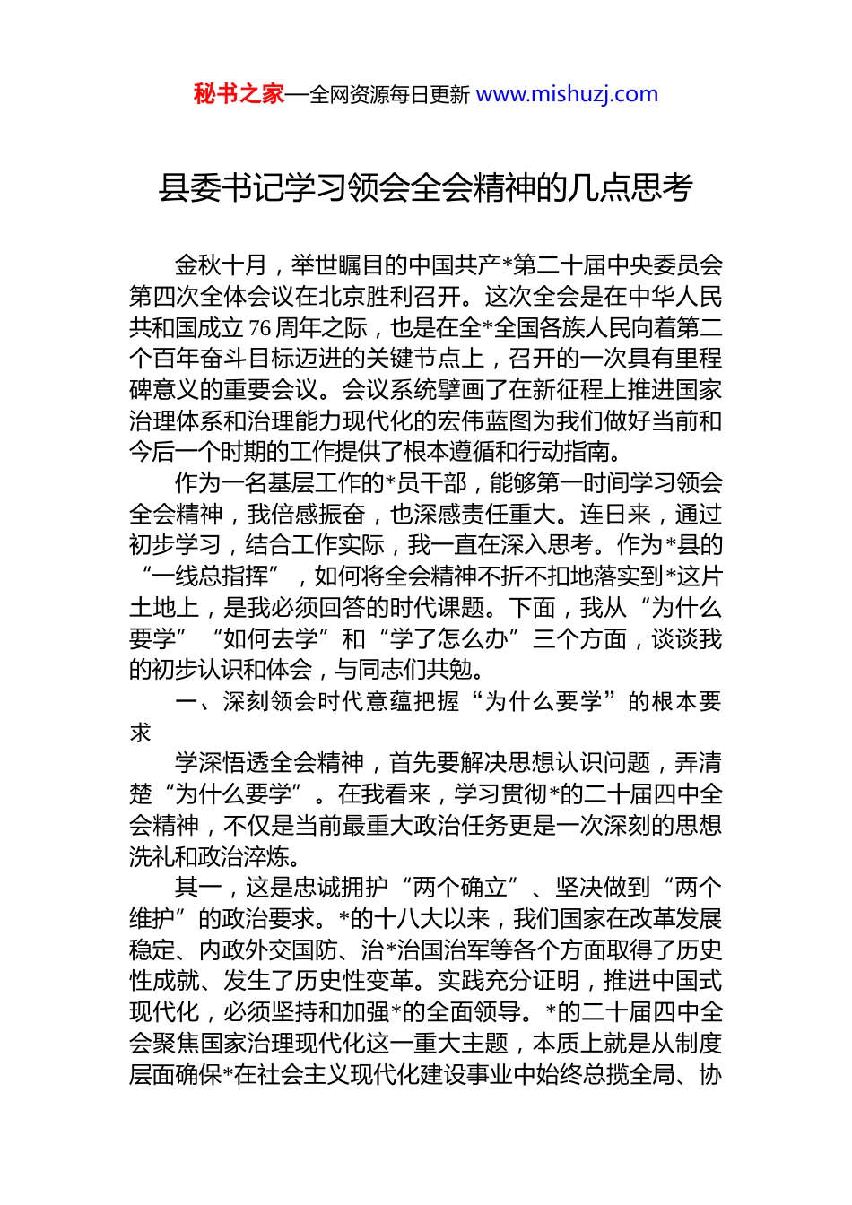 秘书之家—全网资源每日更新 www.mishuzj.com县委书记学习领会全会精神的几点思考金秋十月,举世瞩目的中国共产*第二十届中央委员会第四次全体会议在北京胜利召开。这次全会是在中华人民共和国成立 76 周年之际,也是在全*全国各族人民向着第二个百年奋斗目标迈进的关键节点上,召开的一次具有里程碑意义的重要会议。会议系统擘画了在新征程上推进国家治理体系和治理能力现代化的宏伟蓝图为我们做好当前和今后一个时期的工作提供了根本遵循和行动指南。作为一名基层工作的*员干部,能够第一时间学习领会全会精神,我倍感振奋,也深感责任重大。连日来,通过初步学习,结合工作实际,我一直在深入思考。作为*县的“一线总指挥”,如何将全会精神不折不扣地落实到*这片土地上,是我必须回答的时代课题。下面,我从“为什么要学”“如何去学”和“学了怎么办”三个方面,谈谈我的初步认识和体会,与同志们共勉。一、深刻领会时代意蕴把握“为什么要学”的根本要求学深悟透全会精神,首先要解决思想认识问题,弄清楚“为什么要学”。在我看来,学习贯彻*的二十届四中全会精神,不仅是当前最重大政治任务更是一次深刻的思想洗礼和政治淬炼。其一,这是忠诚拥护“两个确立”、坚决做到“两个维护”的政治要求。*的十八大以来,我们国家在改革发展稳定、内政外交国防、治*治国治军等各个方面取得了历史性成就、发生了历史性变革。实践充分证明,推进中国式现代化,必须坚持和加强*的全面领导。*的二十届四中全会聚焦国家治理现代化这一重大主题,本质上就是从制度层面确保*在社会主义现代化建设事业中始终总揽全局、协秘书之家—全网资源每日更新 www.mishuzj.com调各方。作为县委书记,我必须带头学习、带头领悟,不断提高政治判断力、政治领悟力、政治执行力,确保*中央的决策部署在*一贯到底、落地生根,任何时候都不能有偏差、不能打折扣。其二,这是推动高质量发展的现实需要。当前,*正处在转型升级、追赶跨越的关键时期。根据“十四五”规划的目标,到 2025 年,我们的地区生产总值要力争达到 xx 亿元。从今年前三季度的经济运行情况看,我们面临的外部环境依然复杂,内部结构性矛盾依然突出,发展的任务艰巨而繁重。如何有效防范化解风险、如何激发市场主体活力、如何保障和改善民生、如何守好生态和安全两条底线这些都是摆在我们面前的现实考验。*的二十届四中全会提出的关于推进国家治理体系和治理能力现代化的新理念、新思想、新战略,就像一把“金钥匙”,为我们破解发展难题、厚植发展优势提供了科学指引。不学深、不悟透,就可能在工作中迷失方向,错失发展机遇。其三,这是提升干部队伍履职能力的内在逻辑。推进治理能力现代化,关键在人,关键在干部。面对新形势新任务,我们的一些干部或多或少还存在本领恐慌、能力赤字的问题。有的习惯于老办法、旧路径,对新发展理念理解不深;有的攻坚克难的锐气不足,存在“躺平”心态;有的服务群众的意识和能力不强,工作方法简单。学习全会精神,就是要引导全县广大*员干部,特别是领导干部,主动对标对表中央的新要求,来一次思想观念的大更新、能力素质的大提升、工作作风的大转变,从而更好地肩负起时代赋予我们的重任。二、坚持理论联系实际探索“如何去学”的有效路径学习领会全会精神,不能停留在口号上,更不能满足于“一知半解”,必须下足“真学、真懂、真信、真用”的功夫。我感到,要真正学到精髓、悟透要义,必须坚持以下几个结合。秘书之家—全网资源每日更新 www.mishuzj.com一是坚持原原本本学与融会贯通学相结合。学习全会精神,首先要静下心来,原原本本、逐字逐句地研读全会公报以及审议通过的《决定》等重要文件。只有吃透了原文,才能准确把握其精神实质和核心要义。同时,要把学习全会精神同学习*的二十大精神结合起来,同学习历次中央全会精神贯通起来,特别是要与*的十九届四中全会关于国家治理体系和治理能力现代化的《决定》对比学习,深刻理解*中央在不同历史阶段对这一重大课题的战略考量和部署,从而形成一个系统、完整、立体的认识。二是坚持“关键少数”带头学与“绝大多数”跟进学相结合...