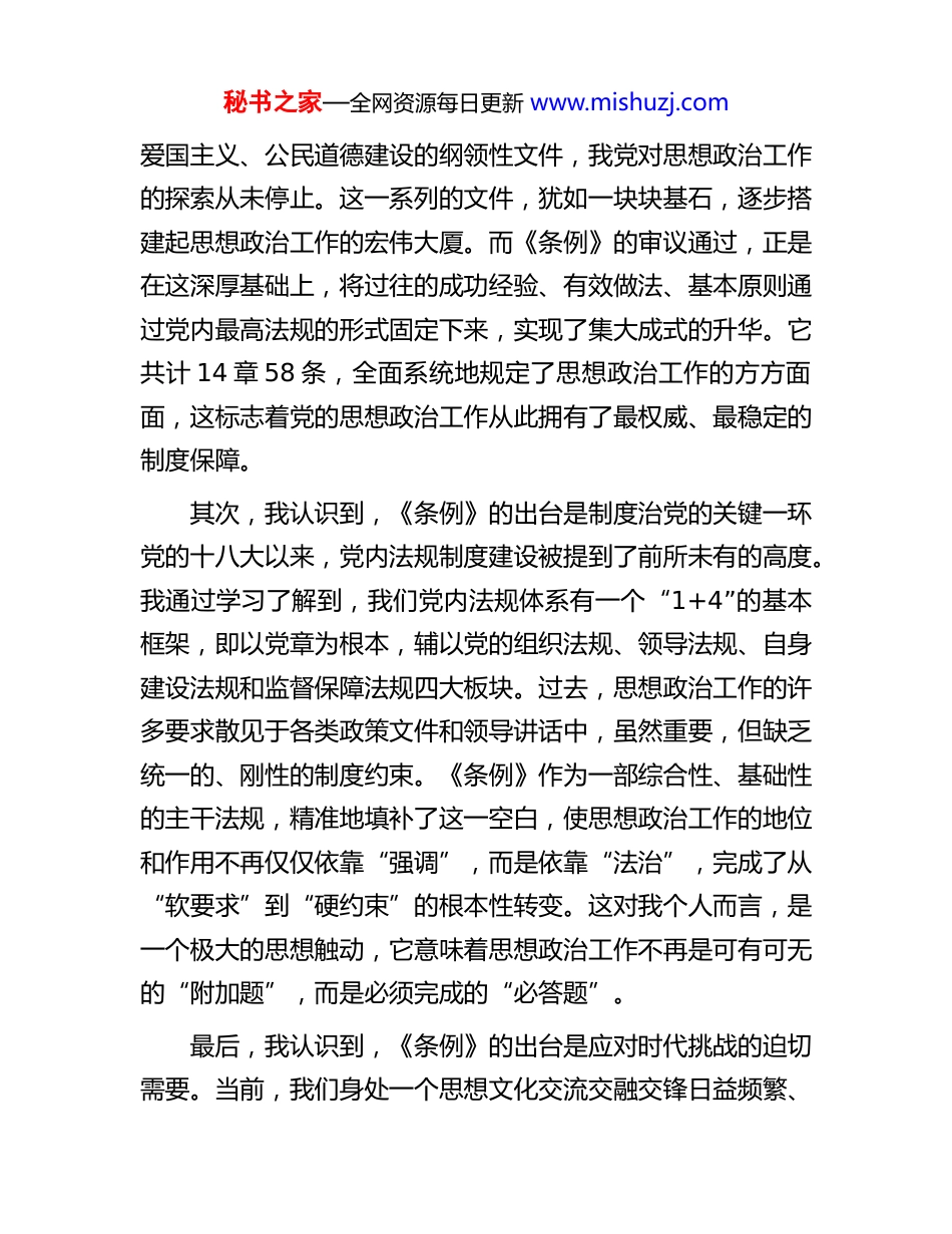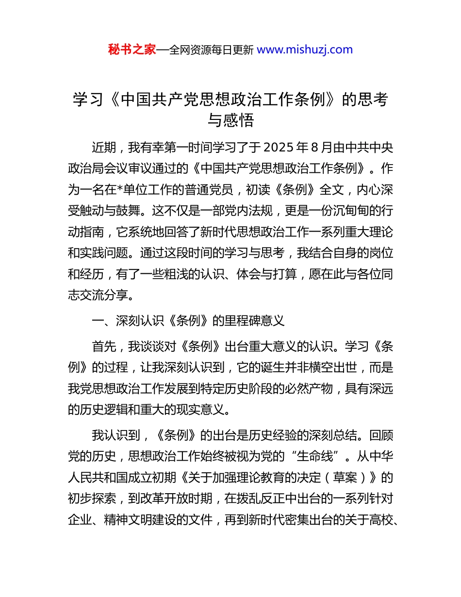 秘书之家—全网资源每日更新 www.mishuzj.com学习《中国共产党思想政治工作条例》的思考与感悟近期,我有幸第一时间学习了于 2025 年 8 月由中共中央政治局会议审议通过的《中国共产党思想政治工作条例》。作为一名在*单位工作的普通党员,初读《条例》全文,内心深受触动与鼓舞。这不仅是一部党内法规,更是一份沉甸甸的行动指南,它系统地回答了新时代思想政治工作一系列重大理论和实践问题。通过这段时间的学习与思考,我结合自身的岗位和经历,有了一些粗浅的认识、体会与打算,愿在此与各位同志交流分享。一、深刻认识《条例》的里程碑意义首先,我谈谈对《条例》出台重大意义的认识。学习《条例》的过程,让我深刻认识到,它的诞生并非横空出世,而是我党思想政治工作发展到特定历史阶段的必然产物,具有深远的历史逻辑和重大的现实意义。我认识到,《条例》的出台是历史经验的深刻总结。回顾党的历史,思想政治工作始终被视为党的“生命线”。从中华人民共和国成立初期《关于加强理论教育的决定(草案)》的初步探索,到改革开放时期,在拨乱反正中出台的一系列针对企业、精神文明建设的文件,再到新时代密集出台的关于高校、秘书之家—全网资源每日更新 www.mishuzj.com爱国主义、公民道德建设的纲领性文件,我党对思想政治工作的探索从未停止。这一系列的文件,犹如一块块基石,逐步搭建起思想政治工作的宏伟大厦。而《条例》的审议通过,正是在这深厚基础上,将过往的成功经验、有效做法、基本原则通过党内最高法规的形式固定下来,实现了集大成式的升华。它共计 14 章 58 条,全面系统地规定了思想政治工作的方方面面,这标志着党的思想政治工作从此拥有了最权威、最稳定的制度保障。其次,我认识到,《条例》的出台是制度治党的关键一环党的十八大以来,党内法规制度建设被提到了前所未有的高度。我通过学习了解到,我们党内法规体系有一个“1+4”的基本框架,即以党章为根本,辅以党的组织法规、领导法规、自身建设法规和监督保障法规四大板块。过去,思想政治工作的许多要求散见于各类政策文件和领导讲话中,虽然重要,但缺乏统一的、刚性的制度约束。《条例》作为一部综合性、基础性的主干法规,精准地填补了这一空白,使思想政治工作的地位和作用不再仅仅依靠“强调”,而是依靠“法治”,完成了从“软要求”到“硬约束”的根本性转变。这对我个人而言,是一个极大的思想触动,它意味着思想政治工作不再是可有可无的“附加题”,而是必须完成的“必答题”。最后,我认识到,《条例》的出台是应对时代挑战的迫切需要。当前,我们身处一个思想文化交流交融交锋日益频繁、秘书之家—全网资源每日更新 www.mishuzj.com社会思潮纷繁复杂、信息技术深刻改变舆论生态的时代。如何在一个价值多元的社会里凝聚共识、在一个快速变化的时代里坚定信念,是摆在我们面前的重大课题。《条例》明确以习近平新时代中国特色社会主义思想为指导,强调要用其凝心铸魂,这为我们在复杂环境中廓清思想迷雾、站稳政治立场提供了根本遵循。它所构建的党委统一领导、党政齐抓共管、全党全社会共同参与的工作格局,为我们应对挑战提供了强大的组织保障。二、准确把握《条例》的实践要求在反复研读《条例》原文,并参与单位组织的专题学习后我谈谈自己学习过程中的几点深刻体会。我体会到,学习《条例》不能停留在文字表面,而必须深入其内涵,用心感悟其蕴含的实践智慧和为民情怀。我的第一点体会是,思想政治工作充满了“人情味”。《条例》开宗明义地指出,思想政治工作归根到底是做人的工作,目标是引导人、感召人、凝聚人、塑造人。这彻底改变了我过去对于思想政治工作可能存在的“刻板印象”。它不是单向的灌输和生硬的说教,而是一种心与心的交流,是建立在尊重人、理解人、关心人之上的双向互动。特别是《条例》提出的六种基本方式中,“关怀服务”让我印象尤为深刻。它明确要求把解决思想问题同解决实际问题结合起来。这让我联想到,秘书之家—全网资源每日更新 www.mishuzj.com在日常工作中,同事遇到困难时一句真诚的问候、一次力所能及的帮助,远比空洞的道理更能温...