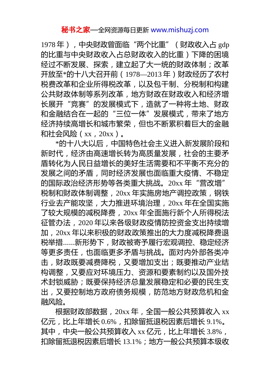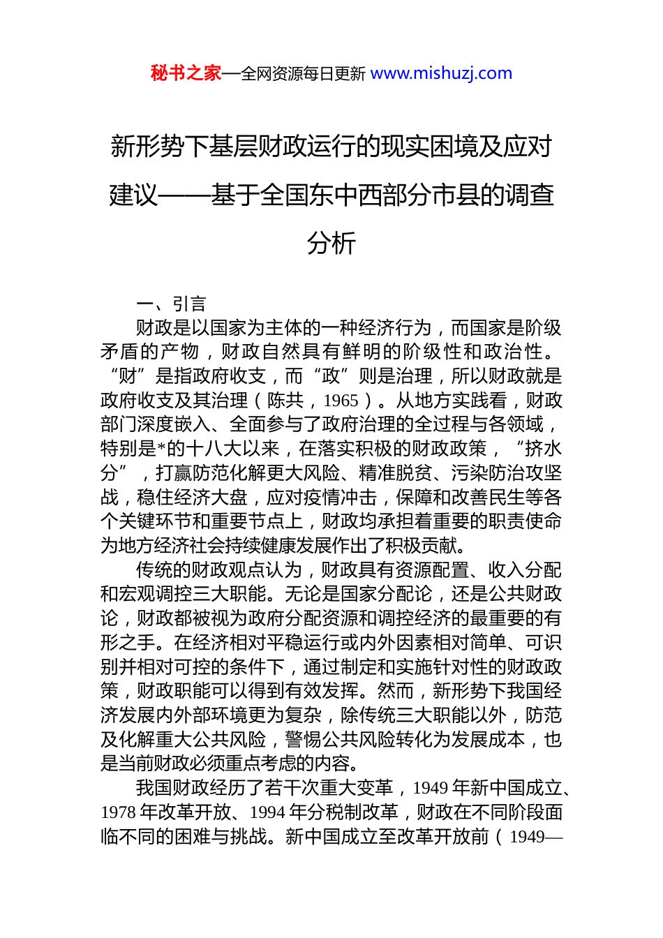 秘书之家—全网资源每日更新 www.mishuzj.com新形势下基层财政运行的现实困境及应对建议——基于全国东中西部分市县的调查分析一、引言财政是以国家为主体的一种经济行为,而国家是阶级矛盾的产物,财政自然具有鲜明的阶级性和政治性。“财”是指政府收支,而“政”则是治理,所以财政就是政府收支及其治理(陈共,1965)。从地方实践看,财政部门深度嵌入、全面参与了政府治理的全过程与各领域,特别是*的十八大以来,在落实积极的财政政策,“挤水分”,打赢防范化解更大风险、精准脱贫、污染防治攻坚战,稳住经济大盘,应对疫情冲击,保障和改善民生等各个关键环节和重要节点上,财政均承担着重要的职责使命为地方经济社会持续健康发展作出了积极贡献。传统的财政观点认为,财政具有资源配置、收入分配和宏观调控三大职能。无论是国家分配论,还是公共财政论,财政都被视为政府分配资源和调控经济的最重要的有形之手。在经济相对平稳运行或内外因素相对简单、可识别并相对可控的条件下,通过制定和实施针对性的财政政策,财政职能可以得到有效发挥。然而,新形势下我国经济发展内外部环境更为复杂,除传统三大职能以外,防范及化解重大公共风险,警惕公共风险转化为发展成本,也是当前财政必须重点考虑的内容。我国财政经历了若干次重大变革,1949 年新中国成立、1978 年改革开放、1994 年分税制改革,财政在不同阶段面临不同的困难与挑战。新中国成立至改革开放前(1949—秘书之家—全网资源每日更新 www.mishuzj.com1978 年),中央财政曾面临“两个比重”(财政收入占 gdp的比重与中央财政收入占总财政收入的比重)下降的困境经过不断发展、探索,建立起了大一统的财政体制;改革开放至*的十八大召开前(1978—2013 年)财政经历了农村税费改革和企业所得税改革,以及包干制、分税制和构建公共财政体制等系列改革,地方财政在财政收入和经济增长展开“竞赛”的发展模式下,造就了一种将土地、财政和金融结合在一起的“三位一体”发展模式,带来了地方经济持续高增长和城市繁荣,但也不断累积着巨大的金融和社会风险(xx,20xx)。*的十八大以后,中国特色社会主义进入新发展阶段和新时代,经济由高速增长转为高质量发展,社会的主要矛盾转化为人民日益增长的美好生活需要和不平衡不充分的发展之间的矛盾,同时经济发展也面临重大疫情、不稳定的国际政治经济形势等各类重大挑战。20xx 年“营改增”税制和财政体制调整,20xx 年实施房地产调控政策,钢铁行业去产能攻坚,大力推进环境治理,20xx 年在全国实施了较大规模的减税降费,20xx 年全面施行新个人所得税法征管办法,2020 年以来各级财政疫情防控资金支出持续增加,20xx 年以来积极的财政政策推出的大力度减税降费退税举措……新形势下,财政被寄予履行宏观调控、稳定经济等更多责任,也面临更多矛盾与挑战。面对内外部各类冲击,财政既要减费降税,又要增加支出;既要推动产业结构调整,又要应对环境压力、资源和要素制约以及国外技术封锁威胁;既要保持经济总量发展稳定和必要的民生支出,又要控制地方政府债务规模,防范地方财政危机和金融风险。根据财政部数据,20xx 年,全国一般公共预算收入 xx亿元,比上年增长 0.6%,扣除留抵退税因素后增长 9.1%。其中,中央一般公共预算收入 xx 亿元,比上年增长 3.8%,扣除留抵退税因素后增长 13.1%;地方一般公共预算本级收秘书之家—全网资源每日更新 www.mishuzj.com入 xx 亿元,比上年下降 2.1%,扣除留抵退税因素后增长5.9%。地方预算收入增速明显低于全国。在显性债务方面,截至 20xx 年底,全国地方政府债务余额已达 xx 万亿元,地方政府债务率接近警戎线;在隐性债务方面,20xx 年城投债券发行规模超过 x 万亿元,其中超八成用于借新还旧,反映出地方政府隐性债务所面临的巨大偿还压力和流动性风险。近三年来疫情所带来的各种成本需要时间消化,企业经营与投资、居民就业与消费仍受疫情冲击明显,加上房地产市场持续调整及经济下行影响,20xx 年,土地财政缺口凸显,拖累政府性基金预算收入,进一步加剧地方财政脆弱性(闫衍,20x...
