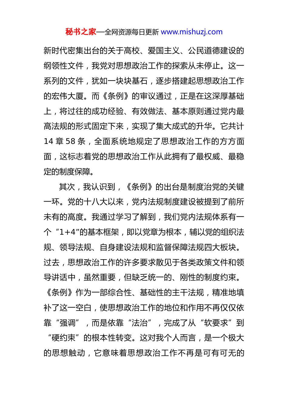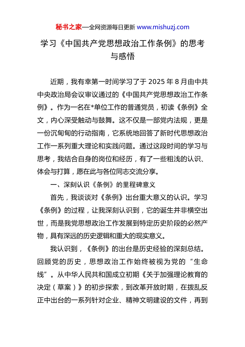 秘书之家—全网资源每日更新 www.mishuzj.com学习《中国共产党思想政治工作条例》的思考与感悟 近期,我有幸第一时间学习了于 2025 年 8 月由中共中央政治局会议审议通过的《中国共产党思想政治工作条例》。作为一名在*单位工作的普通党员,初读《条例》全文,内心深受触动与鼓舞。这不仅是一部党内法规,更是一份沉甸甸的行动指南,它系统地回答了新时代思想政治工作一系列重大理论和实践问题。通过这段时间的学习与思考,我结合自身的岗位和经历,有了一些粗浅的认识、体会与打算,愿在此与各位同志交流分享。一、深刻认识《条例》的里程碑意义首先,我谈谈对《条例》出台重大意义的认识。学习《条例》的过程,让我深刻认识到,它的诞生并非横空出世,而是我党思想政治工作发展到特定历史阶段的必然产物,具有深远的历史逻辑和重大的现实意义。我认识到,《条例》的出台是历史经验的深刻总结。回顾党的历史,思想政治工作始终被视为党的“生命线”。从中华人民共和国成立初期《关于加强理论教育的决定(草案)》的初步探索,到改革开放时期,在拨乱反正中出台的一系列针对企业、精神文明建设的文件,再到秘书之家—全网资源每日更新 www.mishuzj.com新时代密集出台的关于高校、爱国主义、公民道德建设的纲领性文件,我党对思想政治工作的探索从未停止。这一系列的文件,犹如一块块基石,逐步搭建起思想政治工作的宏伟大厦。而《条例》的审议通过,正是在这深厚基础上,将过往的成功经验、有效做法、基本原则通过党内最高法规的形式固定下来,实现了集大成式的升华。它共计14 章 58 条,全面系统地规定了思想政治工作的方方面面,这标志着党的思想政治工作从此拥有了最权威、最稳定的制度保障。其次,我认识到,《条例》的出台是制度治党的关键一环。党的十八大以来,党内法规制度建设被提到了前所未有的高度。我通过学习了解到,我们党内法规体系有一个“1+4”的基本框架,即以党章为根本,辅以党的组织法规、领导法规、自身建设法规和监督保障法规四大板块。过去,思想政治工作的许多要求散见于各类政策文件和领导讲话中,虽然重要,但缺乏统一的、刚性的制度约束。《条例》作为一部综合性、基础性的主干法规,精准地填补了这一空白,使思想政治工作的地位和作用不再仅仅依靠“强调”,而是依靠“法治”,完成了从“软要求”到“硬约束”的根本性转变。这对我个人而言,是一个极大的思想触动,它意味着思想政治工作不再是可有可无的秘书之家—全网资源每日更新 www.mishuzj.com“附加题”,而是必须完成的“必答题”。最后,我认识到,《条例》的出台是应对时代挑战的迫切需要。当前,我们身处一个思想文化交流交融交锋日益频繁、社会思潮纷繁复杂、信息技术深刻改变舆论生态的时代。如何在一个价值多元的社会里凝聚共识、在一个快速变化的时代里坚定信念,是摆在我们面前的重大课题。《条例》明确以习近平新时代中国特色社会主义思想为指导,强调要用其凝心铸魂,这为我们在复杂环境中廓清思想迷雾、站稳政治立场提供了根本遵循。它所构建的党委统一领导、党政齐抓共管、全党全社会共同参与的工作格局,为我们应对挑战提供了强大的组织保障。二、准确把握《条例》的实践要求在反复研读《条例》原文,并参与单位组织的专题学习后,我谈谈自己学习过程中的几点深刻体会。我体会到,学习《条例》不能停留在文字表面,而必须深入其内涵,用心感悟其蕴含的实践智慧和为民情怀。我的第一点体会是,思想政治工作 充满了“人情味”。《条例》开宗明义地指出,思想政治工作归根到底是做人的工作,目标是引导人、感召人、凝聚人、塑造人。这彻底改变了我过去对于思想政治工作可能存在的“刻板印象”。它不是单向的灌输和生硬的说教,而是一秘书之家—全网资源每日更新 www.mishuzj.com种心与心的交流,是建立在尊重人、理解人、关心人之上的双向互动。特别是《条例》提出的六种基本方式中,“关怀服务”让我印象尤为深刻。它明确要求把解决思想问题同解决实际问题结合起来。这让我联想到,在日常工作中,同事遇到困难时一句真诚的问候、一次力所能及的帮助,远比空洞的道理...