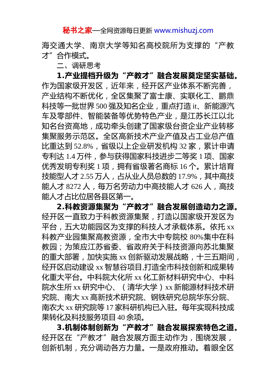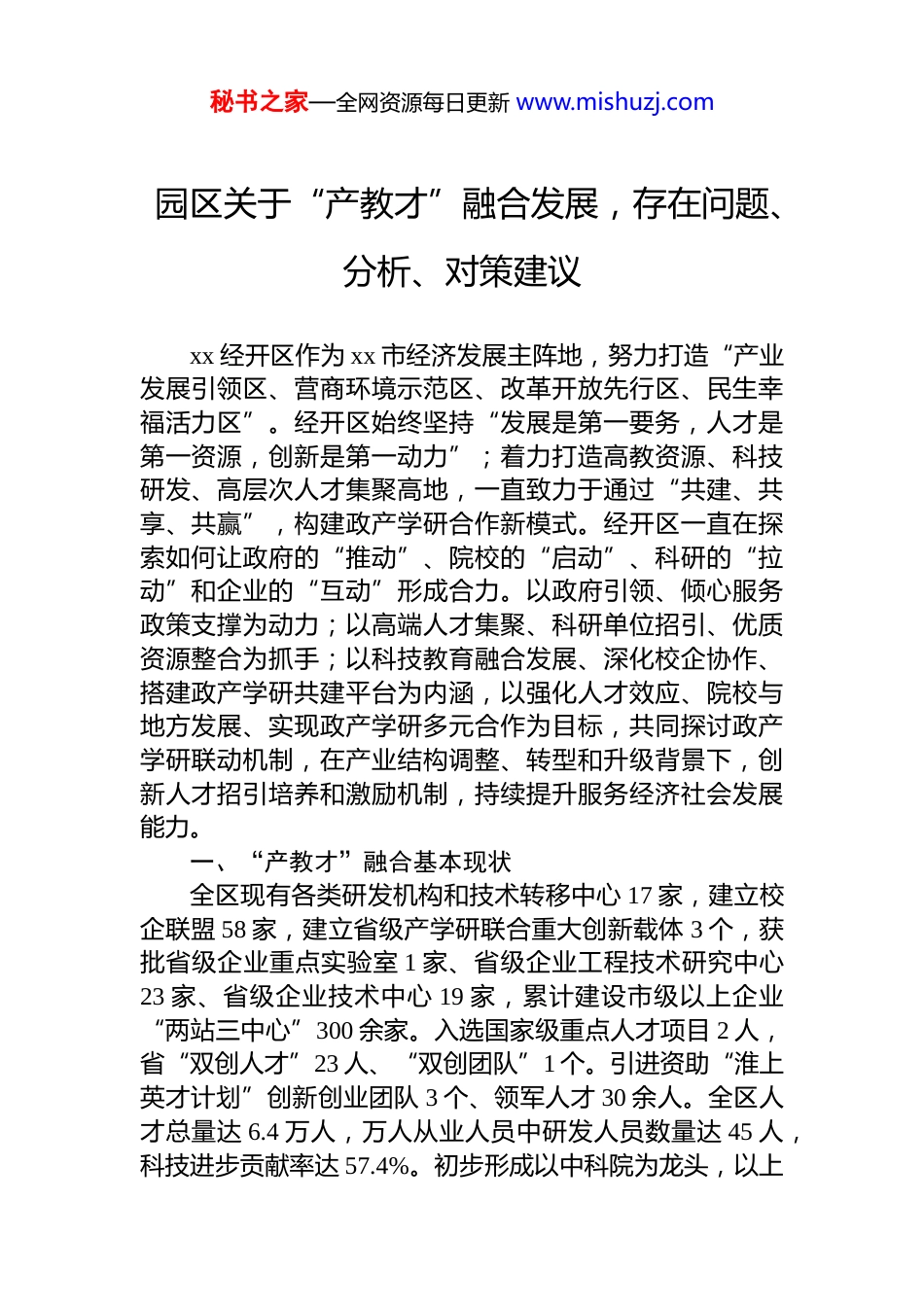 秘书之家—全网资源每日更新 www.mishuzj.com园区关于“产教才”融合发展,存在问题、分析、对策建议xx 经开区作为 xx 市经济发展主阵地,努力打造“产业发展引领区、营商环境示范区、改革开放先行区、民生幸福活力区”。经开区始终坚持“发展是第一要务,人才是第一资源,创新是第一动力”;着力打造高教资源、科技研发、高层次人才集聚高地,一直致力于通过“共建、共享、共赢”,构建政产学研合作新模式。经开区一直在探索如何让政府的“推动”、院校的“启动”、科研的“拉动”和企业的“互动”形成合力。以政府引领、倾心服务政策支撑为动力;以高端人才集聚、科研单位招引、优质资源整合为抓手;以科技教育融合发展、深化校企协作、搭建政产学研共建平台为内涵,以强化人才效应、院校与地方发展、实现政产学研多元合作为目标,共同探讨政产学研联动机制,在产业结构调整、转型和升级背景下,创新人才招引培养和激励机制,持续提升服务经济社会发展能力。一、“产教才”融合基本现状全区现有各类研发机构和技术转移中心 17 家,建立校企联盟 58 家,建立省级产学研联合重大创新载体 3 个,获批省级企业重点实验室 1 家、省级企业工程技术研究中心23 家、省级企业技术中心 19 家,累计建设市级以上企业“两站三中心”300 余家。入选国家级重点人才项目 2 人,省“双创人才”23 人、“双创团队”1 个。引进资助“淮上英才计划”创新创业团队 3 个、领军人才 30 余人。全区人才总量达 6.4 万人,万人从业人员中研发人员数量达 45 人,科技进步贡献率达 57.4%。初步形成以中科院为龙头,以上秘书之家—全网资源每日更新 www.mishuzj.com海交通大学、南京大学等知名高校院所为支撑的“产教才”合作模式。二、调研思考1.产业提档升级为“产教才”融合发展奠定坚实基础。作为国家级开发区,近年来,经开区产业体系不断完善,产业结构不断优化,全区集聚了富士康、实联化工、鹏鼎科技等一批世界 500 强及知名企业,重点打造 it、新能源汽车及零部件、智能装备等优势特色产业,是江苏长江以北知名台资高地,成功牵头创建了国家级台资企业产业转移集聚服务示范区。全区高新技术产业产值及占工业总产值比重达到 52.8%,省级以上企业研发机构 32 家,累计申请专利达 1.4 万件,参与获得国家科技进步二等奖 1 项、国家优秀发明专利奖 1 项,拥有省级著名商标 16 个。累计培育技能型人才 2.55 万人,占从业人员总数的 17.9%,其中高技能人才 8272 人,每万名劳动力中高技能人才 626 人,高技能人才占比位居各县区第一。2.科教资源集聚为“产教才”融合发展创造动力之源。经开区一直致力于科教资源集聚,打造以国家级开发区为平台,五大功能园区为支撑的科技人才承载体系。依托 xx科教产业园集聚高教资源,全市大中专院校 80%集中在科教园;为策应江苏省委、省政府关于科技资源向苏北集聚的重大部署,加快实施 xx 创新驱动发展战略,十三五期间,经开区启动建设 xx 智慧谷项目,打造全市科技创新和成果转化重大平台。中科院大化所 xx 化工新材料研究中心、中科院水生所 xx 研究中心、(清华大学)xx 新能源材料技术研究院、南大 xx 高新技术研究院、钢铁研究总院华东分院、南农大 xx 研究院等 17 家科研机构已入驻。每年实现科技成果转化及科技服务项目 40 余项。3.机制体制创新为“产教才”融合发展探索特色之道。经开区在“产教才”融合发展方面主动作为,围绕发展,创新机制,充分调动各方力量。一是政府推动。着眼全区秘书之家—全网资源每日更新 www.mishuzj.com经济社会发展全局来谋划、推动校企合作,依托科教产业园高教资源,提出构建职业教育校企一体化人才培养模式并出台一系列奖扶政策,从制度、资金、人才等多方面为深化校企合作提供政策保障。全区设立 1000 万人才战略基金,用于企业科技创新、人才引进和用工需求,为深化政产学研合作提供了良好的政策支撑。二是平台带动。加强品牌建设,留创园、软件园均为国家级孵化器,综保区、空港产业园均为特色鲜明的功能园区。留创园被科技部授予国家级孵化器...