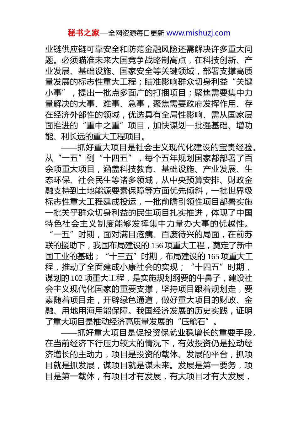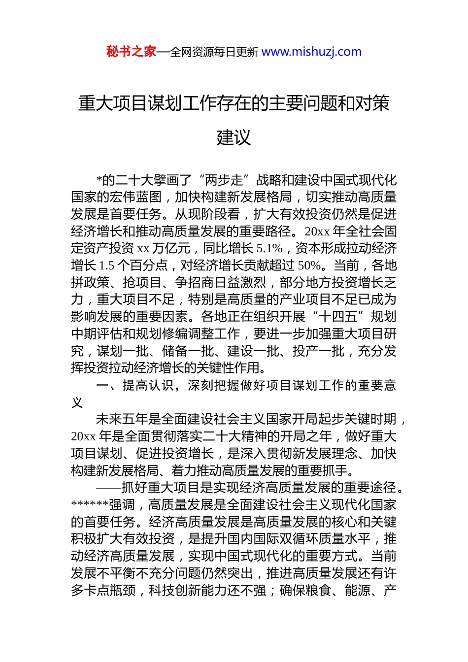 秘书之家—全网资源每日更新 www.mishuzj.com重大项目谋划工作存在的主要问题和对策建议*的二十大擘画了“两步走”战略和建设中国式现代化国家的宏伟蓝图,加快构建新发展格局,切实推动高质量发展是首要任务。从现阶段看,扩大有效投资仍然是促进经济增长和推动高质量发展的重要路径。20xx 年全社会固定资产投资 xx 万亿元,同比增长 5.1%,资本形成拉动经济增长 1.5 个百分点,对经济增长贡献超过 50%。当前,各地拼政策、抢项目、争招商日益激烈,部分地方投资增长乏力,重大项目不足,特别是高质量的产业项目不足已成为影响发展的重要因素。各地正在组织开展“十四五”规划中期评估和规划修编调整工作,要进一步加强重大项目研究,谋划一批、储备一批、建设一批、投产一批,充分发挥投资拉动经济增长的关键性作用。一、提高认识,深刻把握做好项目谋划工作的重要意义未来五年是全面建设社会主义国家开局起步关键时期,20xx 年是全面贯彻落实二十大精神的开局之年,做好重大项目谋划、促进投资增长,是深入贯彻新发展理念、加快构建新发展格局、着力推动高质量发展的重要抓手。——抓好重大项目是实现经济高质量发展的重要途径。******强调,高质量发展是全面建设社会主义现代化国家的首要任务。经济高质量发展是高质量发展的核心和关键积极扩大有效投资,是提升国内国际双循环质量水平,推动经济高质量发展,实现中国式现代化的重要方式。当前发展不平衡不充分问题仍然突出,推进高质量发展还有许多卡点瓶颈,科技创新能力还不强;确保粮食、能源、产秘书之家—全网资源每日更新 www.mishuzj.com业链供应链可靠安全和防范金融风险还需解决许多重大问题。必须瞄准未来大国竞争战略制高点,在科技创新、产业发展、基础设施、国家安全等关键领域,部署支撑高质量发展的标志性重大工程;瞄准影响群众切身利益“关键小事”,提出一批点多面广的打捆项目;聚焦需要集中力量解决的大事、难事、急事,聚焦需要政府发挥作用、存在经济外部性的领域,优选具有全局性影响、需从国家层面推进的“重中之重”项目,加快谋划一批强基础、增功能、利长远的重大工程项目。——抓好重大项目是社会主义现代化建设的宝贵经验。从“一五”到“十四五”,每个五年规划国家都部署了百余项重大项目,涵盖科技教育、基础设施、产业发展、生态环保、社会民生等诸多领域,从中央预算安排、财政金融支持到土地能源要素保障等方面优先倾斜,一批世界级标志性重大工程建成投运,一批前瞻引领性项目部署实施一批关乎群众切身利益的民生项目扎实推进,体现了中国特色社会主义制度能够发挥集中力量办大事的优越性。“一五”时期,面对满目疮痍、百废待兴的局面,在前苏联的援助下,我国布局建设的 156 项重大工程,奠定了新中国工业的基础;“十三五”时期,布局建设的 165 项重大工程,推动了全面建成小康社会的实现;“十四五”时期,谋划的 102 项重大工程,是实施规划纲要的牛鼻子,建设社会主义现代化国家的重要支撑,坚持项目跟着规划走,要素随着项目走,开辟绿色通道,做好重大项目的财政、金融、用地用海用能保障。我国经济发展的历史实践,证明了重大项目是推动经济高质量发展的“压舱石”。——抓好重大项目是促投资保就业稳增长的重要手段。在当前经济下行压力较大的情况下,有效投资仍是拉动经济增长的主动力,项目是投资的载体、发展的平台,抓项目就是抓发展,谋项目就是谋未来。发展是第一要务,项目是第一载体,有项目才有发展,有大项目才有大发展,秘书之家—全网资源每日更新 www.mishuzj.com充分发挥重大项目对经济社会发展的支撑作用和对产业转型升级的引领作用,促进经济社会持续平稳健康发展。20xx 年 4 月,国家发改委主任***同志在《求是》杂志发表署名文章,强调“没有项目,没有投资,就没有未来”。为拉动投资,今年中央将安排预算内投资 xx 亿元,比去年增加 xx 亿元。《20xx 年政府工作报告》指出,政府投资和政策激励要有效带动全社会投资,全年拟安排地方政府专项债券 3.8 万亿元,加快实施“十四五”重大工程,实施城市更新行动,促进区域优势互补...