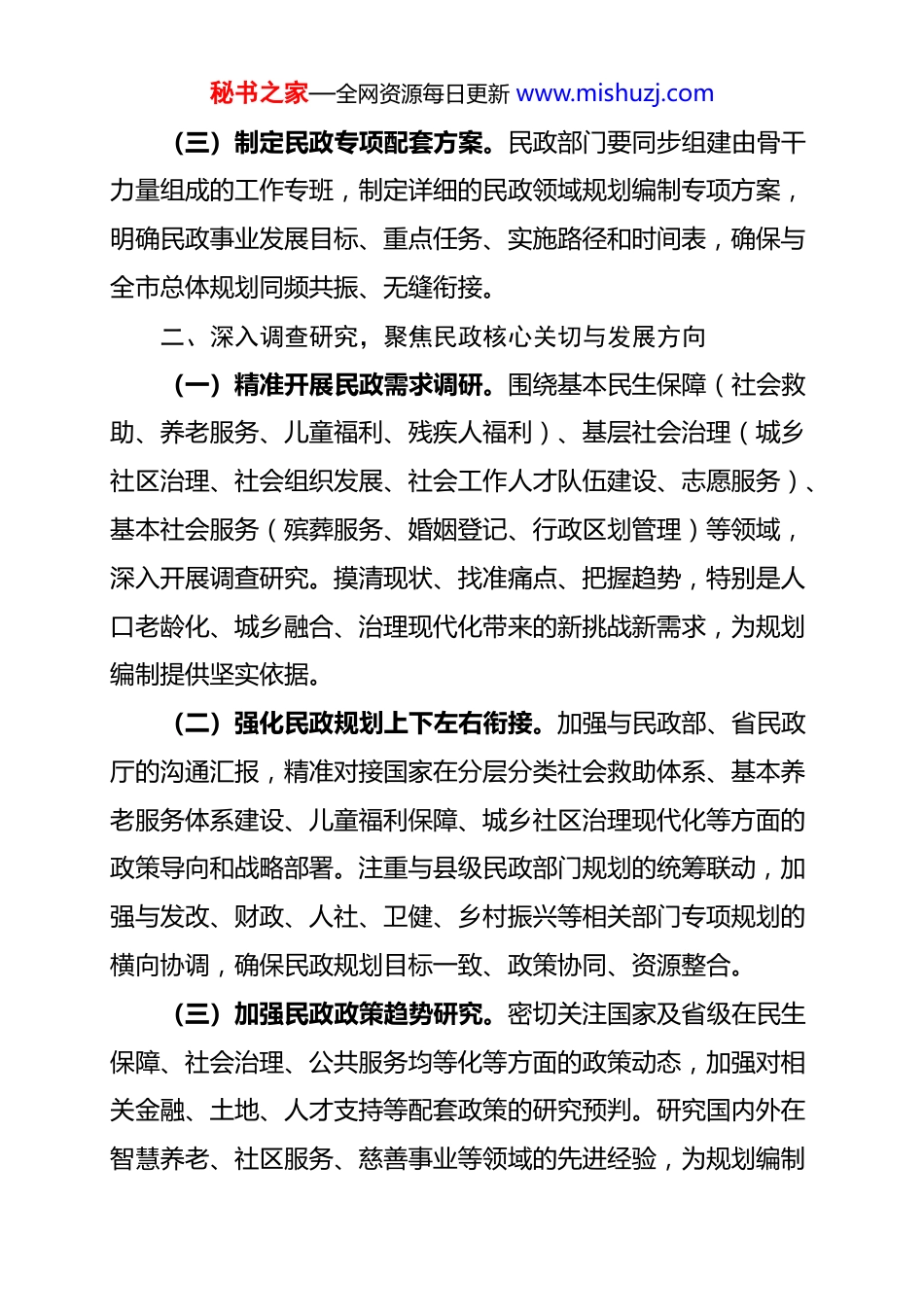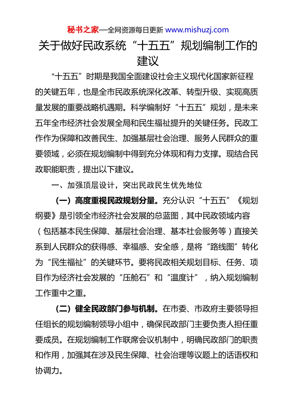 秘书之家—全网资源每日更新 www.mishuzj.com关于做好民政系统“十五五”规划编制工作的建议“十五五”时期是我国全面建设社会主义现代化国家新征程的关键五年,也是全市民政系统深化改革、转型升级、实现高质量发展的重要战略机遇期。科学编制好“十五五”规划,是未来五年全市经济社会发展全局和民生福祉提升的关键任务。民政工作作为保障和改善民生、加强基层社会治理、服务人民群众的重要领域,必须在规划编制中得到充分体现和有力支撑。现结合民政职能职责,提出以下建议。一、加强顶层设计,突出民政民生优先地位(一)高度重视民政规划分量。充分认识“十五五”《规划纲要》是引领全市经济社会发展的总蓝图,其中民政领域内容(包括基本民生保障、基层社会治理、基本社会服务等)直接关系到人民群众的获得感、幸福感、安全感,是将“路线图”转化为“民生福祉”的关键环节。要将民政相关规划目标、任务、项目作为经济社会发展的“压舱石”和“温度计”,纳入规划编制工作重中之重。(二)健全民政部门参与机制。在市委、市政府主要领导担任组长的规划编制领导小组中,确保民政部门主要负责人担任重要成员。在规划编制工作联席会议机制中,明确民政部门的职责和作用,加强其在涉及民生保障、社会治理等议题上的话语权和协调力。秘书之家—全网资源每日更新 www.mishuzj.com(三)制定民政专项配套方案。民政部门要同步组建由骨干力量组成的工作专班,制定详细的民政领域规划编制专项方案,明确民政事业发展目标、重点任务、实施路径和时间表,确保与全市总体规划同频共振、无缝衔接。二、深入调查研究,聚焦民政核心关切与发展方向(一)精准开展民政需求调研。围绕基本民生保障(社会救助、养老服务、儿童福利、残疾人福利)、基层社会治理(城乡社区治理、社会组织发展、社会工作人才队伍建设、志愿服务)、基本社会服务(殡葬服务、婚姻登记、行政区划管理)等领域,深入开展调查研究。摸清现状、找准痛点、把握趋势,特别是人口老龄化、城乡融合、治理现代化带来的新挑战新需求,为规划编制提供坚实依据。(二)强化民政规划上下左右衔接。加强与民政部、省民政厅的沟通汇报,精准对接国家在分层分类社会救助体系、基本养老服务体系建设、儿童福利保障、城乡社区治理现代化等方面的政策导向和战略部署。注重与县级民政部门规划的统筹联动,加强与发改、财政、人社、卫健、乡村振兴等相关部门专项规划的横向协调,确保民政规划目标一致、政策协同、资源整合。(三)加强民政政策趋势研究。密切关注国家及省级在民生保障、社会治理、公共服务均等化等方面的政策动态,加强对相关金融、土地、人才支持等配套政策的研究预判。研究国内外在智慧养老、社区服务、慈善事业等领域的先进经验,为规划编制秘书之家—全网资源每日更新 www.mishuzj.com提供前瞻性、创新性思路。(四)明确民政事业发展主线。立足市情,深入分析民政事业发展面临的机遇挑战与短板弱项。明确未来五年民政工作的主攻方向。如健全分层分类的社会救助体系、构建优质均衡的基本养老服务体系、深化基层治理体系和治理能力现代化、提升专项社会事务管理服务水平、引导支持社会组织健康有序发展、壮大“五社联动”力量等,并将其全面融入全市“十五五”发展蓝图。三、做实课题研究,夯实民政规划基础支撑(一)聚焦民政关键领域研究选题。围绕民政工作的重点、难点、前瞻性问题,提出针对性研究课题。例如。应对人口深度老龄化的养老服务高质量发展路径研究;共同富裕目标下精准识别与高效救助机制研究;城乡社区减负增效与治理能力提升研究;社会工作与志愿服务深度融入基层治理模式研究;“智慧民政”建设应用场景与效能提升研究;慈善资源在第三次分配中的作用发挥机制研究等。(二)科学确定民政专项课题。在市级规划前期研究选题征集和评审中,优先保障民政领域的战略性、基础性课题。民政部门也可独立或联合相关部门、高校、研究机构设立专项课题。细化课题任务,明确主体责任单位(民政部门牵头或参与)。(三)整合汇聚民政研究力量。保障民政课题研究经费,组织民政系统内业务骨干与研究力量投入...