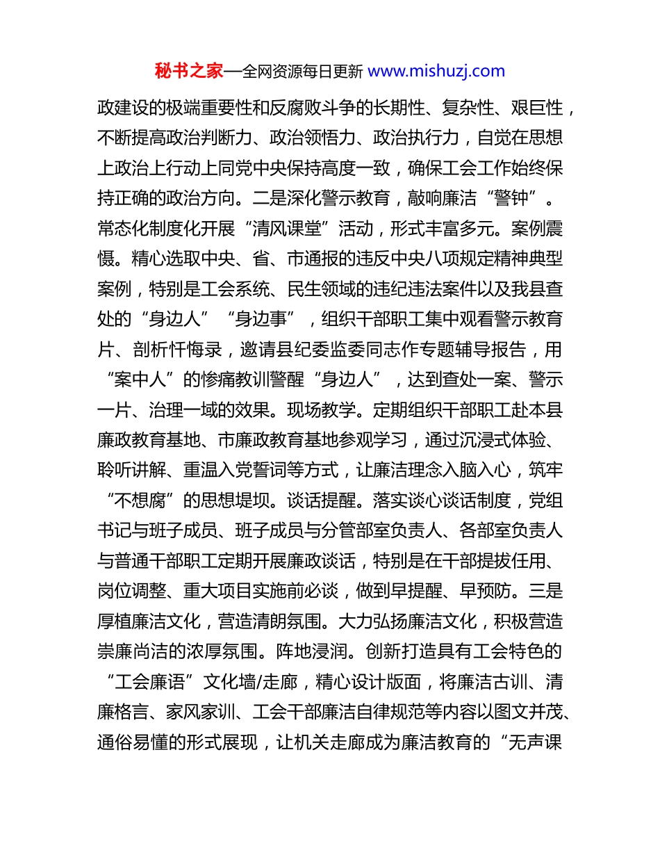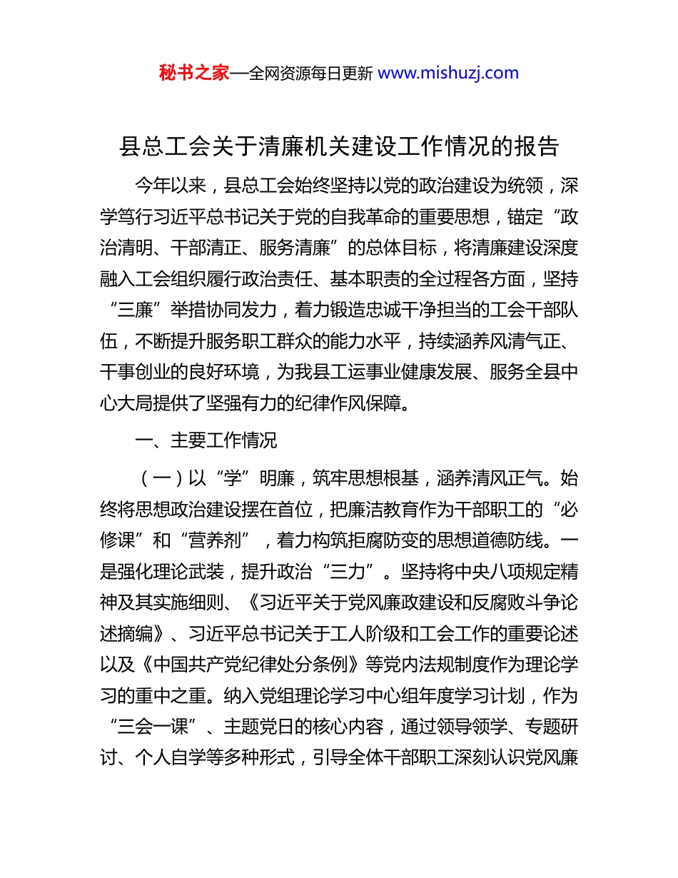 秘书之家—全网资源每日更新 www.mishuzj.com县总工会关于清廉机关建设工作情况的报告今年以来,县总工会始终坚持以党的政治建设为统领,深学笃行习近平总书记关于党的自我革命的重要思想,锚定“政治清明、干部清正、服务清廉”的总体目标,将清廉建设深度融入工会组织履行政治责任、基本职责的全过程各方面,坚持“三廉”举措协同发力,着力锻造忠诚干净担当的工会干部队伍,不断提升服务职工群众的能力水平,持续涵养风清气正、干事创业的良好环境,为我县工运事业健康发展、服务全县中心大局提供了坚强有力的纪律作风保障。一、主要工作情况(一)以“学”明廉,筑牢思想根基,涵养清风正气。始终将思想政治建设摆在首位,把廉洁教育作为干部职工的“必修课”和“营养剂”,着力构筑拒腐防变的思想道德防线。一是强化理论武装,提升政治“三力”。坚持将中央八项规定精神及其实施细则、《习近平关于党风廉政建设和反腐败斗争论述摘编》、习近平总书记关于工人阶级和工会工作的重要论述以及《中国共产党纪律处分条例》等党内法规制度作为理论学习的重中之重。纳入党组理论学习中心组年度学习计划,作为“三会一课”、主题党日的核心内容,通过领导领学、专题研讨、个人自学等多种形式,引导全体干部职工深刻认识党风廉秘书之家—全网资源每日更新 www.mishuzj.com政建设的极端重要性和反腐败斗争的长期性、复杂性、艰巨性,不断提高政治判断力、政治领悟力、政治执行力,自觉在思想上政治上行动上同党中央保持高度一致,确保工会工作始终保持正确的政治方向。二是深化警示教育,敲响廉洁“警钟”。常态化制度化开展“清风课堂”活动,形式丰富多元。案例震慑。精心选取中央、省、市通报的违反中央八项规定精神典型案例,特别是工会系统、民生领域的违纪违法案件以及我县查处的“身边人”“身边事”,组织干部职工集中观看警示教育片、剖析忏悔录,邀请县纪委监委同志作专题辅导报告,用“案中人”的惨痛教训警醒“身边人”,达到查处一案、警示一片、治理一域的效果。现场教学。定期组织干部职工赴本县廉政教育基地、市廉政教育基地参观学习,通过沉浸式体验、聆听讲解、重温入党誓词等方式,让廉洁理念入脑入心,筑牢“不想腐”的思想堤坝。谈话提醒。落实谈心谈话制度,党组书记与班子成员、班子成员与分管部室负责人、各部室负责人与普通干部职工定期开展廉政谈话,特别是在干部提拔任用、岗位调整、重大项目实施前必谈,做到早提醒、早预防。三是厚植廉洁文化,营造清朗氛围。大力弘扬廉洁文化,积极营造崇廉尚洁的浓厚氛围。阵地浸润。创新打造具有工会特色的“工会廉语”文化墙/走廊,精心设计版面,将廉洁古训、清廉格言、家风家训、工会干部廉洁自律规范等内容以图文并茂、通俗易懂的形式展现,让机关走廊成为廉洁教育的“无声课秘书之家—全网资源每日更新 www.mishuzj.com堂”。活动熏陶。结合重要节日和工会活动,组织开展廉洁主题征文、书画摄影展、知识竞赛、家风故事分享会等,如成功举办“清风伴我行·廉洁驻我心”主题征文活动,征集优秀作品*篇。日常渗透。利用工会微信公众号、内部 OA 系统、工作微信群等平台,定期推送“清风微语”“廉洁提醒卡”“党纪法规小课堂”等内容,做到廉洁提醒时时在线、处处可见。通过春风化雨、润物无声的文化滋养,引导干部职工常怀律己之心,常思贪欲之害,自觉做到知敬畏、存戒惧、守底线,将廉洁内化为政治本色和行为习惯。(二)以“制”护廉,扎紧制度篱笆,规范权力运行。坚持用制度管权、管事、管人,紧盯工会权力运行的廉政风险点,不断健全完善监督制约机制,确保权力在阳光下运行。一是精准排查风险,筑牢防控“堤坝”。聚焦工会经费收管用、困难职工帮扶资金分配、劳模评选表彰、各类奖项评定、工会资产管理运营、重大采购项目招标、下属企事业单位监管等关键领域、敏感环节、重要岗位,组织各部室全面深入开展廉政风险点再排查、再梳理。通过自查自纠、集中研讨、专家评审等方式,共精准识别廉政风险点 50 条。针对排查出的风险点,逐项制定防控措施,明确责任主体,形成《县总工会廉政风险点及防控措施清...