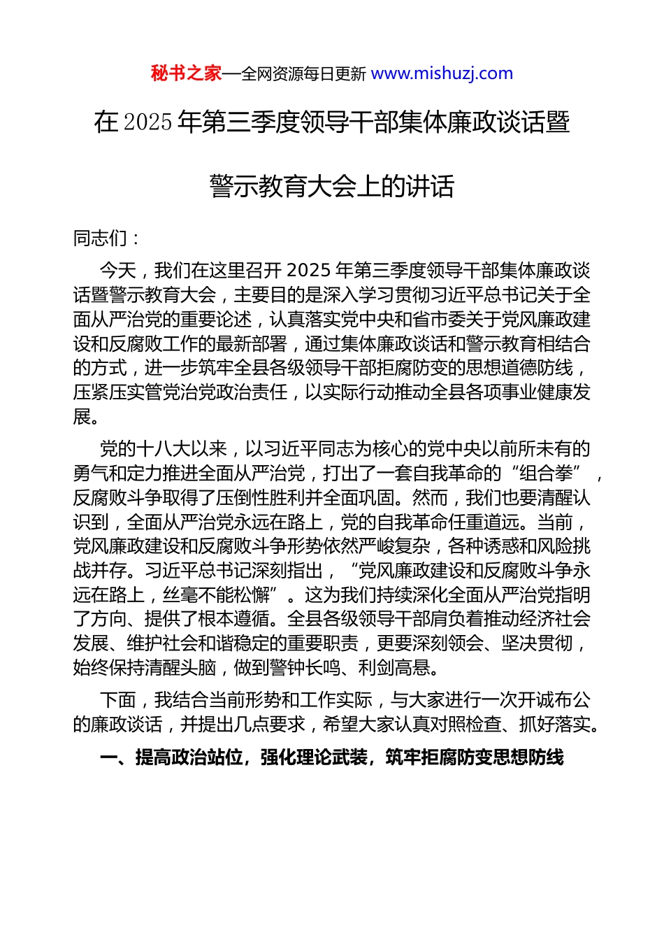 秘书之家—全网资源每日更新 www.mishuzj.com在 2025 年第三季度领导干部集体廉政谈话暨警示教育大会上的讲话同志们:今天,我们在这里召开 2025 年第三季度领导干部集体廉政谈话暨警示教育大会,主要目的是深入学习贯彻习近平总书记关于全面从严治党的重要论述,认真落实党中央和省市委关于党风廉政建设和反腐败工作的最新部署,通过集体廉政谈话和警示教育相结合的方式,进一步筑牢全县各级领导干部拒腐防变的思想道德防线,压紧压实管党治党政治责任,以实际行动推动全县各项事业健康发展。党的十八大以来,以习近平同志为核心的党中央以前所未有的勇气和定力推进全面从严治党,打出了一套自我革命的“组合拳”,反腐败斗争取得了压倒性胜利并全面巩固。然而,我们也要清醒认识到,全面从严治党永远在路上,党的自我革命任重道远。当前,党风廉政建设和反腐败斗争形势依然严峻复杂,各种诱惑和风险挑战并存。习近平总书记深刻指出,“党风廉政建设和反腐败斗争永远在路上,丝毫不能松懈”。这为我们持续深化全面从严治党指明了方向、提供了根本遵循。全县各级领导干部肩负着推动经济社会发展、维护社会和谐稳定的重要职责,更要深刻领会、坚决贯彻,始终保持清醒头脑,做到警钟长鸣、利剑高悬。下面,我结合当前形势和工作实际,与大家进行一次开诚布公的廉政谈话,并提出几点要求,希望大家认真对照检查、抓好落实。一、提高政治站位,强化理论武装,筑牢拒腐防变思想防线秘书之家—全网资源每日更新 www.mishuzj.com思想是行动的先导。坚定理想信念是共产党人安身立命的根本,也是拒腐防变的思想基础。一些干部之所以走上违纪违法道路,根子就在于理想信念的动摇和宗旨意识的淡薄。一是坚定不移强化理论武装。习近平新时代中国特色社会主义思想是当代中国马克思主义、二十一世纪马克思主义,是全党全国人民为实现中华民族伟大复兴而奋斗的行动指南。全县各级领导干部要始终把学习贯彻习近平新时代中国特色社会主义思想作为首要政治任务,坚持读原著、学原文、悟原理,做到真学真懂真信真用。要深入学习习近平总书记关于党的建设、全面从严治党、廉洁文化建设等系列重要论述,深刻领会其核心要义、精神实质、丰富内涵和实践要求,不断提高政治判断力、政治领悟力、政治执行力。要结合实际工作,将理论学习与业务学习相结合,把学习成果转化为坚定理想信念、锤炼党性修养的强大动力,转化为谋划发展、服务群众的实际成效。二是坚定不移站稳政治立场。对党忠诚是共产党人最根本的政治品质。全县各级领导干部要始终把对党忠诚作为第一位的政治要求,深刻领悟“两个确立”的决定性意义,增强“四个意识”、坚定“四个自信”、做到“两个维护”。要严守政治纪律和政治规矩,始终在思想上政治上行动上同以习近平同志为核心的党中央保持高度一致。要坚决反对各种错误思潮和言行,不折不扣地贯彻落实党中央和省市县委的各项决策部署,确保政令畅通、令行禁止。在重大原则问题面前,要头脑清醒、旗帜鲜明,敢于斗争、善于斗争,绝不能当“老好人”、做“两面人”。三是坚定不移锤炼党性修养。党性修养是共产党人的“心学”。要时刻牢记自己是一名共产党员,是党和人民的干部,自觉用党章党规党纪对照检查自己的言行举止。要经常性地开展党性分析,对照党章找差距,对照先进典型找不足,对照反面案例受警醒。要正确处理公与私、义与利、苦与乐、得与失的关系,牢固树立正确的权力观、政绩观、事业观,始终保持共产党人的蓬勃朝气、昂扬锐秘书之家—全网资源每日更新 www.mishuzj.com气、浩然正气。要自觉加强道德修养,弘扬中华民族传统美德,培育积极健康的家风,以高尚的道德情操来涵养清廉之风。二、严守纪律规矩,知敬畏守底线,做到清正廉洁纪律是带电的“高压线”,规矩是做人的“紧箍咒”。领导干部能否廉洁自律,直接关系到党和政府在人民群众心中的形象是否良好,关系到一方政治生态的清明。一是做到警钟长鸣,以案为鉴。今天我们召开警示教育大会,就是要通过对反面典型案例的剖析,让大家受到教育、得到警醒。近年来,在全面从严治党的高压态势下,仍有个别党员干部心...