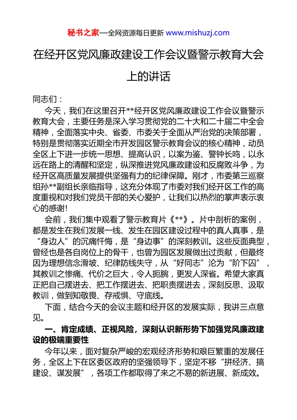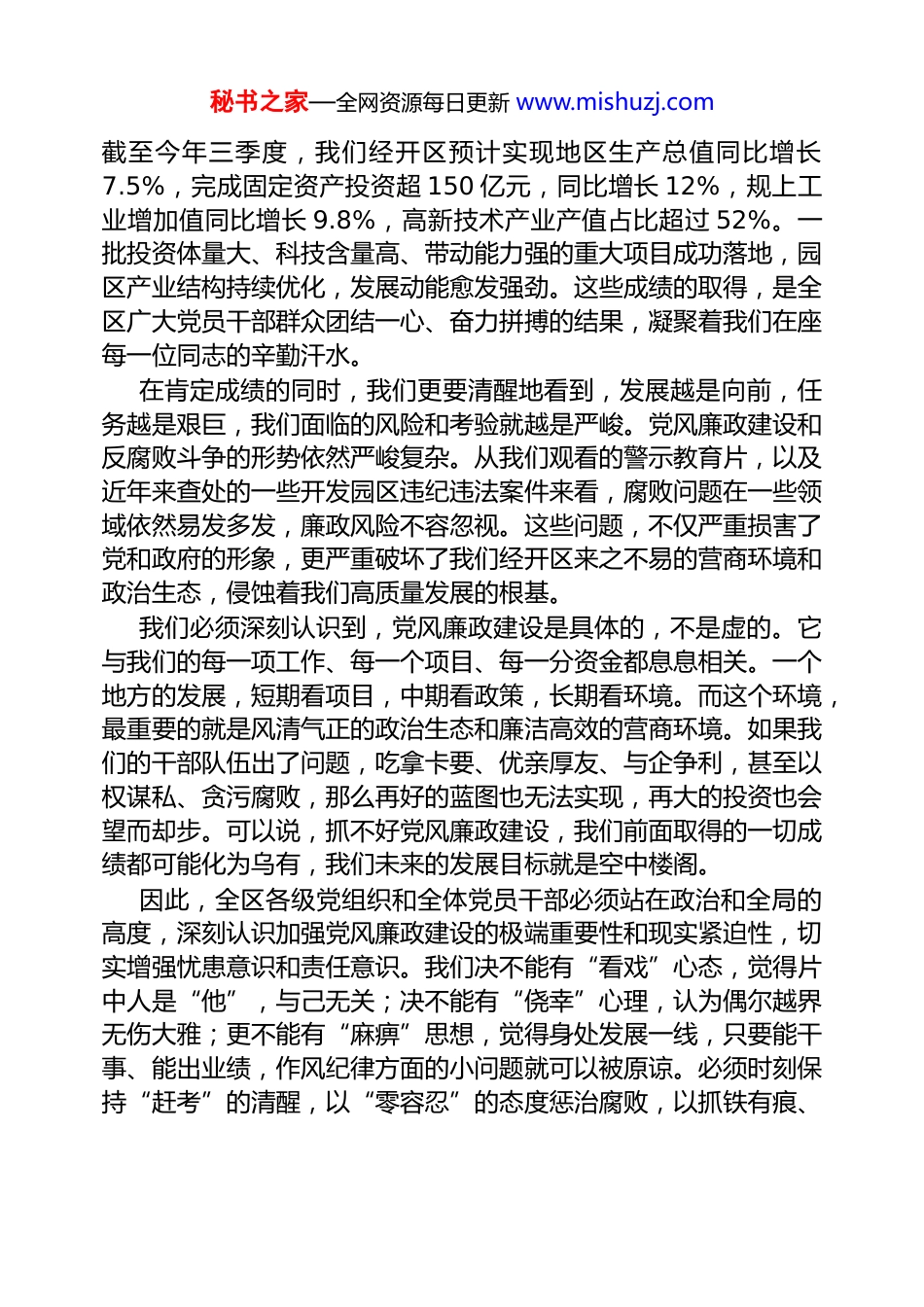 秘书之家—全网资源每日更新 www.mishuzj.com在经开区党风廉政建设工作会议暨警示教育大会上的讲话同志们:今天,我们在这里召开**经开区党风廉政建设工作会议暨警示教育大会,主要任务是深入学习贯彻党的二十大和二十届二中全会精神,全面落实中央、省委、市委关于全面从严治党的决策部署,特别是贯彻落实近期全市开发园区警示教育会议的核心精神,动员全区上下进一步统一思想、提高认识,以案为鉴、警钟长鸣,以永远在路上的清醒和坚定,纵深推进党风廉政建设和反腐败斗争,为经开区高质量发展提供坚强有力的纪律保障。刚才,市委第三巡察组孙**副组长亲临指导,这充分体现了市委对我们经开区工作的高度重视和对我们党员干部的关心爱护,让我们以热烈的掌声表示衷心的感谢!会前,我们集中观看了警示教育片《**》。片中剖析的案例,都是发生在我们发展一线、发生在园区建设过程中的真人真事,是“身边人”的沉痛忏悔,是“身边事”的深刻教训。这些反面典型,曾经也是各自岗位上的骨干,也曾为园区发展做出过贡献,但最终因为理想信念滑坡、纪律防线失守,从“好同志”沦为“阶下囚”,其教训之惨痛、代价之巨大,令人扼腕,更发人深省。希望大家真正把自己摆进去、把工作摆进去、把职责摆进去,深刻反思、汲取教训,做到知敬畏、存戒惧、守底线。下面,结合今天的会议主题和经开区的发展实际,我讲三点意见。一、肯定成绩、正视风险,深刻认识新形势下加强党风廉政建设的极端重要性今年以来,面对复杂严峻的宏观经济形势和艰巨繁重的发展任务,全区上下在区委区政府的坚强领导下,坚定不移“拼经济、搞建设、谋发展”,各项工作都取得了来之不易的新进展、新成效。秘书之家—全网资源每日更新 www.mishuzj.com截至今年三季度,我们经开区预计实现地区生产总值同比增长7.5%,完成固定资产投资超 150 亿元,同比增长 12%,规上工业增加值同比增长 9.8%,高新技术产业产值占比超过 52%。一批投资体量大、科技含量高、带动能力强的重大项目成功落地,园区产业结构持续优化,发展动能愈发强劲。这些成绩的取得,是全区广大党员干部群众团结一心、奋力拼搏的结果,凝聚着我们在座每一位同志的辛勤汗水。在肯定成绩的同时,我们更要清醒地看到,发展越是向前,任务越是艰巨,我们面临的风险和考验就越是严峻。党风廉政建设和反腐败斗争的形势依然严峻复杂。从我们观看的警示教育片,以及近年来查处的一些开发园区违纪违法案件来看,腐败问题在一些领域依然易发多发,廉政风险不容忽视。这些问题,不仅严重损害了党和政府的形象,更严重破坏了我们经开区来之不易的营商环境和政治生态,侵蚀着我们高质量发展的根基。我们必须深刻认识到,党风廉政建设是具体的,不是虚的。它与我们的每一项工作、每一个项目、每一分资金都息息相关。一个地方的发展,短期看项目,中期看政策,长期看环境。而这个环境,最重要的就是风清气正的政治生态和廉洁高效的营商环境。如果我们的干部队伍出了问题,吃拿卡要、优亲厚友、与企争利,甚至以权谋私、贪污腐败,那么再好的蓝图也无法实现,再大的投资也会望而却步。可以说,抓不好党风廉政建设,我们前面取得的一切成绩都可能化为乌有,我们未来的发展目标就是空中楼阁。因此,全区各级党组织和全体党员干部必须站在政治和全局的高度,深刻认识加强党风廉政建设的极端重要性和现实紧迫性,切实增强忧患意识和责任意识。我们决不能有“看戏”心态,觉得片中人是“他”,与己无关;决不能有“侥幸”心理,认为偶尔越界无伤大雅;更不能有“麻痹”思想,觉得身处发展一线,只要能干事、能出业绩,作风纪律方面的小问题就可以被原谅。必须时刻保持“赶考”的清醒,以“零容忍”的态度惩治腐败,以抓铁有痕、秘书之家—全网资源每日更新 www.mishuzj.com踏石留印的决心狠抓作风建设,为经开区这艘航船行稳致远保驾护航。二、以案为鉴、深挖根源,精准把握开发园区廉政风险的关键点和要害处警示教育片中的案例,就像一面镜子,照出了当前开发园区在快速发展过程中容易滋生腐败的几个关键领域和共性问题。我们必须坚持问题导向,对照反思,举一反三,深...