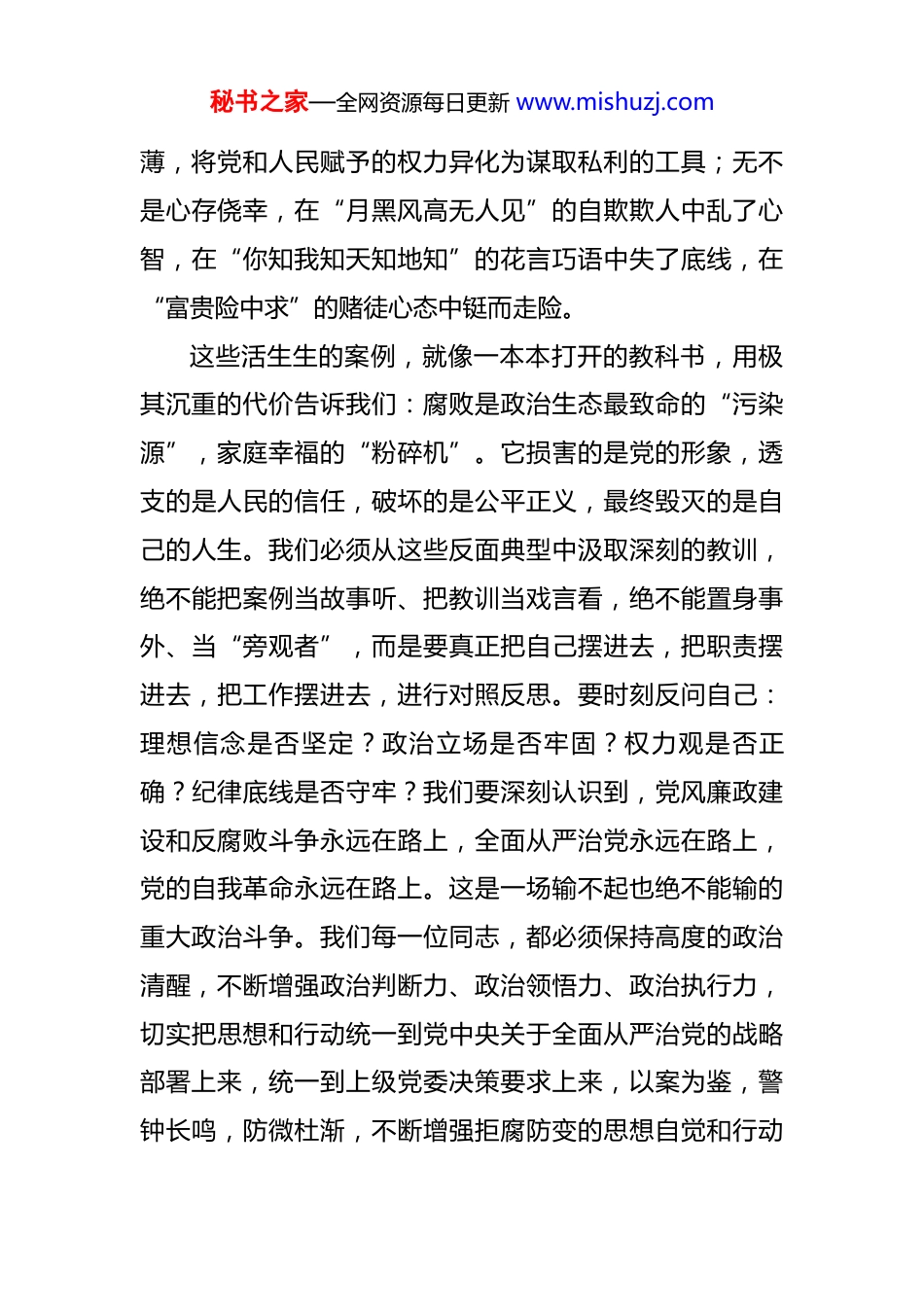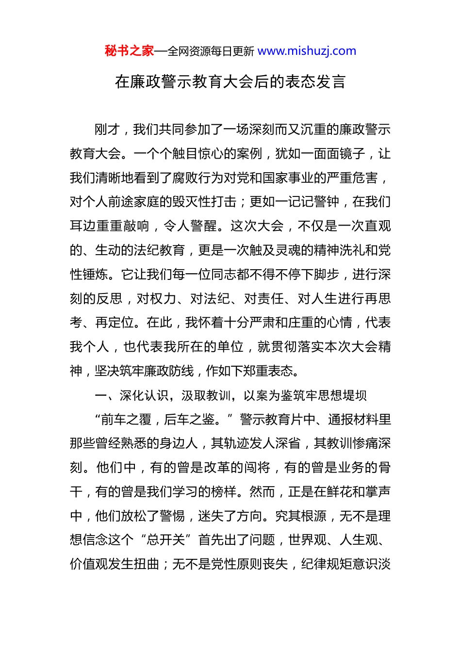 秘书之家—全网资源每日更新 www.mishuzj.com在廉政警示教育大会后的表态发言 刚才,我们共同参加了一场深刻而又沉重的廉政警示教育大会。一个个触目惊心的案例,犹如一面面镜子,让我们清晰地看到了腐败行为对党和国家事业的严重危害,对个人前途家庭的毁灭性打击;更如一记记警钟,在我们耳边重重敲响,令人警醒。这次大会,不仅是一次直观的、生动的法纪教育,更是一次触及灵魂的精神洗礼和党性锤炼。它让我们每一位同志都不得不停下脚步,进行深刻的反思,对权力、对法纪、对责任、对人生进行再思考、再定位。在此,我怀着十分严肃和庄重的心情,代表我个人,也代表我所在的单位,就贯彻落实本次大会精神,坚决筑牢廉政防线,作如下郑重表态。一、深化认识,汲取教训,以案为鉴筑牢思想堤坝“前车之覆,后车之鉴。”警示教育片中、通报材料里那些曾经熟悉的身边人,其轨迹发人深省,其教训惨痛深刻。他们中,有的曾是改革的闯将,有的曾是业务的骨干,有的曾是我们学习的榜样。然而,正是在鲜花和掌声中,他们放松了警惕,迷失了方向。究其根源,无不是理想信念这个“总开关”首先出了问题,世界观、人生观、价值观发生扭曲;无不是党性原则丧失,纪律规矩意识淡秘书之家—全网资源每日更新 www.mishuzj.com薄,将党和人民赋予的权力异化为谋取私利的工具;无不是心存侥幸,在“月黑风高无人见”的自欺欺人中乱了心智,在“你知我知天知地知”的花言巧语中失了底线,在“富贵险中求”的赌徒心态中铤而走险。这些活生生的案例,就像一本本打开的教科书,用极其沉重的代价告诉我们:腐败是政治生态最致命的“污染源”,家庭幸福的“粉碎机”。它损害的是党的形象,透支的是人民的信任,破坏的是公平正义,最终毁灭的是自己的人生。我们必须从这些反面典型中汲取深刻的教训,绝不能把案例当故事听、把教训当戏言看,绝不能置身事外、当“旁观者”,而是要真正把自己摆进去,把职责摆进去,把工作摆进去,进行对照反思。要时刻反问自己:理想信念是否坚定?政治立场是否牢固?权力观是否正确?纪律底线是否守牢?我们要深刻认识到,党风廉政建设和反腐败斗争永远在路上,全面从严治党永远在路上,党的自我革命永远在路上。这是一场输不起也绝不能输的重大政治斗争。我们每一位同志,都必须保持高度的政治清醒,不断增强政治判断力、政治领悟力、政治执行力,切实把思想和行动统一到党中央关于全面从严治党的战略部署上来,统一到上级党委决策要求上来,以案为鉴,警钟长鸣,防微杜渐,不断增强拒腐防变的思想自觉和行动秘书之家—全网资源每日更新 www.mishuzj.com自觉。二、严守纪律,恪守规矩,永葆清正廉洁政治本色“欲知平直,则必准绳;欲知方圆,则必规矩。”党的纪律和规矩,是全体党员必须遵守的行为准则,是带电的“高压线”,是不可触碰的“底线”。警示教育案例中那些以身试纪、以身试法者,无一不是从破坏规矩、违反纪律开始的。他们把党的政治纪律、组织纪律、廉洁纪律、群众纪律、工作纪律、生活纪律当成了“稻草人”,视同儿戏,最终小节失守,大节不保。我们必须深刻认识到,遵守党的纪律是无条件的,执行党的规矩是不能打折扣的。作为党的干部,作为国家公职人员,我们必须把纪律和规矩挺在前面,内化于心、外化于行。要始终把严守政治纪律和政治规矩摆在首位,深刻领悟“两个确立”的决定性意义,增强“四个意识”、坚定“四个自信”、做到“两个维护”,在思想上政治上行动上始终同党中央保持高度一致,决不允许上有政策、下有对策,决不允许有令不行、有禁不止。要严格执行组织纪律,自觉接受组织安排和纪律约束,严格执行请示报告制度,相信组织、依靠组织、服从组织。要模范遵守廉洁纪律,时刻绷紧廉洁自律这根弦,坚决落实中央八项规定及其实施细则精神,持之以恒纠正“四风”,力戒形式秘书之家—全网资源每日更新 www.mishuzj.com主义、官僚主义。要牢固树立正确的权力观、地位观、利益观,坚持公正用权、依法用权、为民用权、廉洁用权,任何时候都不搞特权、不以权谋私。要自觉净化自己的社交圈、生活圈、朋友圈,坚持交往有原则、有界限、有规矩,...