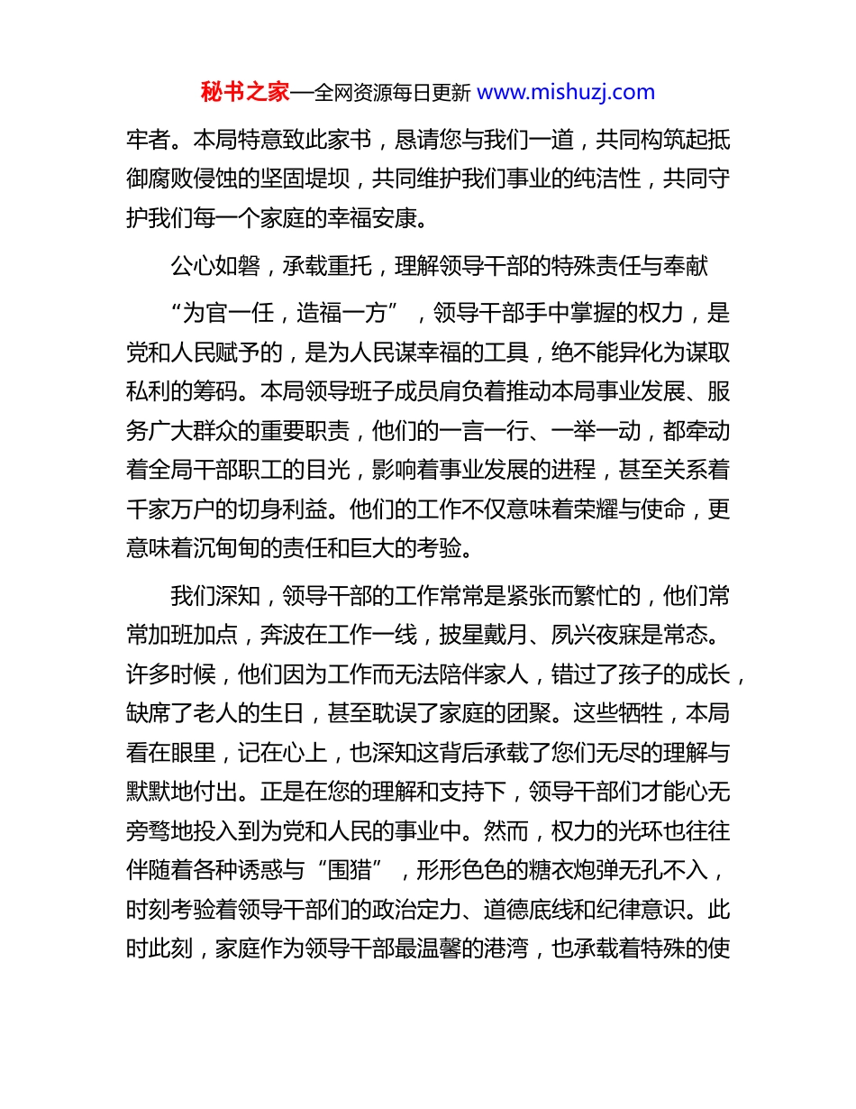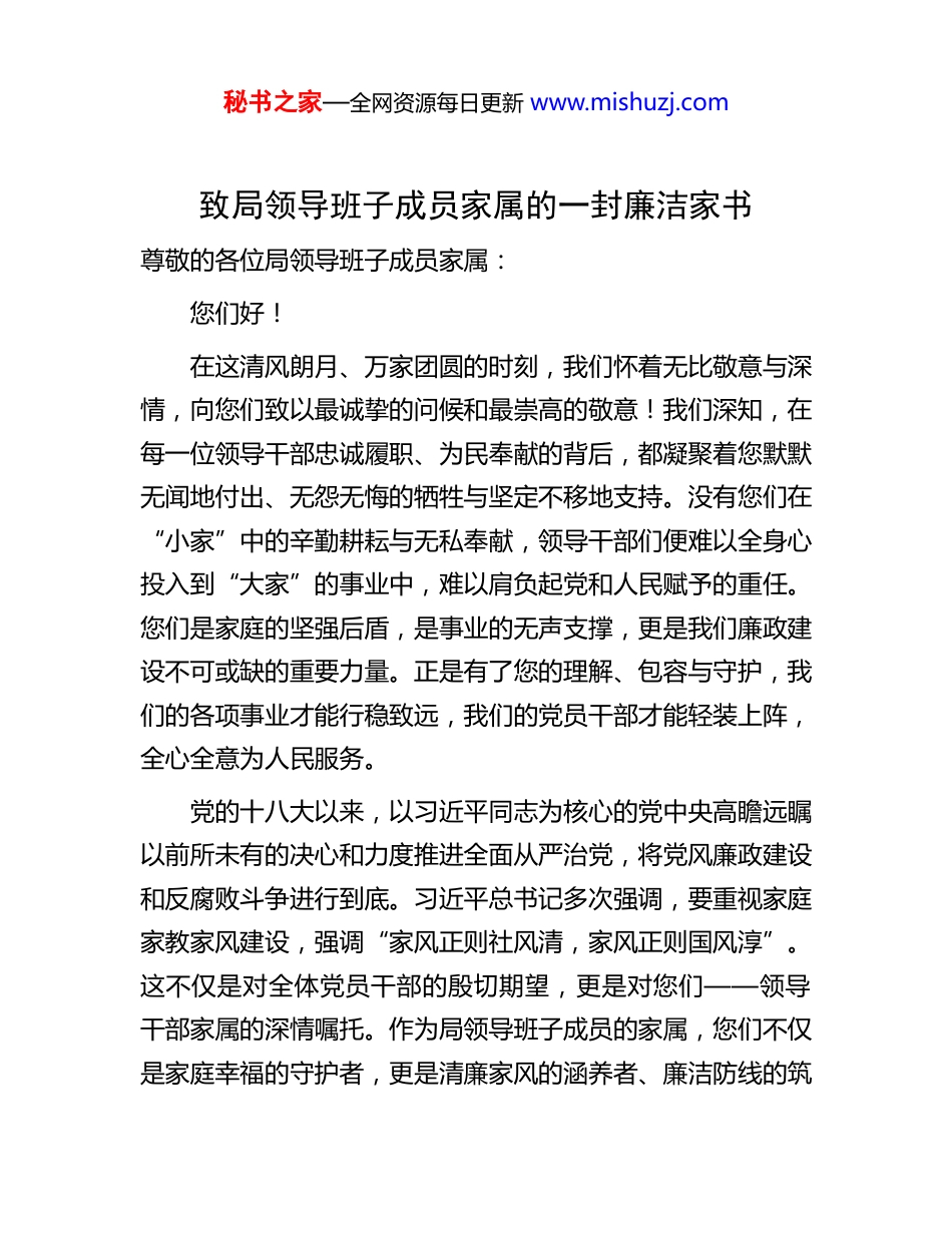 秘书之家—全网资源每日更新 www.mishuzj.com致局领导班子成员家属的一封廉洁家书尊敬的各位局领导班子成员家属:您们好!在这清风朗月、万家团圆的时刻,我们怀着无比敬意与深情,向您们致以最诚挚的问候和最崇高的敬意!我们深知,在每一位领导干部忠诚履职、为民奉献的背后,都凝聚着您默默无闻地付出、无怨无悔的牺牲与坚定不移地支持。没有您们在“小家”中的辛勤耕耘与无私奉献,领导干部们便难以全身心投入到“大家”的事业中,难以肩负起党和人民赋予的重任。您们是家庭的坚强后盾,是事业的无声支撑,更是我们廉政建设不可或缺的重要力量。正是有了您的理解、包容与守护,我们的各项事业才能行稳致远,我们的党员干部才能轻装上阵,全心全意为人民服务。党的十八大以来,以习近平同志为核心的党中央高瞻远瞩以前所未有的决心和力度推进全面从严治党,将党风廉政建设和反腐败斗争进行到底。习近平总书记多次强调,要重视家庭家教家风建设,强调“家风正则社风清,家风正则国风淳”。这不仅是对全体党员干部的殷切期望,更是对您们——领导干部家属的深情嘱托。作为局领导班子成员的家属,您们不仅是家庭幸福的守护者,更是清廉家风的涵养者、廉洁防线的筑秘书之家—全网资源每日更新 www.mishuzj.com牢者。本局特意致此家书,恳请您与我们一道,共同构筑起抵御腐败侵蚀的坚固堤坝,共同维护我们事业的纯洁性,共同守护我们每一个家庭的幸福安康。公心如磐,承载重托,理解领导干部的特殊责任与奉献“为官一任,造福一方”,领导干部手中掌握的权力,是党和人民赋予的,是为人民谋幸福的工具,绝不能异化为谋取私利的筹码。本局领导班子成员肩负着推动本局事业发展、服务广大群众的重要职责,他们的一言一行、一举一动,都牵动着全局干部职工的目光,影响着事业发展的进程,甚至关系着千家万户的切身利益。他们的工作不仅意味着荣耀与使命,更意味着沉甸甸的责任和巨大的考验。我们深知,领导干部的工作常常是紧张而繁忙的,他们常常加班加点,奔波在工作一线,披星戴月、夙兴夜寐是常态。许多时候,他们因为工作而无法陪伴家人,错过了孩子的成长,缺席了老人的生日,甚至耽误了家庭的团聚。这些牺牲,本局看在眼里,记在心上,也深知这背后承载了您们无尽的理解与默默地付出。正是在您的理解和支持下,领导干部们才能心无旁骛地投入到为党和人民的事业中。然而,权力的光环也往往伴随着各种诱惑与“围猎”,形形色色的糖衣炮弹无孔不入,时刻考验着领导干部们的政治定力、道德底线和纪律意识。此时此刻,家庭作为领导干部最温馨的港湾,也承载着特殊的使秘书之家—全网资源每日更新 www.mishuzj.com命,那便是成为他们拒腐防变的“防火墙”和“净化器”。希望您们能深刻认识到领导干部岗位的特殊性与重要性,理解他们所面临的巨大压力与风险,从而以更高的站位、更强的自觉,成为他们廉洁从政的坚实后盾。家风清正,廉洁基石,家庭是拒腐防变的第一道防线常言道:“国有国法,家有家规。”一个家庭的家风,不仅影响着家庭成员的品行修养,更折射出一个民族的精神风貌。对领导干部而言,良好的家风是砥砺品格的“磨刀石”,是抵御诱惑的“防身符”,是清正廉洁的“压舱石”。本局相信,在座的每一位家属,都希望自己的亲人能够清清白白做人、干干净净做事,平平安安度过一生。这不仅是为了家庭的荣辱,更是为了社会的公义。构建廉洁家风,需要您发挥关键作用。一是当好“廉内助”,做守纪律的模范。在日常生活中,希望您时刻提醒自己的亲人,常怀律己之心,常思贪欲之害。当您的亲人面对可能越轨的“人情往来”时,当他们面对可能触犯纪律的“特殊照顾”时,当他们面对可能突破底线的“灰色利益”时,请您毫不犹豫地亮明态度,严词拒绝。一句温情的提醒,一声坚决的告诫,往往能让迷途者悬崖勒马,让清醒者更加坚定。您不仅要坚决抵制任何通过亲人职务影响力谋取不正当利益的行为,更要自觉净化社交圈、生活圈,不给别有用心者提供“围猎”秘书之家—全网资源每日更新 www.mishuzj.com的借口。二是注重言传身教,培养高尚品格。家是最小国,国是千万家。家风是无声的教...