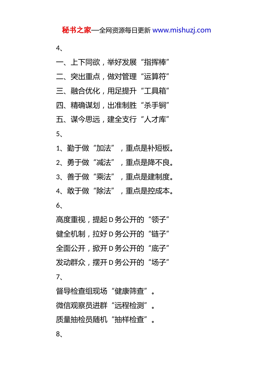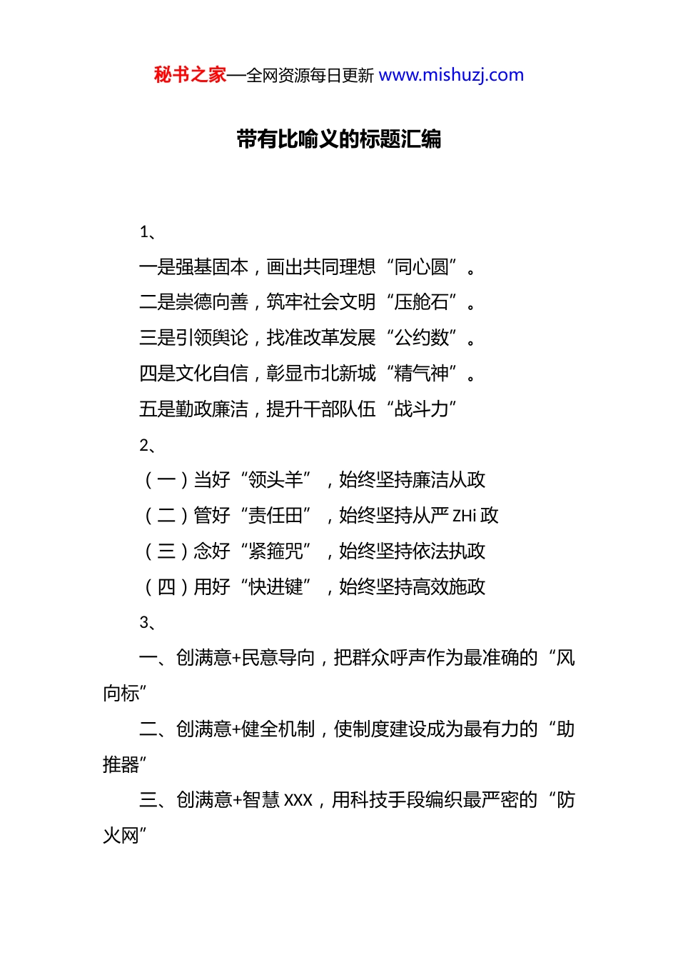 秘书之家—全网资源每日更新 www.mishuzj.com带有比喻义的标题汇编1、一是强基固本,画出共同理想“同心圆”。二是崇德向善,筑牢社会文明“压舱石”。三是引领舆论,找准改革发展“公约数”。四是文化自信,彰显市北新城“精气神”。五是勤政廉洁,提升干部队伍“战斗力”2、(一)当好“领头羊”,始终坚持廉洁从政(二)管好“责任田”,始终坚持从严 ZHi 政(三)念好“紧箍咒”,始终坚持依法执政(四)用好“快进键”,始终坚持高效施政3、一、创满意+民意导向,把群众呼声作为最准确的“风向标”二、创满意+健全机制,使制度建设成为最有力的“助推器”三、创满意+智慧 XXX,用科技手段编织最严密的“防火网”秘书之家—全网资源每日更新 www.mishuzj.com4、一、上下同欲,举好发展“指挥棒”二、突出重点,做对管理“运算符”三、融合优化,用足提升“工具箱”四、精确谋划,出准制胜“杀手锏”五、谋今思远,建全支行“人才库”5、1、勤于做“加法”,重点是补短板。2、勇于做“减法”,重点是降不良。3、善于做“乘法”,重点是建制度。4、敢于做“除法”,重点是控成本。6、高度重视,提起 D 务公开的“领子”健全机制,拉好 D 务公开的“链子”全面公开,掀开 D 务公开的“底子”发动群众,摆开 D 务公开的“场子”7、督导检查组现场“健康筛查”。微信观察员进群“远程检测”。质量抽检员随机“抽样检查”。8、秘书之家—全网资源每日更新 www.mishuzj.com开好分类施策“药方”。照好先进典型“镜子”。搭建以学促做“平台”。9、“正气”,就是有共产 D 员的本色。“帅气”,就是要注重形象。“底气”,要处事不惊、沉着冷静。“灵气”,要开动脑筋、灵活创新。10、一、创新选拔机制,解决好“选准”的问题。二、完善培训机制,解决好“提高”的问题。三、健全管理机制,解决好“稳定”的问题。四、强化激励机制,解决好“尽心”的问题。11、一、在因地制宜、便于组织中突出“野味”。二、在营造氛围、紧贴实际中催生“战味”。三、在丰富形式、与时俱进中增强“趣味”。四、在积极探索、推动发展中提升“品味”。12、一、深入教育引导,让官兵“用心”学。二、聚焦使命任务,让官兵“融入”学。秘书之家—全网资源每日更新 www.mishuzj.com三、广泛开展活动,让官兵“多样”学。四、建立长效机制,让官兵“常态”学。13、一、坚持在“系统化”领悟中把握精髓要义。二、坚持在“精准化”组学中增强落实效果。三、坚持在“通俗化”解读中抓好平台对接。四、坚持在“具体化”践行中促进深化转化。14、一、开设“阳光”课堂,让教育灌输“活”起来。二、搭建“阳光”舞台,让主题活动“潮”起来。三、培育“阳光”心态,让健康心理“亮”起来。四、营造“阳光”氛围,让内部风气“纯”起来。15、一、坚持思想领先,从战略高度过好网络“认知关”。二、坚持打牢基础,以信息主导过好网络“建设关”。三、坚持需求牵引,靠创新驱动过好网络“应用关”。四、坚持抓长抓常,靠管用举措过好网络“常态关”。16、一、以战为魂引领,把“今夜就战”的思想立起来。二、实践培塑催生,把“备战打仗”的斗志鼓起来。三、点滴养成磨砺,把“冲拼硬上”的血性强起来。秘书之家—全网资源每日更新 www.mishuzj.com四、强军文化涵养,把“亮剑决胜”的士气提起来。17、一、分层分类“查”,把查纠整改的靶子树起来。二、深挖深究“问”,把自觉整改的 D 性强起来。三、入情入理“讲”,把预期整改的标准立起来。四、全员全程“晒”,把具体整改的措施严起来。五、立言立行“做”,把履职整改的行动实起来。18、一、扭住“思想稳控”这个根本,为改革凝神聚气。二、聚焦“素质升级”这个关键,为改革蓄能攒劲。三、突出“选拔使用”这个导向,为改革助力增效。四、拧紧“管理监督”这个重点,为改革保驾护航。19、用“心”抓基层风气一、用“真心”感召官兵,把纯正风气的思想根植好。二、用“热心”服务官兵,把后顾之忧的问题解决好。三、用“公心”取信官兵,把风清气正的环境营造好。20、系统学习打牢理论大厦“根基”。区分层次搭建理论大厦“构架”。丰富形...