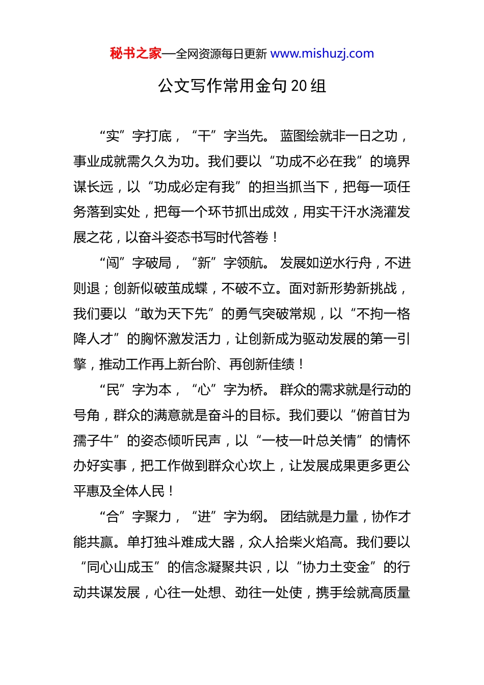 秘书之家—全网资源每日更新 www.mishuzj.com公文写作常用金句 20 组 “实”字打底,“干”字当先。 蓝图绘就非一日之功,事业成就需久久为功。我们要以“功成不必在我”的境界谋长远,以“功成必定有我”的担当抓当下,把每一项任务落到实处,把每一个环节抓出成效,用实干汗水浇灌发展之花,以奋斗姿态书写时代答卷!“闯”字破局,“新”字领航。 发展如逆水行舟,不进则退;创新似破茧成蝶,不破不立。面对新形势新挑战,我们要以“敢为天下先”的勇气突破常规,以“不拘一格降人才”的胸怀激发活力,让创新成为驱动发展的第一引擎,推动工作再上新台阶、再创新佳绩!“民”字为本,“心”字为桥。 群众的需求就是行动的号角,群众的满意就是奋斗的目标。我们要以“俯首甘为孺子牛”的姿态倾听民声,以“一枝一叶总关情”的情怀办好实事,把工作做到群众心坎上,让发展成果更多更公平惠及全体人民!“合”字聚力,“进”字为纲。 团结就是力量,协作才能共赢。单打独斗难成大器,众人拾柴火焰高。我们要以“同心山成玉”的信念凝聚共识,以“协力土变金”的行动共谋发展,心往一处想、劲往一处使,携手绘就高质量秘书之家—全网资源每日更新 www.mishuzj.com发展的壮美画卷!“拼”字当头,“赢”字为果。 幸福都是奋斗出来的,成绩都是拼搏出来的。机遇稍纵即逝,发展刻不容缓。我们要以“只争朝夕”的紧迫感抢抓机遇,以“舍我其谁”的使命感担当作为,用汗水浇灌收获,以实干笃定前行,赢得主动、赢得未来!“稳”字托底,“安”字为先。 安全是发展的前提,稳定是繁荣的基石。风险无处不在,防控刻不容缓。我们要以“如履薄冰”的谨慎防范风险,以“未雨绸缪”的远见化解隐患,筑牢安全防线,守住稳定底线,为高质量发展保驾护航!“绿”字点睛,“美”字升华。 生态是最大的优势,绿色是最亮的底色。发展不能以牺牲环境为代价,转型必须坚持绿色导向。我们要以“功在当代”的担当保护环境,以“利在千秋”的情怀推动转型,让天更蓝、山更绿、水更清,绘就美丽中国的生动图景!“法”字立规,“治”字兴业。 法治是发展的保障,公平是社会的基石。没有规矩不成方圆,无法治则无长治久安。我们要以“法不阿贵”的公正严明执法,以“民惟邦本”的情怀服务群众,让法治成为高质量发展的鲜明底色!秘书之家—全网资源每日更新 www.mishuzj.com“才”字为本,“强”字为要。 人才是第一资源,创新是第一动力。得人才者得天下,失人才者失未来。我们要以“伯乐相马”的眼光发现人才,以“筑巢引凤”的诚意留住人才,让各类人才竞相涌现,为事业发展提供强劲支撑!“文”字铸魂,“化”字育人。 文化是民族的根脉,自信是前行的力量。没有文化的繁荣,就没有民族的复兴。我们要以“传承千年文脉”的责任感弘扬传统,以“创新时代表达”的使命感推动发展,让文化软实力成为硬支撑!“责”字千钧,“行”字为诺。 责任重于泰山,行动胜于空谈。承诺不是口号,而是担当;任务不是数字,而是使命。我们要以“言必信、行必果”的态度兑现承诺,以“抓铁有痕、踏石留印”的劲头狠抓落实,确保各项部署落地生根、开花结果!“变”字为机,“创”字为魂。 变革孕育机遇,创新决定未来。固步自封只会落后,与时俱进方能领先。我们要以“破旧立新”的勇气推进改革,以“敢为人先”的魄力开拓创新,让变革成为发展的动力源,让创新成为时代的最强音!“联”字聚能,“通”字达效。 联动才能共赢,通畅方秘书之家—全网资源每日更新 www.mishuzj.com能高效。单丝不成线,独木不成林。我们要以“互联互通”的理念打破壁垒,以“协同协作”的机制整合资源,让信息更畅通、让合作更紧密、让发展更高效!“精”字求质,“细”字致远。 精细决定品质,细节成就完美。粗枝大叶难成大器,精益求精方能致远。我们要以“工匠精神”的态度打磨工作,以“绣花功夫”的细致提升质量,让每一项成果都经得起实践和历史的检验!“诚”字立信,“信”字兴商。 诚信是立身之本,信誉是发展之基。无信不立,无诚不远。我们要以“一诺千金”的品格赢得信任,以“童叟无欺”的原则规范行为,...