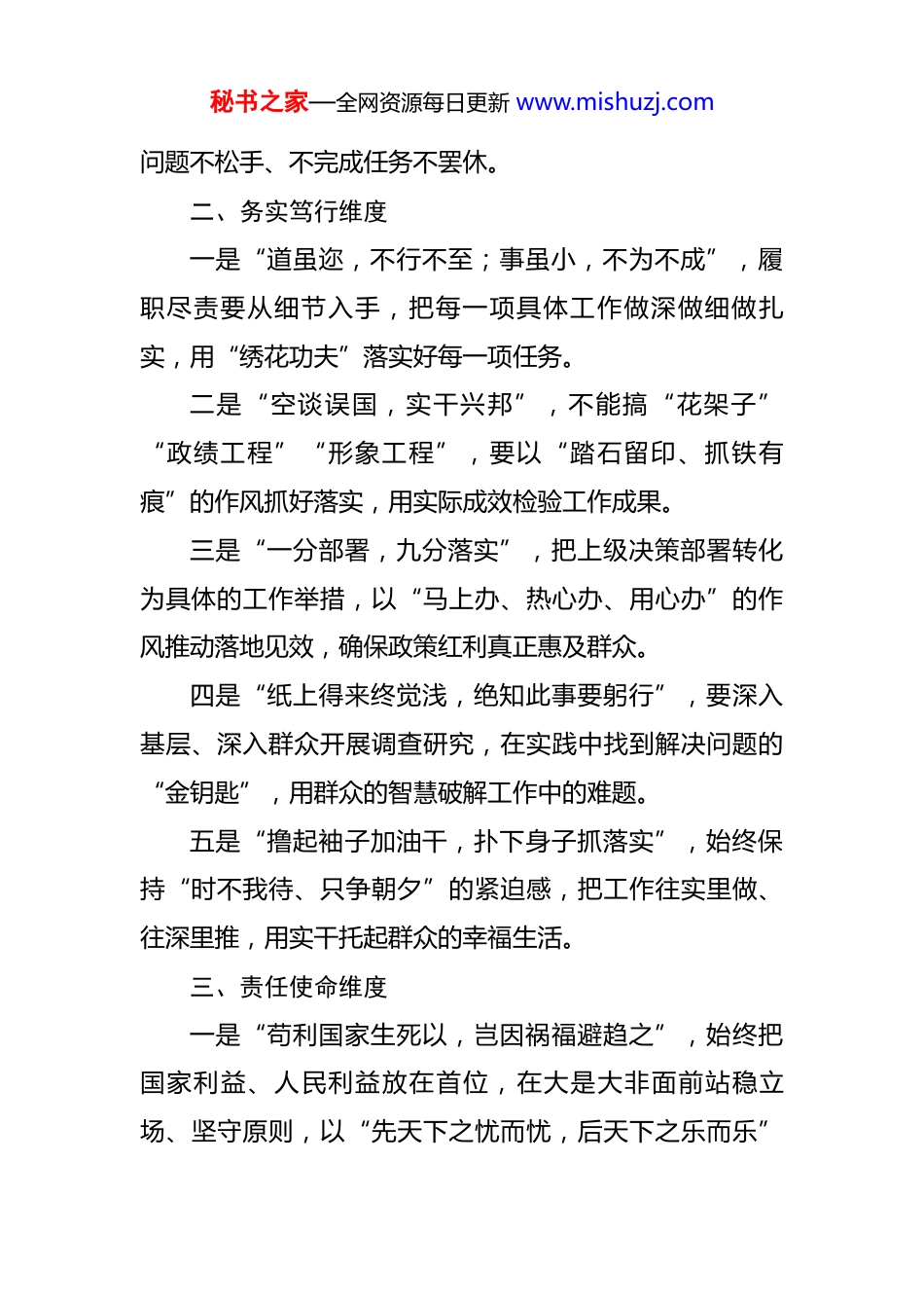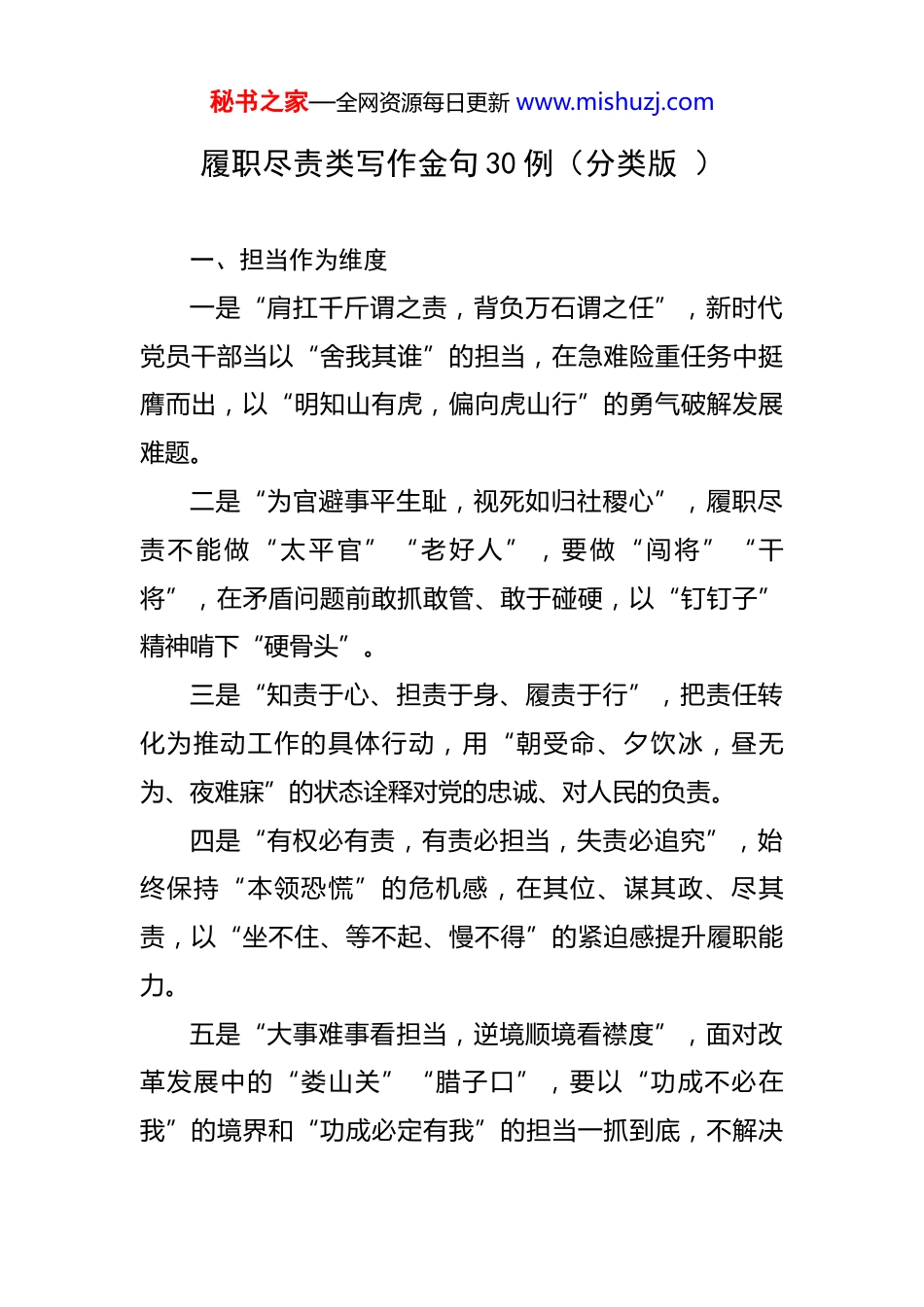 秘书之家—全网资源每日更新 www.mishuzj.com履职尽责类写作金句 30 例(分类版 )一、担当作为维度一是“肩扛千斤谓之责,背负万石谓之任”,新时代党员干部当以“舍我其谁”的担当,在急难险重任务中挺膺而出,以“明知山有虎,偏向虎山行”的勇气破解发展难题。二是“为官避事平生耻,视死如归社稷心”,履职尽责不能做“太平官”“老好人”,要做“闯将”“干将”,在矛盾问题前敢抓敢管、敢于碰硬,以“钉钉子”精神啃下“硬骨头”。三是“知责于心、担责于身、履责于行”,把责任转化为推动工作的具体行动,用“朝受命、夕饮冰,昼无为、夜难寐”的状态诠释对党的忠诚、对人民的负责。四是“有权必有责,有责必担当,失责必追究”,始终保持“本领恐慌”的危机感,在其位、谋其政、尽其责,以“坐不住、等不起、慢不得”的紧迫感提升履职能力。五是“大事难事看担当,逆境顺境看襟度”,面对改革发展中的“娄山关”“腊子口”,要以“功成不必在我”的境界和“功成必定有我”的担当一抓到底,不解决秘书之家—全网资源每日更新 www.mishuzj.com问题不松手、不完成任务不罢休。二、务实笃行维度一是“道虽迩,不行不至;事虽小,不为不成”,履职尽责要从细节入手,把每一项具体工作做深做细做扎实,用“绣花功夫”落实好每一项任务。二是“空谈误国,实干兴邦”,不能搞“花架子”“政绩工程”“形象工程”,要以“踏石留印、抓铁有痕”的作风抓好落实,用实际成效检验工作成果。三是“一分部署,九分落实”,把上级决策部署转化为具体的工作举措,以“马上办、热心办、用心办”的作风推动落地见效,确保政策红利真正惠及群众。四是“纸上得来终觉浅,绝知此事要躬行”,要深入基层、深入群众开展调查研究,在实践中找到解决问题的“金钥匙”,用群众的智慧破解工作中的难题。五是“撸起袖子加油干,扑下身子抓落实”,始终保持“时不我待、只争朝夕”的紧迫感,把工作往实里做、往深里推,用实干托起群众的幸福生活。三、责任使命维度一是“苟利国家生死以,岂因祸福避趋之”,始终把国家利益、人民利益放在首位,在大是大非面前站稳立场、坚守原则,以“先天下之忧而忧,后天下之乐而乐”秘书之家—全网资源每日更新 www.mishuzj.com的情怀履行职责。二是“心中有信仰,脚下有力量”,以习近平新时代中国特色社会主义思想为指引,把责任使命融入到日常工作的方方面面,用信仰之力推动工作高质量发展。三是“我将无我,不负人民”,始终保持对人民的赤子之心,把为人民服务作为履职尽责的出发点和落脚点,用“全心全意为人民服务”的宗旨意识践行初心使命。四是“位卑未敢忘忧国”,无论岗位大小、职位高低,都要以强烈的使命感做好本职工作,为党和人民的事业贡献自己的一份力量,用平凡岗位书写不平凡的人生。五是“使命在肩,奋斗有我”,把个人的理想追求融入到中华民族伟大复兴的中国梦之中,用奋斗书写履职尽责的精彩篇章,用汗水浇灌出事业的丰硕成果。四、群众导向维度一是“些小吾曹州县吏,一枝一叶总关情”,始终把群众的“小事”当作“大事”来办,切实解决群众的急难愁盼问题,用“把群众的事当成自己的事”的态度温暖群众的心。二是“群众利益无小事,民生问题大于天”,以“群众满不满意、高不高兴、答应不答应”作为衡量工作成效的标准,用“群众的笑脸”检验工作的好坏。秘书之家—全网资源每日更新 www.mishuzj.com三是“从群众中来,到群众中去”,深入了解群众的需求和愿望,把群众的智慧和力量转化为推动工作的动力,用“问计于民、问需于民”的方法提升工作的针对性。四是“民之所盼,政之所向”,聚焦群众关心的教育、医疗、就业、养老等问题,拿出实实在在的举措,让群众有更多获得感、幸福感、安全感,用“看得见、摸得着”的变化回应群众的期待。五是“脚下沾有多少泥土,心中就沉淀多少真情”,多到基层一线走一走、看一看,在与群众的交流中增进感情、提升能力,用“接地气、通下情”的工作作风赢得群众的信任。五、实干实效维度一是“以实则治,以文则不治”,拒绝“文牍主义”“形式主义”,要以实实在在的工作成效检验履职尽责的成果...